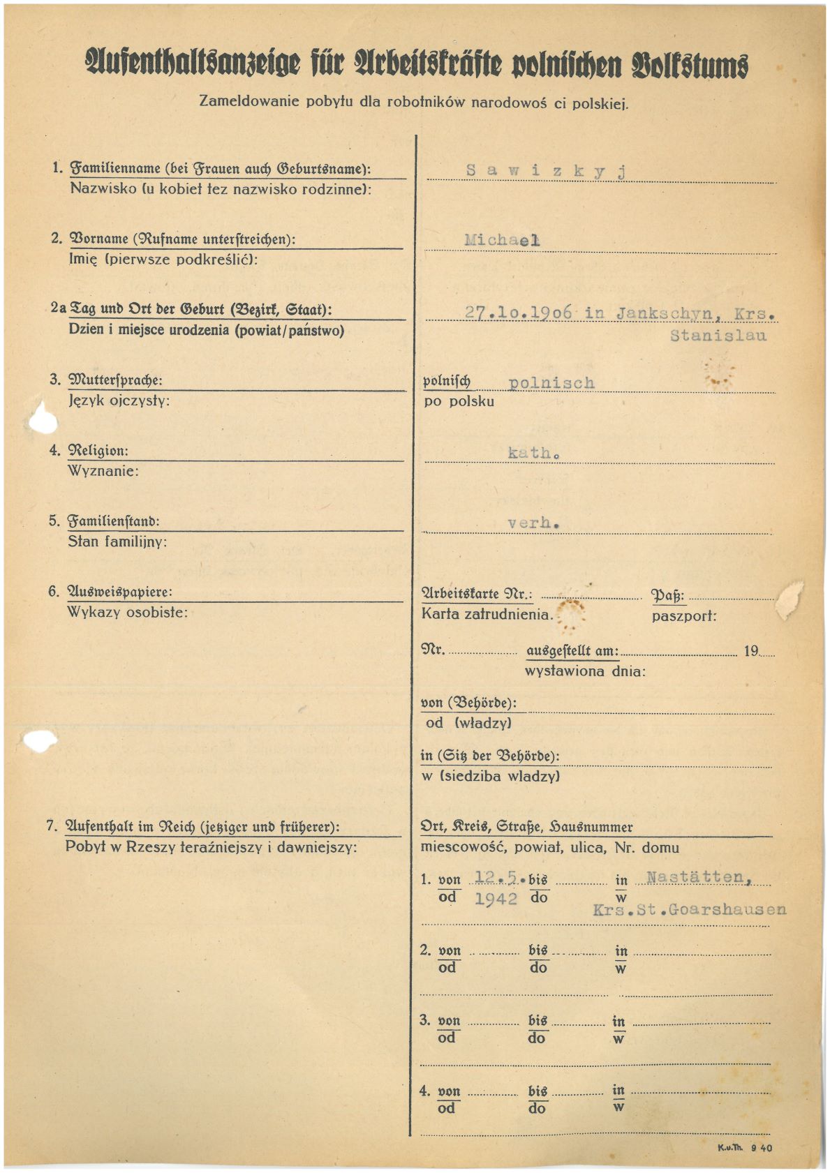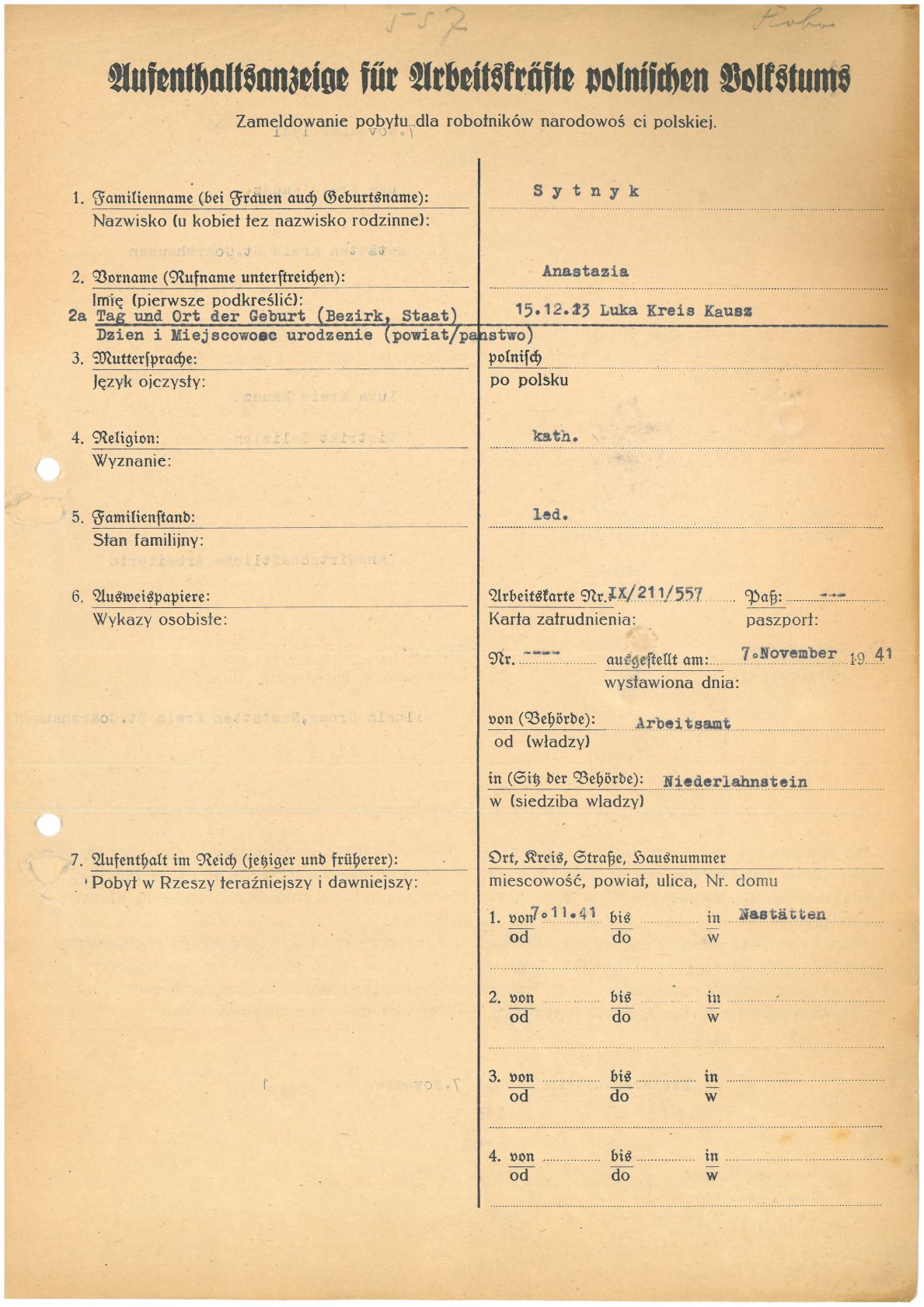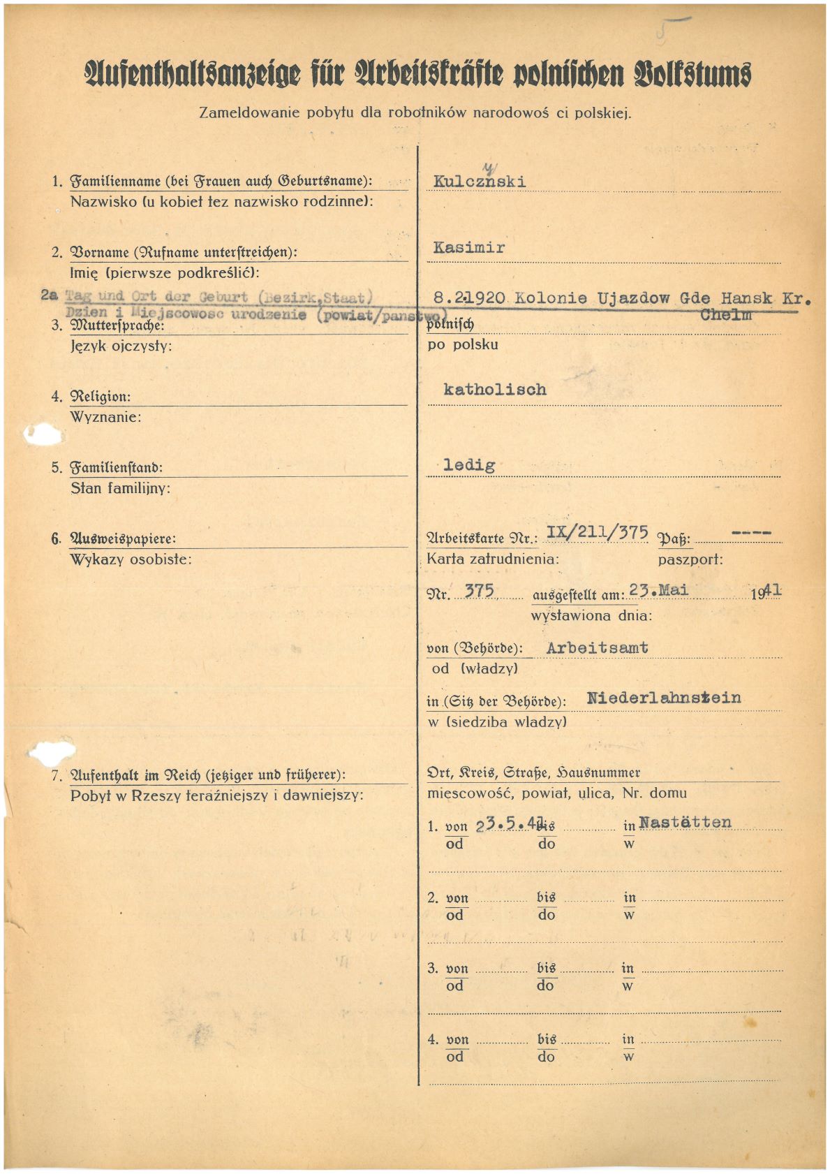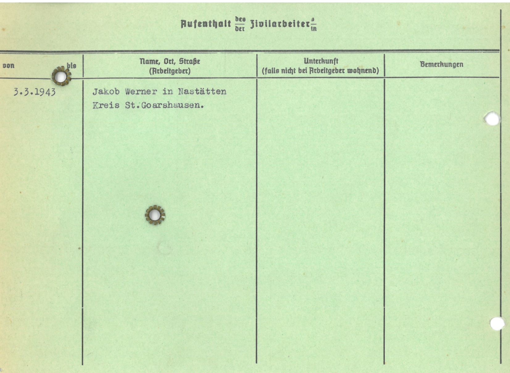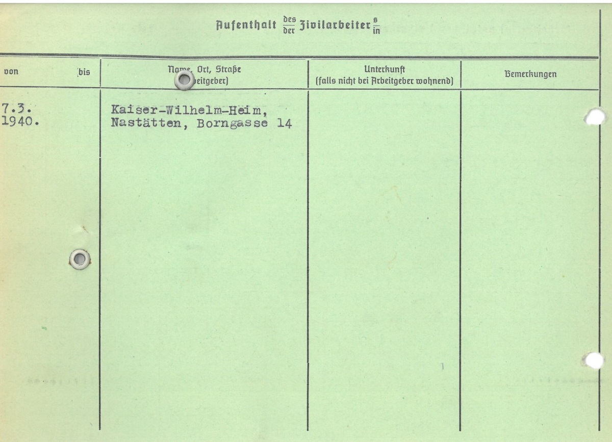 Im Oktober 1939 wurde die Einführung der Arbeitspflicht für Polen zwischen dem 18. und 60. Lebensjahr verordnet. Ab Sommer 1941 wurden die Zwangsarbeitsmaßnahmen auch auf den sowjetisch besetzen Teil Polens übertragen. Mehr und mehr wurden auch Jugendliche und selbst Kinder zur Zwangsarbeit herangezogen. Im Oktober 1940 arbeiteten in der deutschen Landwirtschaft etwa 400.000, in der Industrie rund 140.000 sogenannte Zivilarbeiter aus Polen und Sowjetrussland. Auch in Nastätten wurden Zivilarbeiter überwiegend in der Landwirtschaft eingesetzt. Finden sie Aufenthaltsbescheinigungen und Ausweise der in Nastätten eingesetzten Zivilarbeiter.