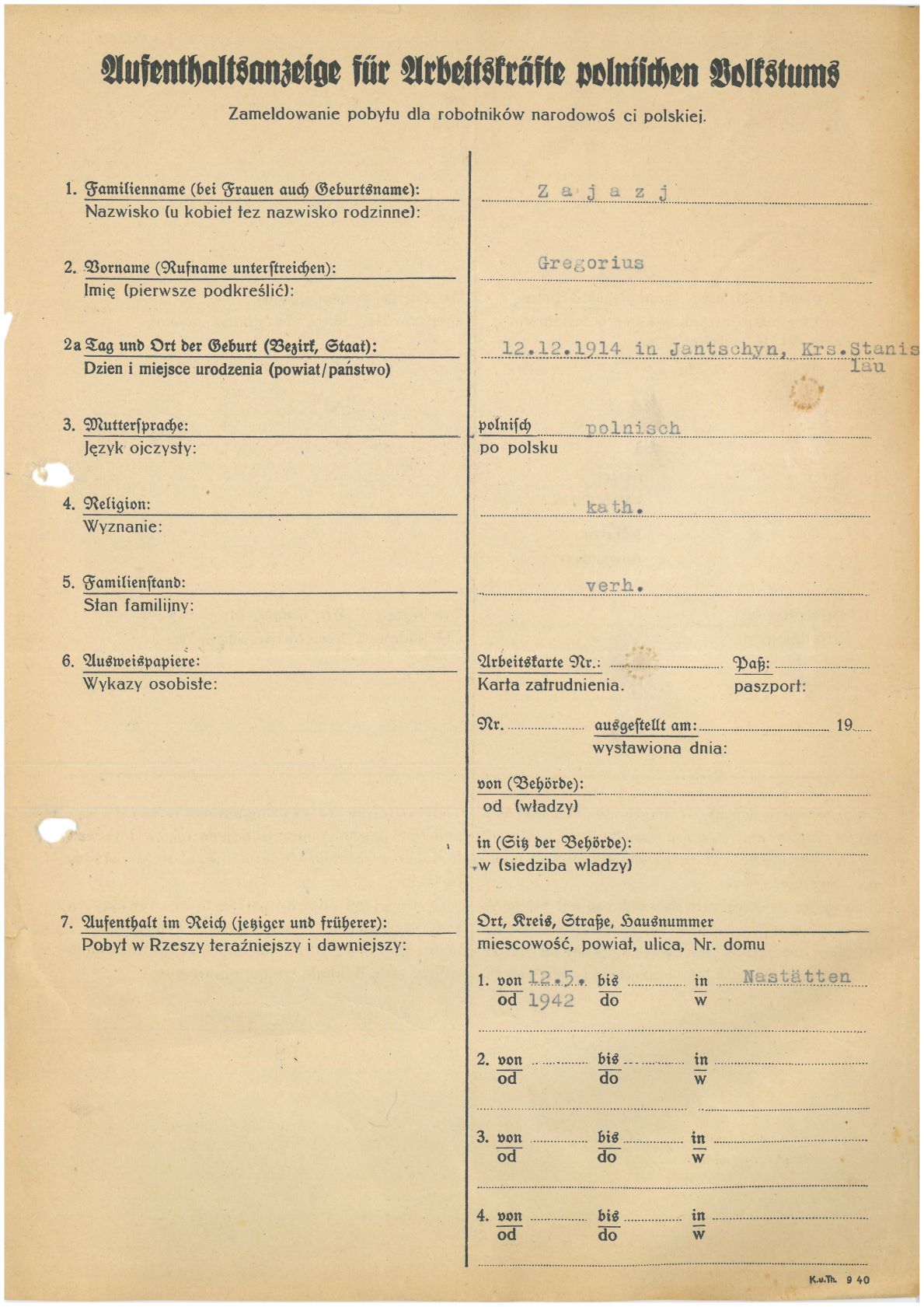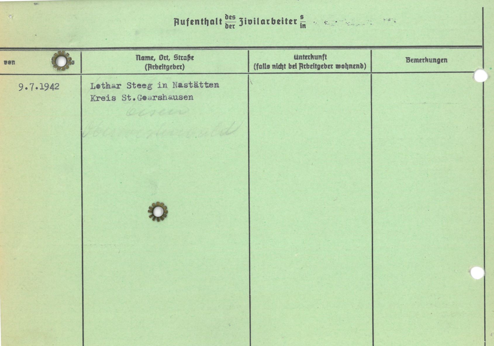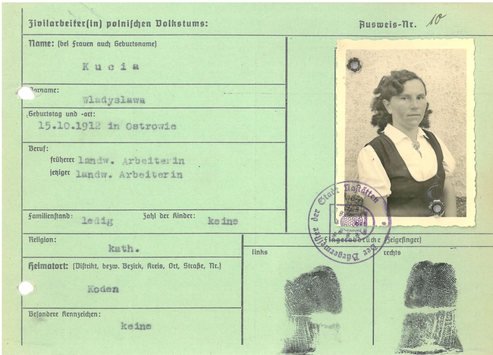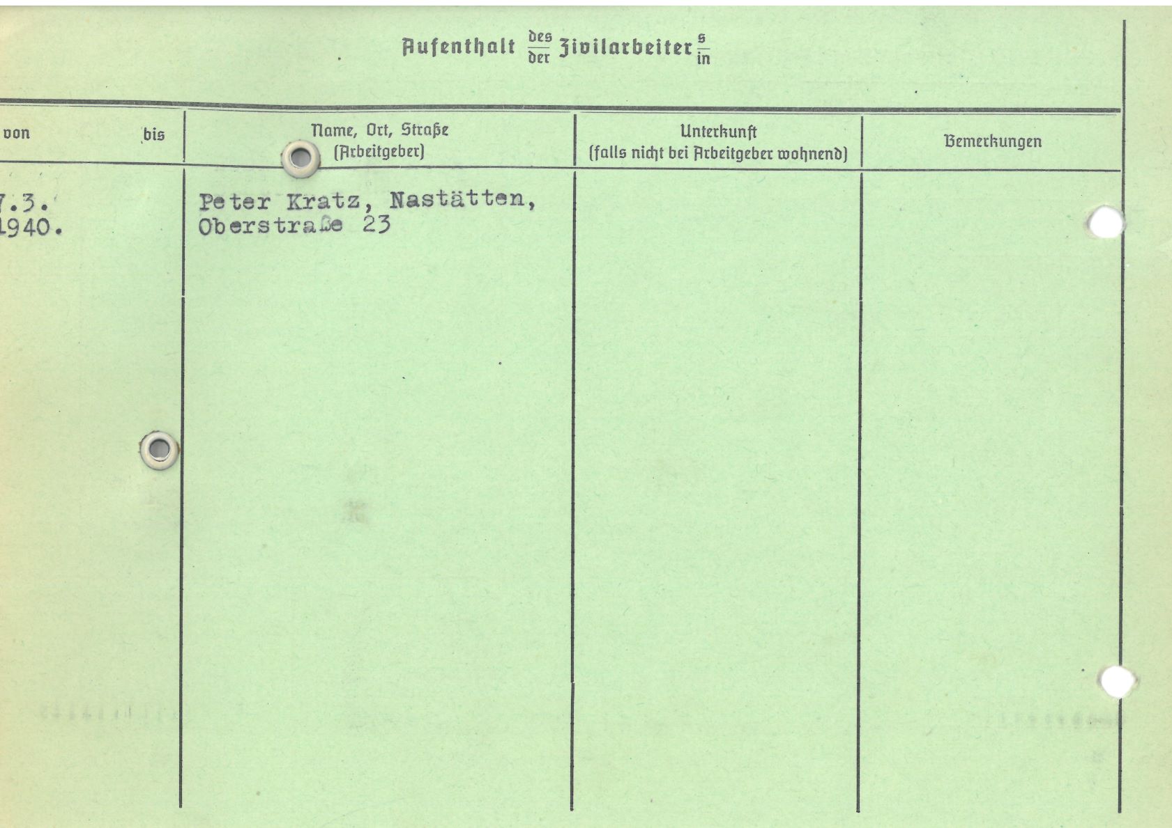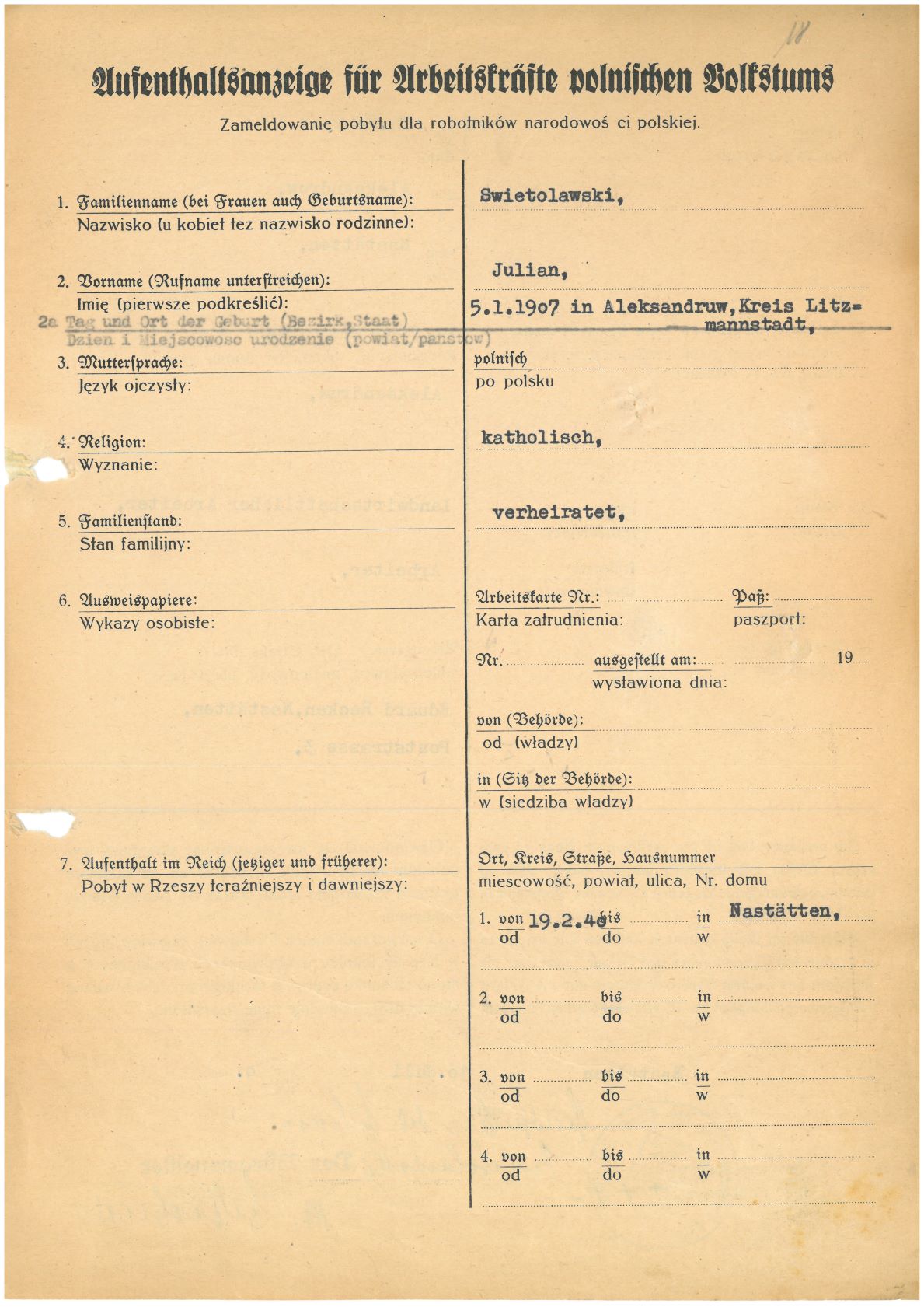 Im Oktober 1939 wurde die Einführung der Arbeitspflicht für Polen zwischen dem 18. und 60. Lebensjahr verordnet. Ab Sommer 1941 wurden die Zwangsarbeitsmaßnahmen auch auf den sowjetisch besetzen Teil Polens übertragen. Mehr und mehr wurden auch Jugendliche und selbst Kinder zur Zwangsarbeit herangezogen. Im Oktober 1940 arbeiteten in der deutschen Landwirtschaft etwa 400.000, in der Industrie rund 140.000 sogenannte Zivilarbeiter aus Polen und Sowjetrussland. Auch in Nastätten wurden Zivilarbeiter überwiegend in der Landwirtschaft eingesetzt. Finden sie Aufenthaltsbescheinigungen und Ausweise der in Nastätten eingesetzten Zivilarbeiter.