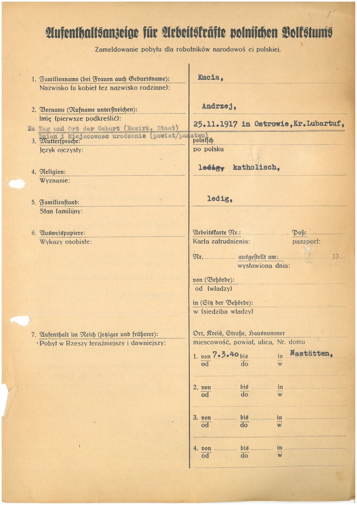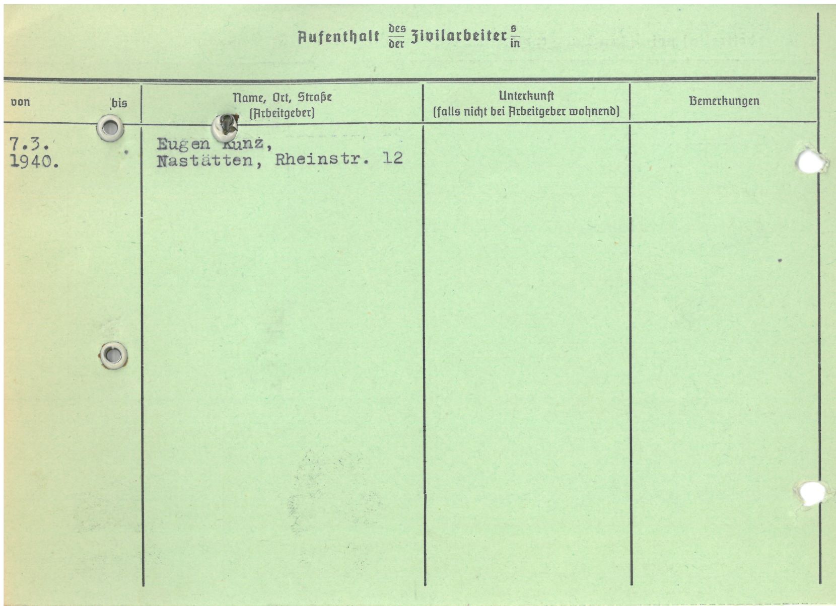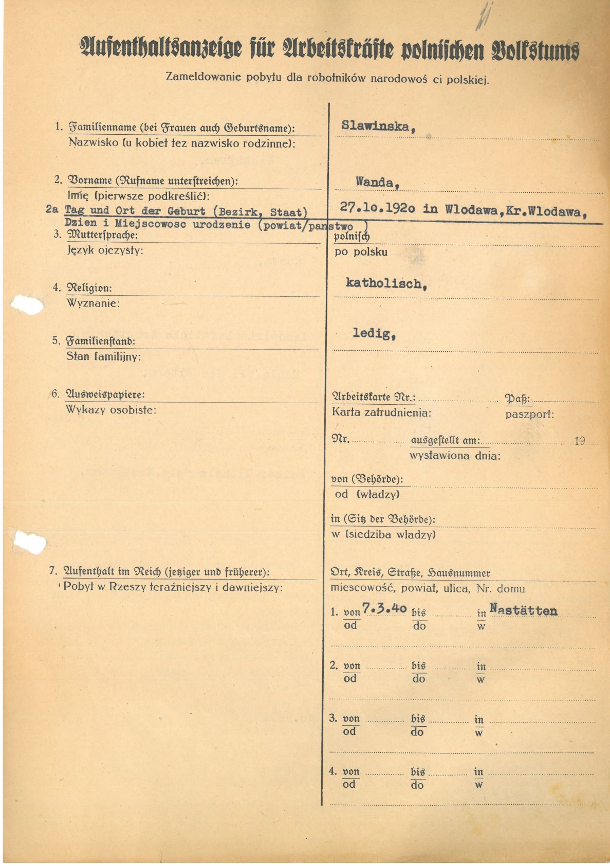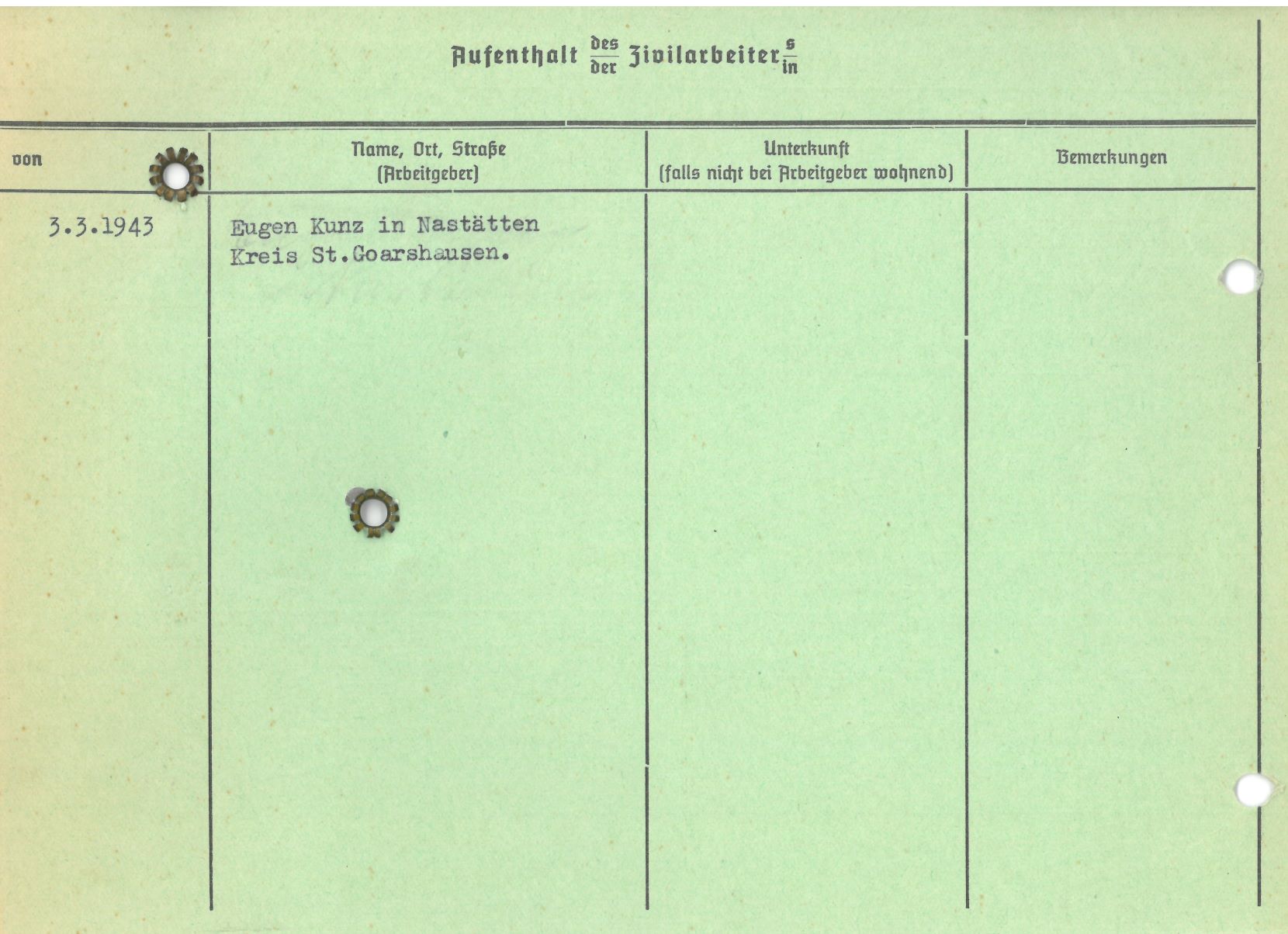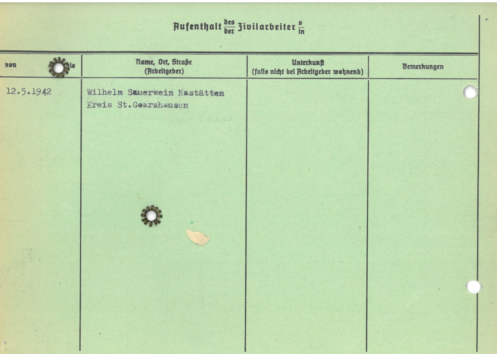 Im Oktober 1939 wurde die Einführung der Arbeitspflicht für Polen zwischen dem 18. und 60. Lebensjahr verordnet. Ab Sommer 1941 wurden die Zwangsarbeitsmaßnahmen auch auf den sowjetisch besetzen Teil Polens übertragen. Mehr und mehr wurden auch Jugendliche und selbst Kinder zur Zwangsarbeit herangezogen. Im Oktober 1940 arbeiteten in der deutschen Landwirtschaft etwa 400.000, in der Industrie rund 140.000 sogenannte Zivilarbeiter aus Polen und Sowjetrussland. Auch in Nastätten wurden Zivilarbeiter überwiegend in der Landwirtschaft eingesetzt. Finden sie Aufenthaltsbescheinigungen und Ausweise der in Nastätten eingesetzten Zivilarbeiter.
