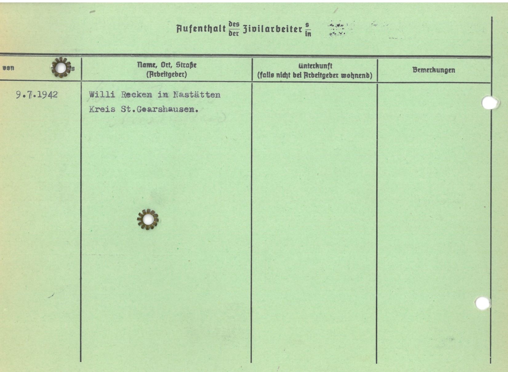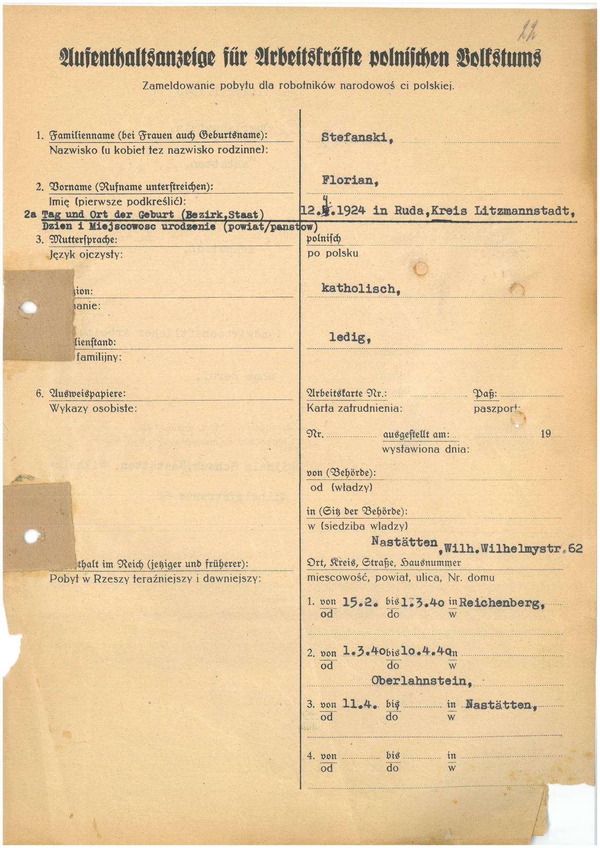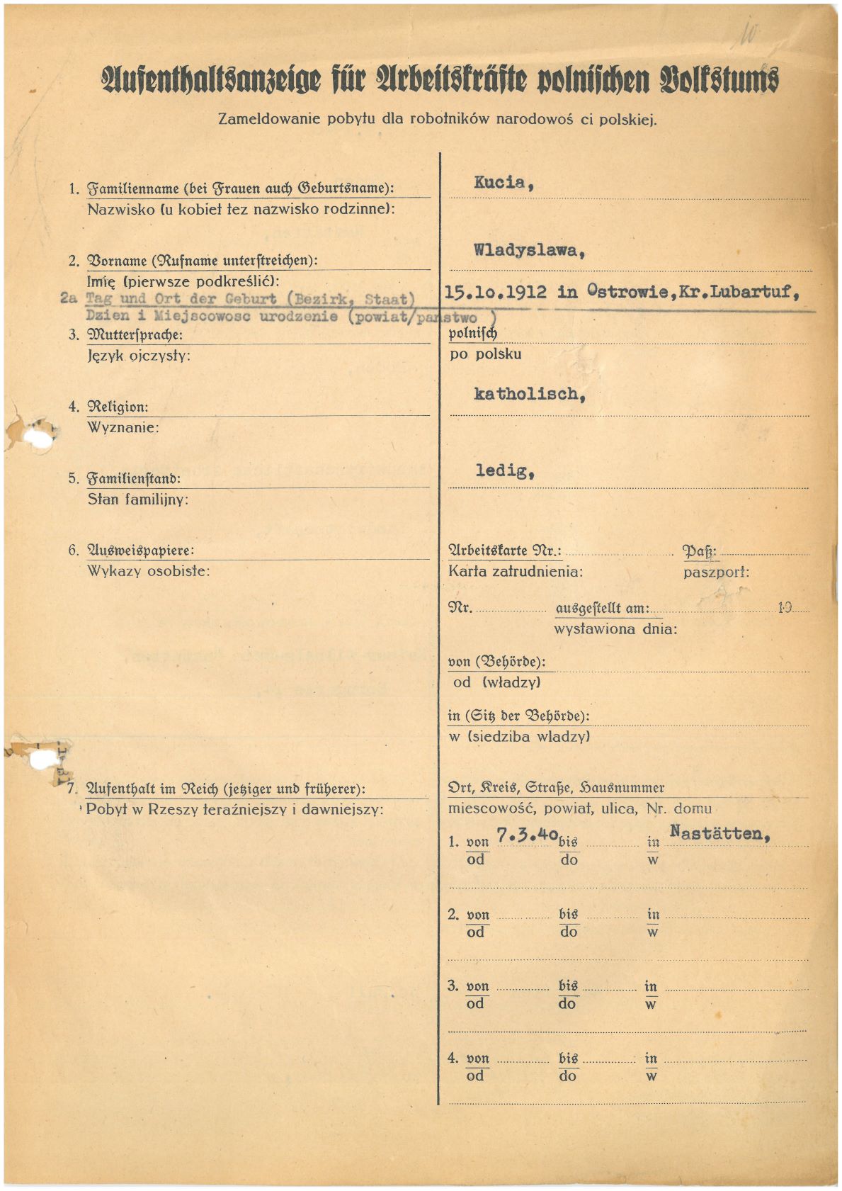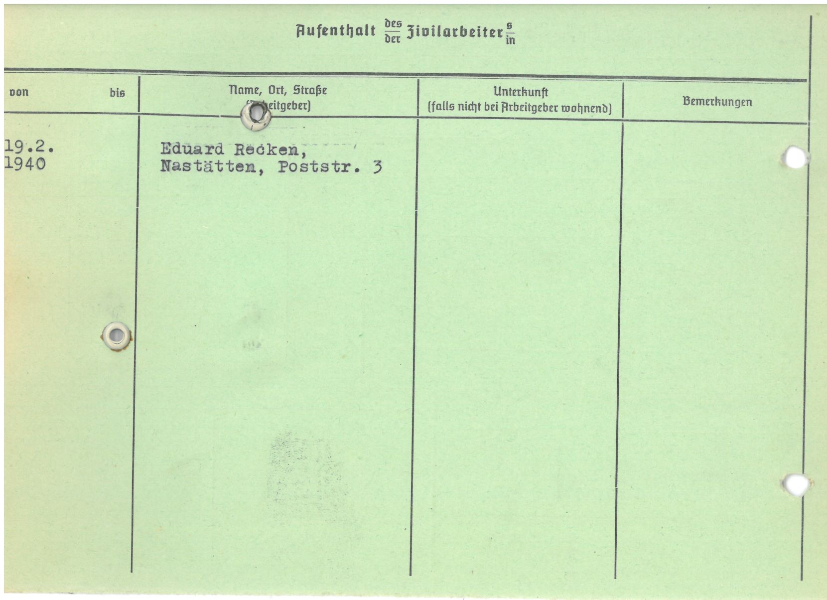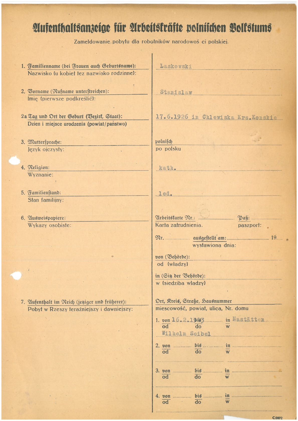 Im Oktober 1939 wurde die Einführung der Arbeitspflicht für Polen zwischen dem 18. und 60. Lebensjahr verordnet. Ab Sommer 1941 wurden die Zwangsarbeitsmaßnahmen auch auf den sowjetisch besetzen Teil Polens übertragen. Mehr und mehr wurden auch Jugendliche und selbst Kinder zur Zwangsarbeit herangezogen. Im Oktober 1940 arbeiteten in der deutschen Landwirtschaft etwa 400.000, in der Industrie rund 140.000 sogenannte Zivilarbeiter aus Polen und Sowjetrussland. Auch in Nastätten wurden Zivilarbeiter überwiegend in der Landwirtschaft eingesetzt. Finden sie Aufenthaltsbescheinigungen und Ausweise der in Nastätten eingesetzten Zivilarbeiter.