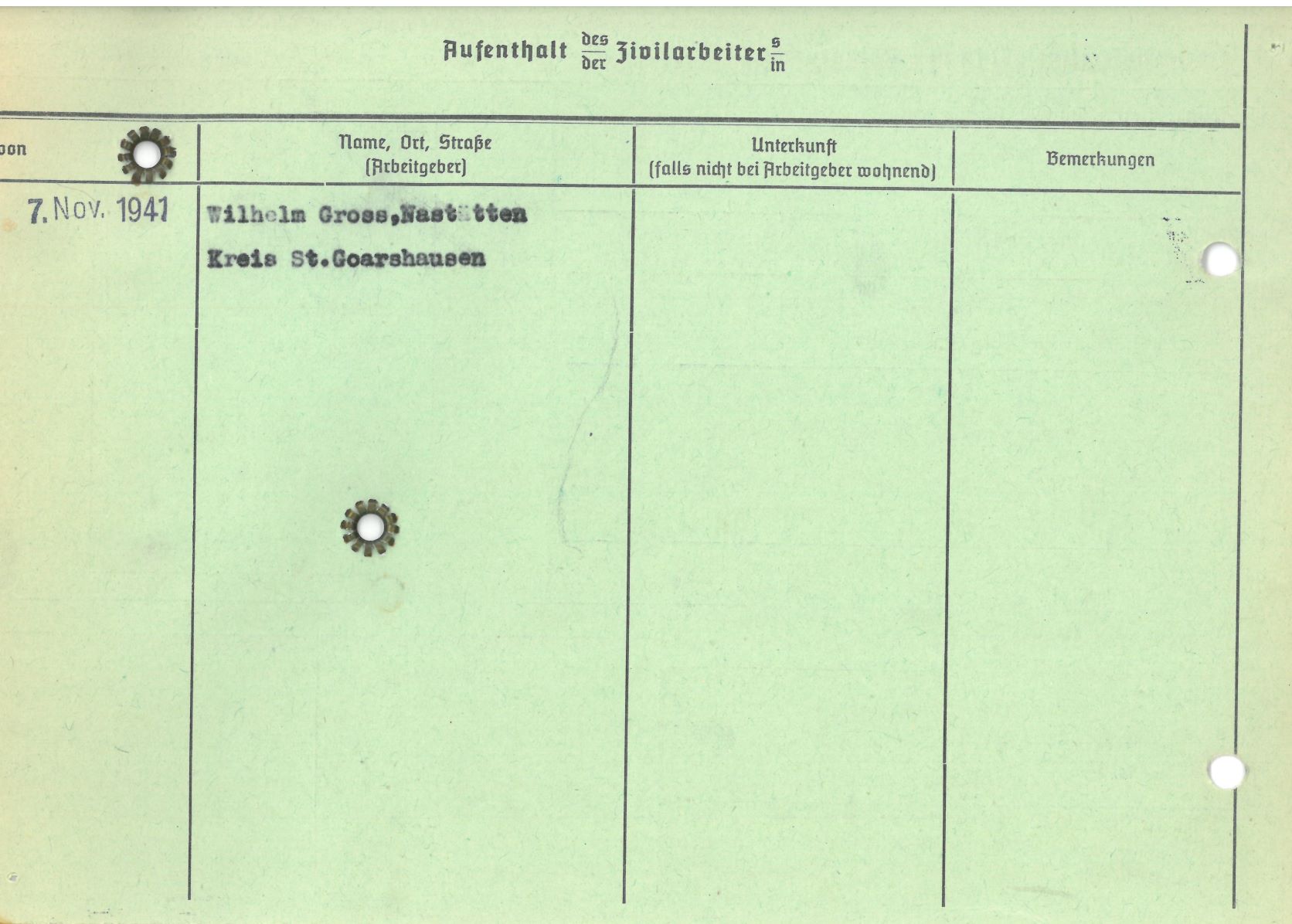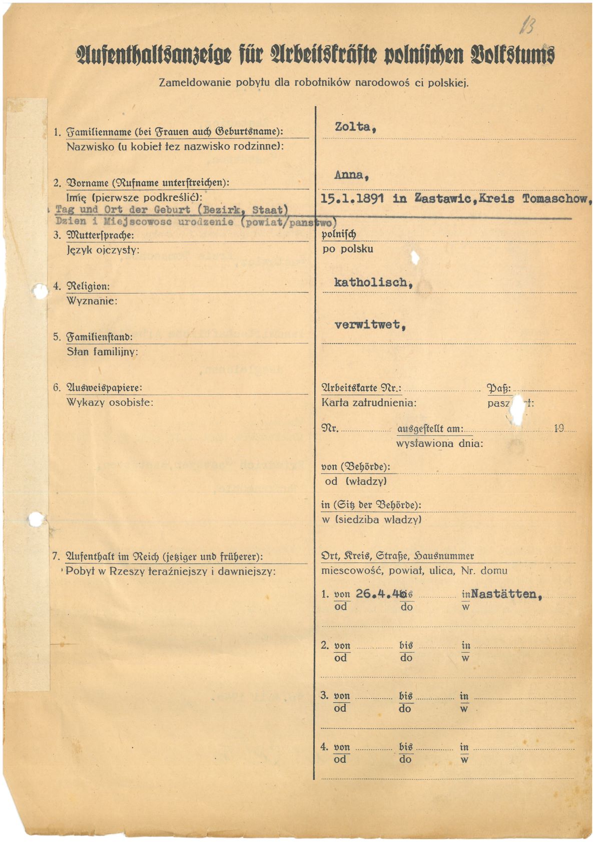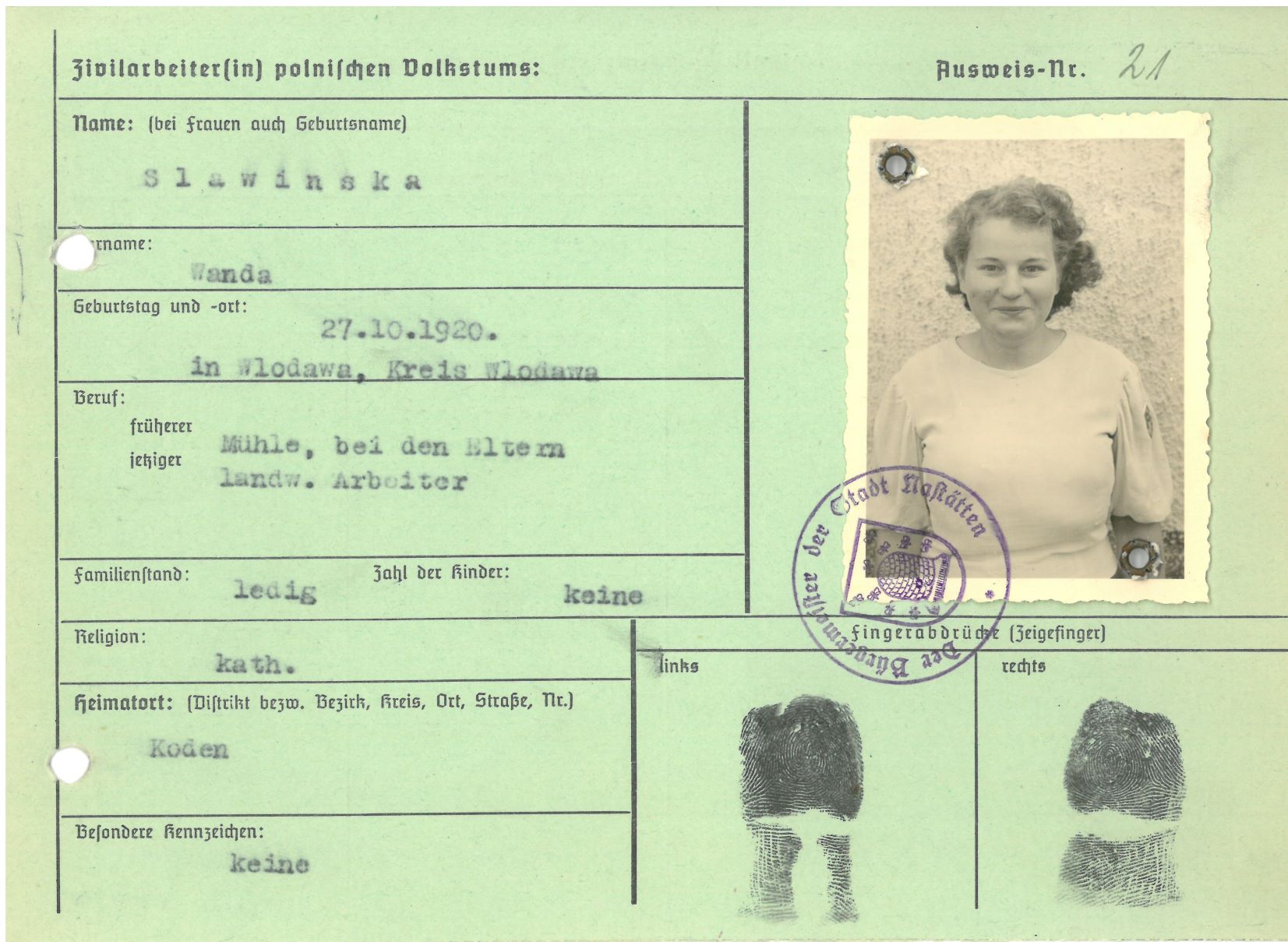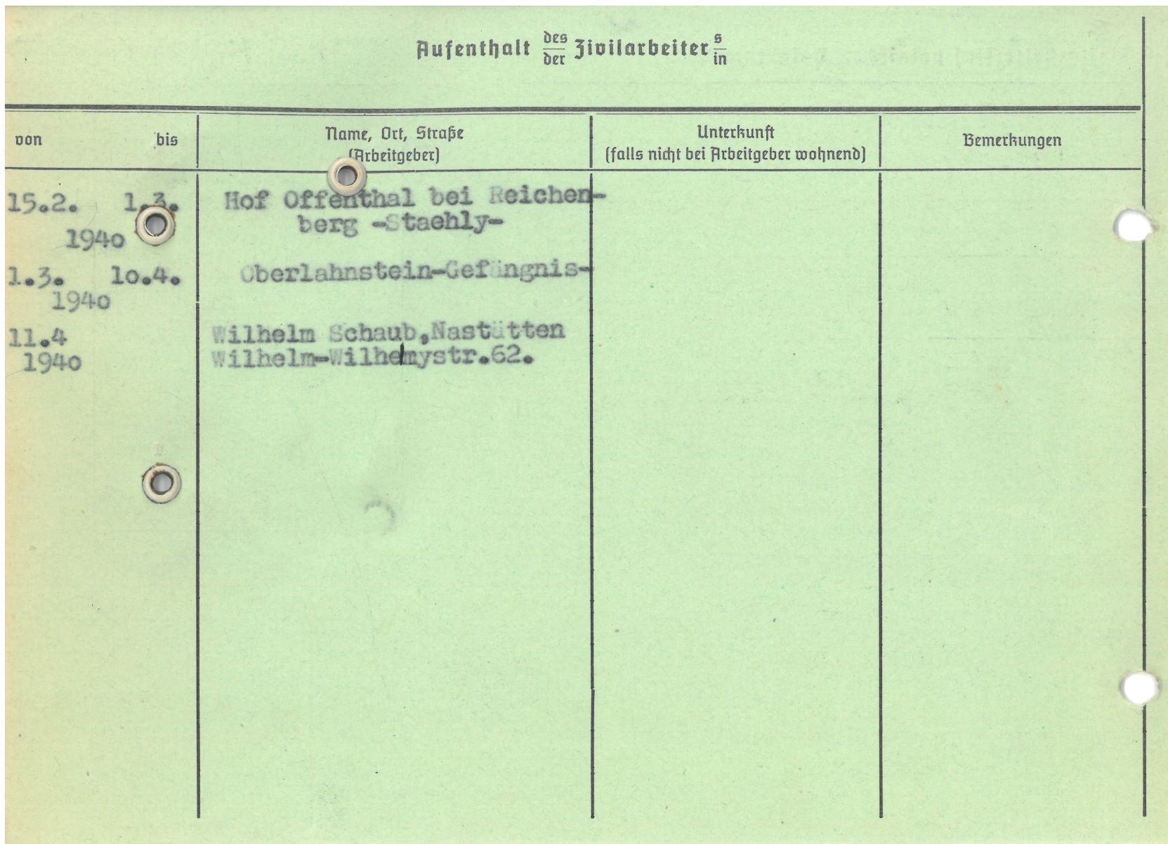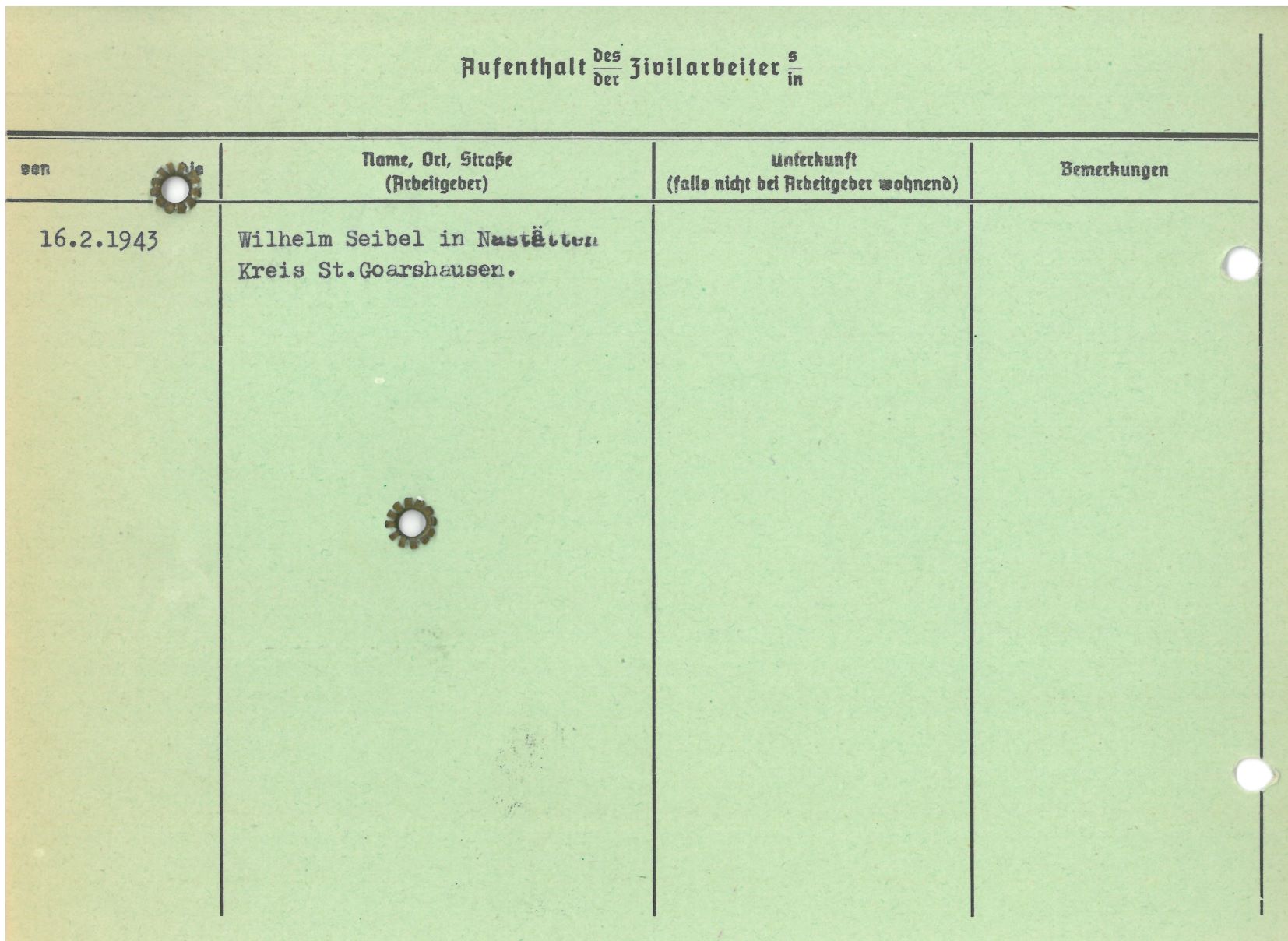 Im Oktober 1939 wurde die Einführung der Arbeitspflicht für Polen zwischen dem 18. und 60. Lebensjahr verordnet. Ab Sommer 1941 wurden die Zwangsarbeitsmaßnahmen auch auf den sowjetisch besetzen Teil Polens übertragen. Mehr und mehr wurden auch Jugendliche und selbst Kinder zur Zwangsarbeit herangezogen. Im Oktober 1940 arbeiteten in der deutschen Landwirtschaft etwa 400.000, in der Industrie rund 140.000 sogenannte Zivilarbeiter aus Polen und Sowjetrussland. Auch in Nastätten wurden Zivilarbeiter überwiegend in der Landwirtschaft eingesetzt. Finden sie Aufenthaltsbescheinigungen und Ausweise der in Nastätten eingesetzten Zivilarbeiter.