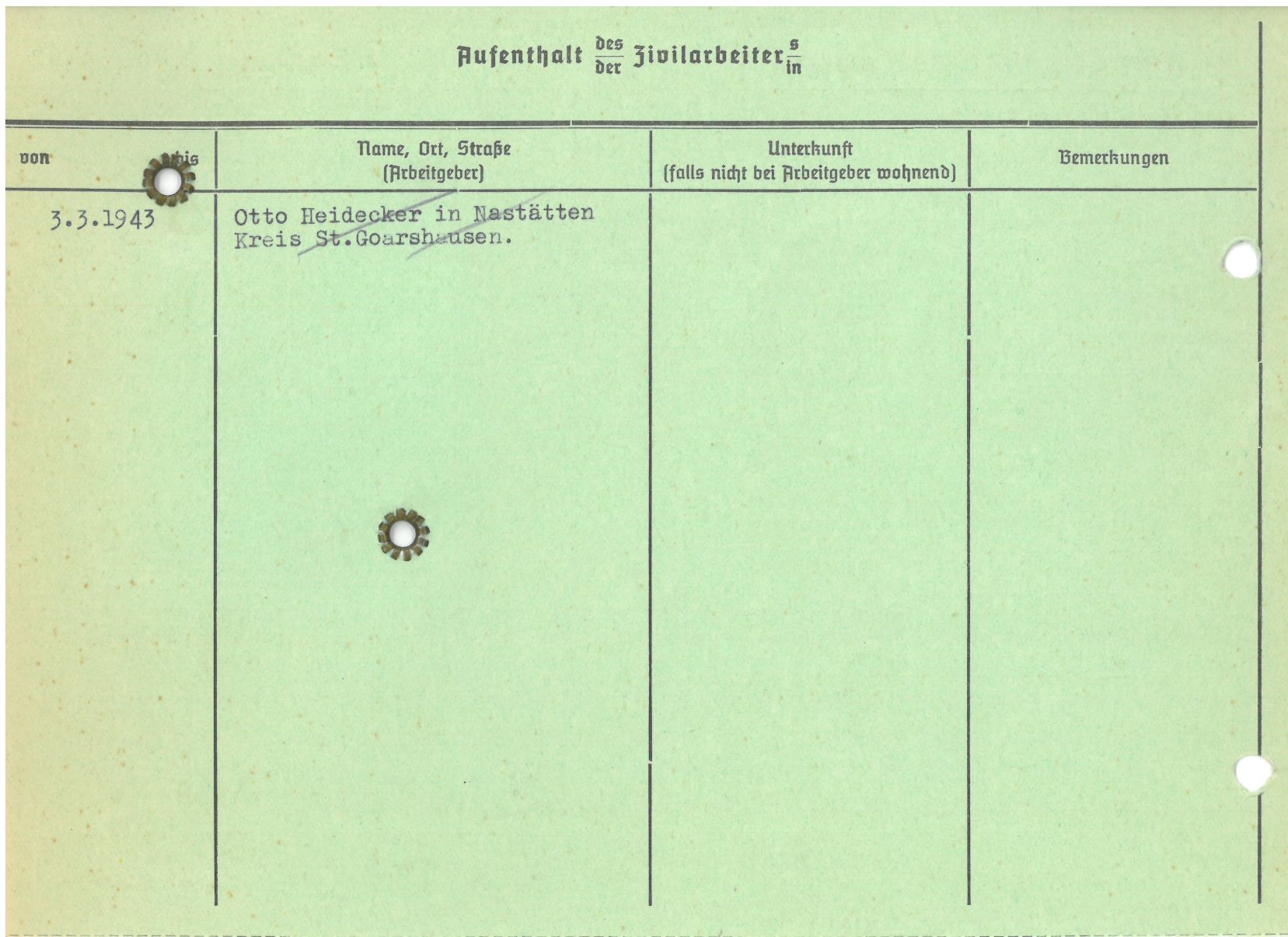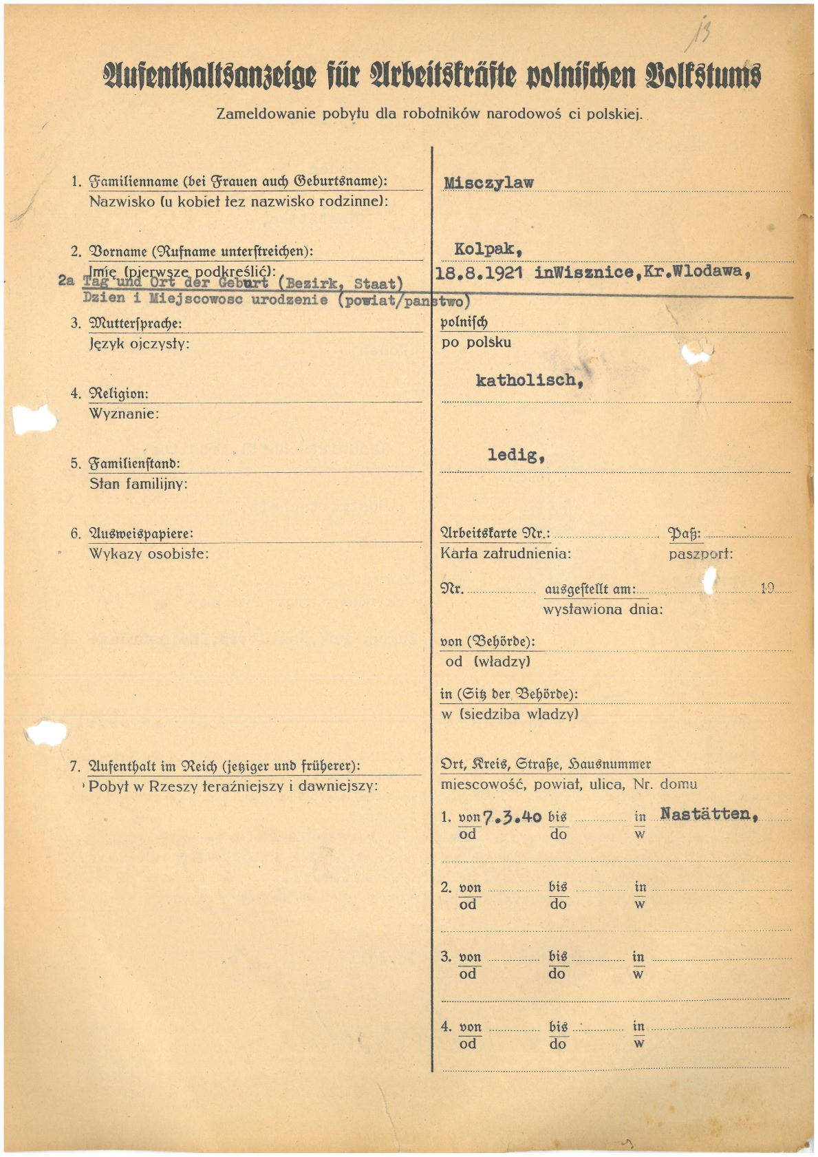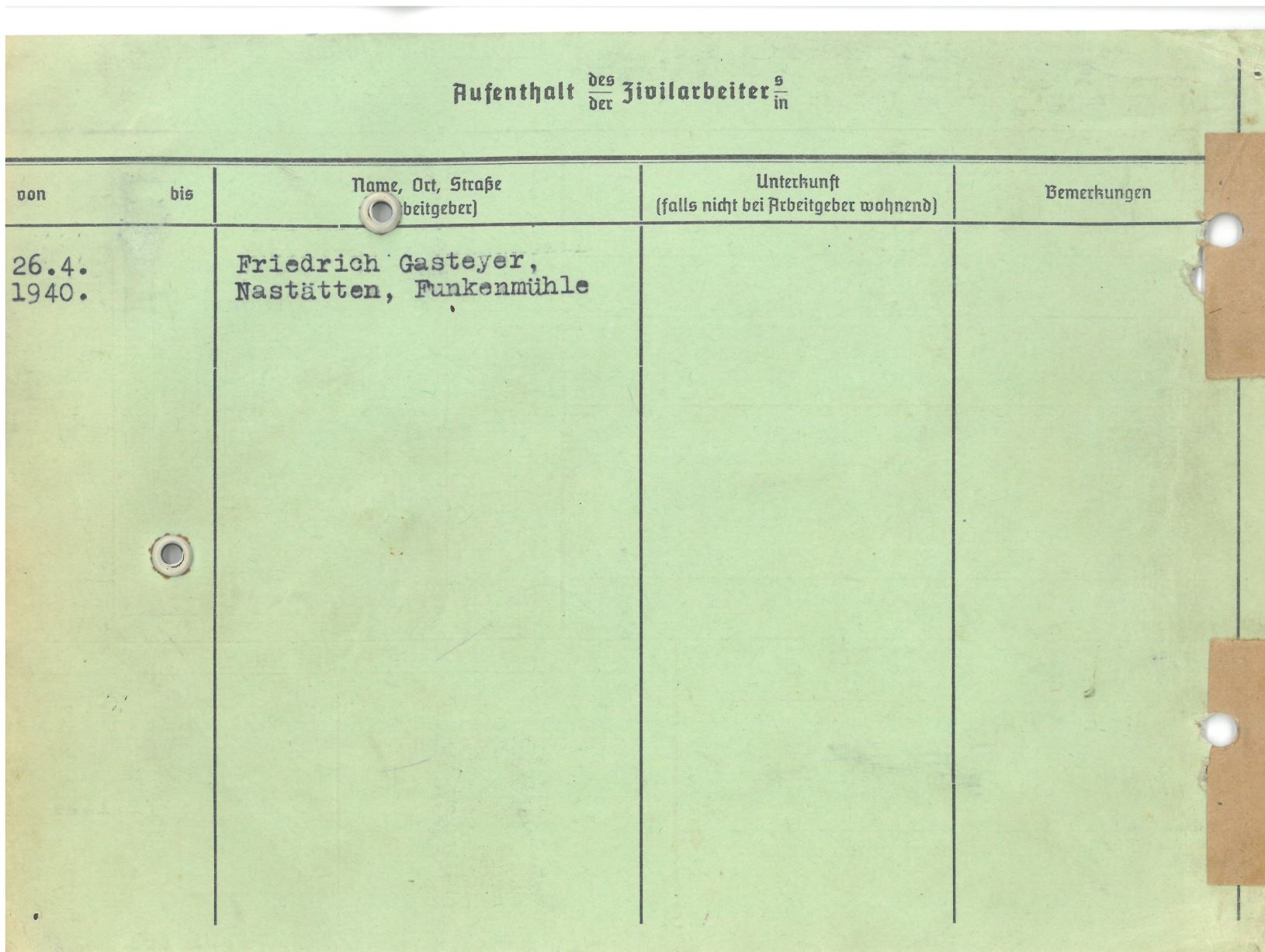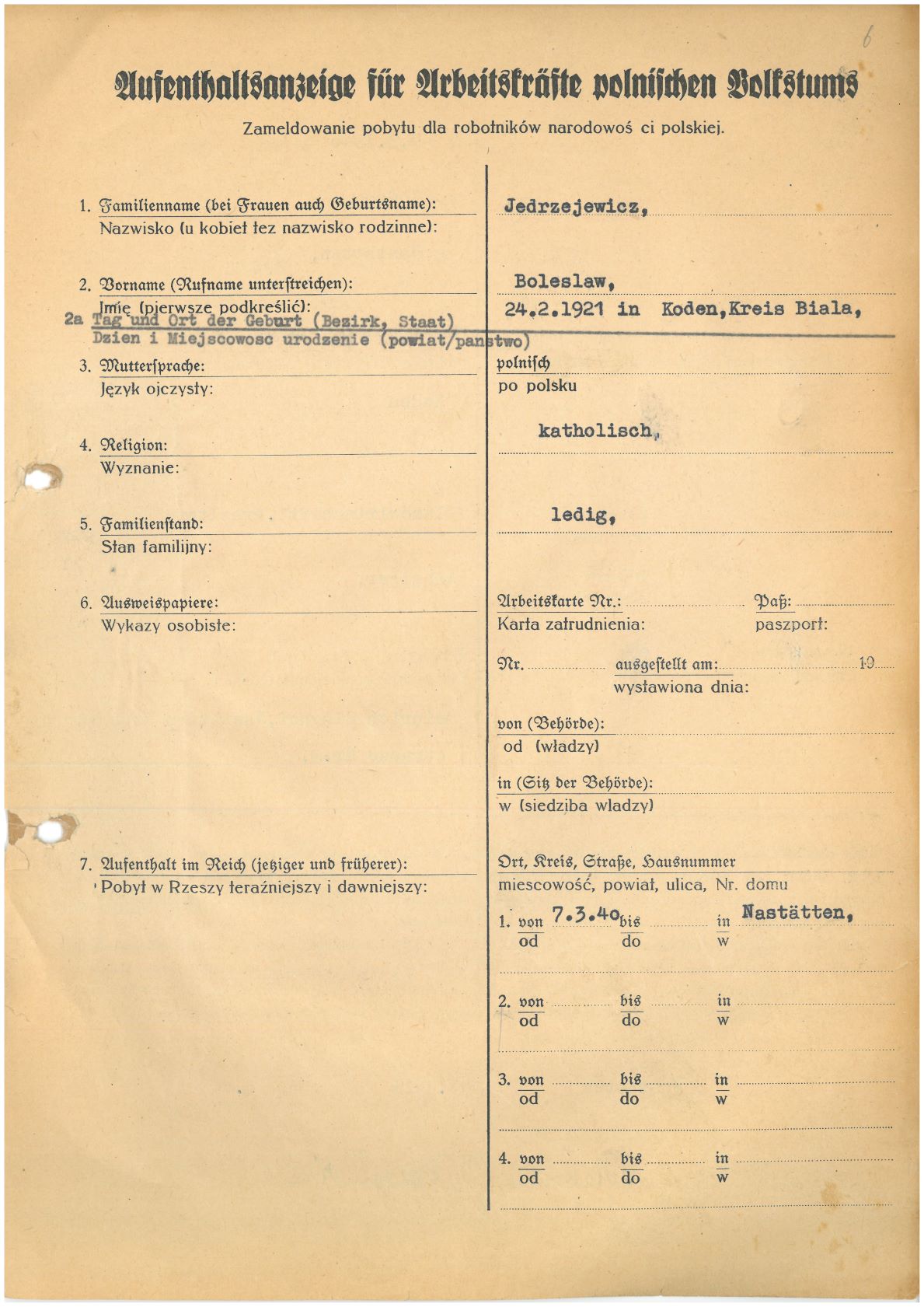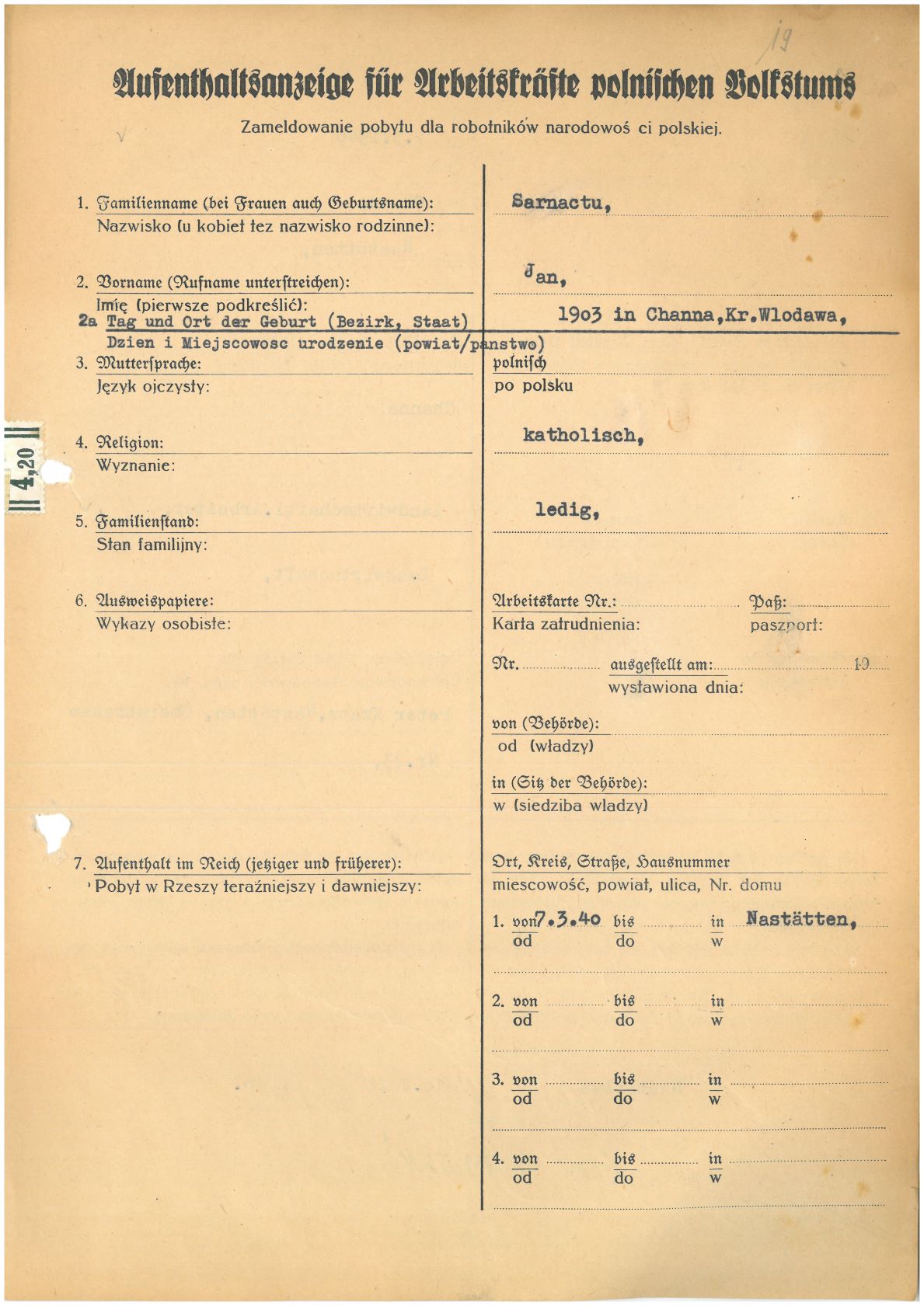 Im Oktober 1939 wurde die Einführung der Arbeitspflicht für Polen zwischen dem 18. und 60. Lebensjahr verordnet. Ab Sommer 1941 wurden die Zwangsarbeitsmaßnahmen auch auf den sowjetisch besetzen Teil Polens übertragen. Mehr und mehr wurden auch Jugendliche und selbst Kinder zur Zwangsarbeit herangezogen. Im Oktober 1940 arbeiteten in der deutschen Landwirtschaft etwa 400.000, in der Industrie rund 140.000 sogenannte Zivilarbeiter aus Polen und Sowjetrussland. Auch in Nastätten wurden Zivilarbeiter überwiegend in der Landwirtschaft eingesetzt. Finden sie Aufenthaltsbescheinigungen und Ausweise der in Nastätten eingesetzten Zivilarbeiter.