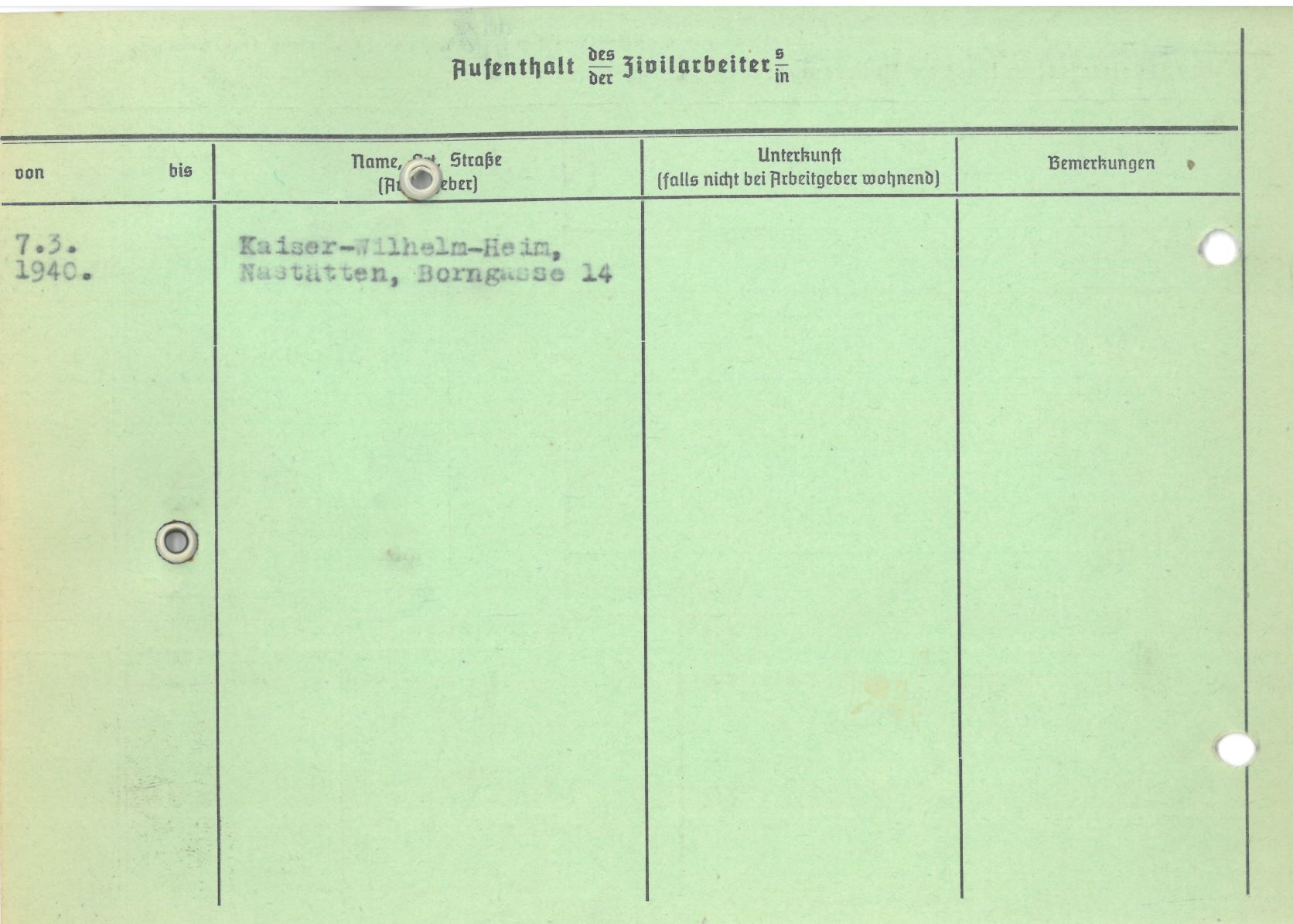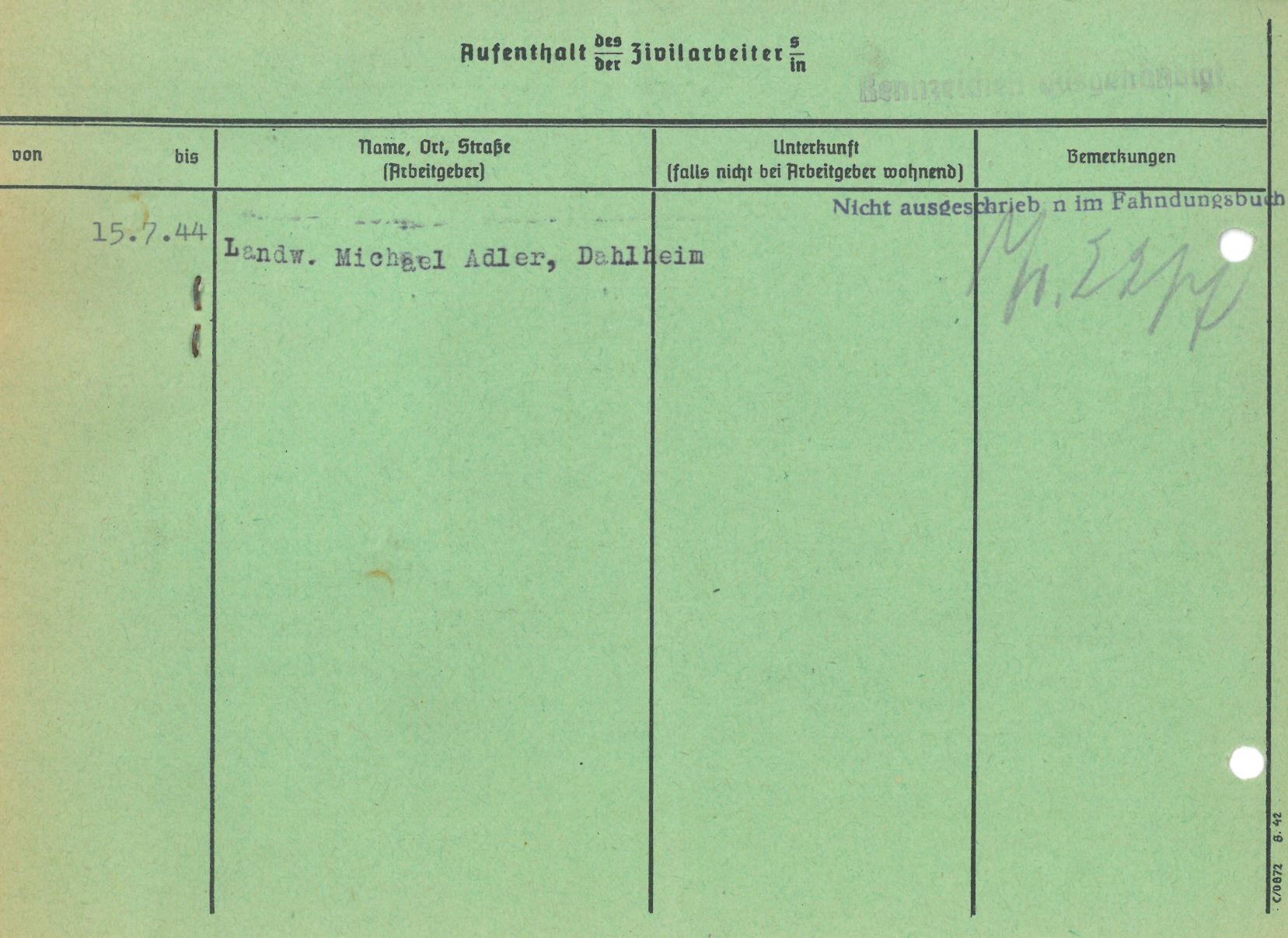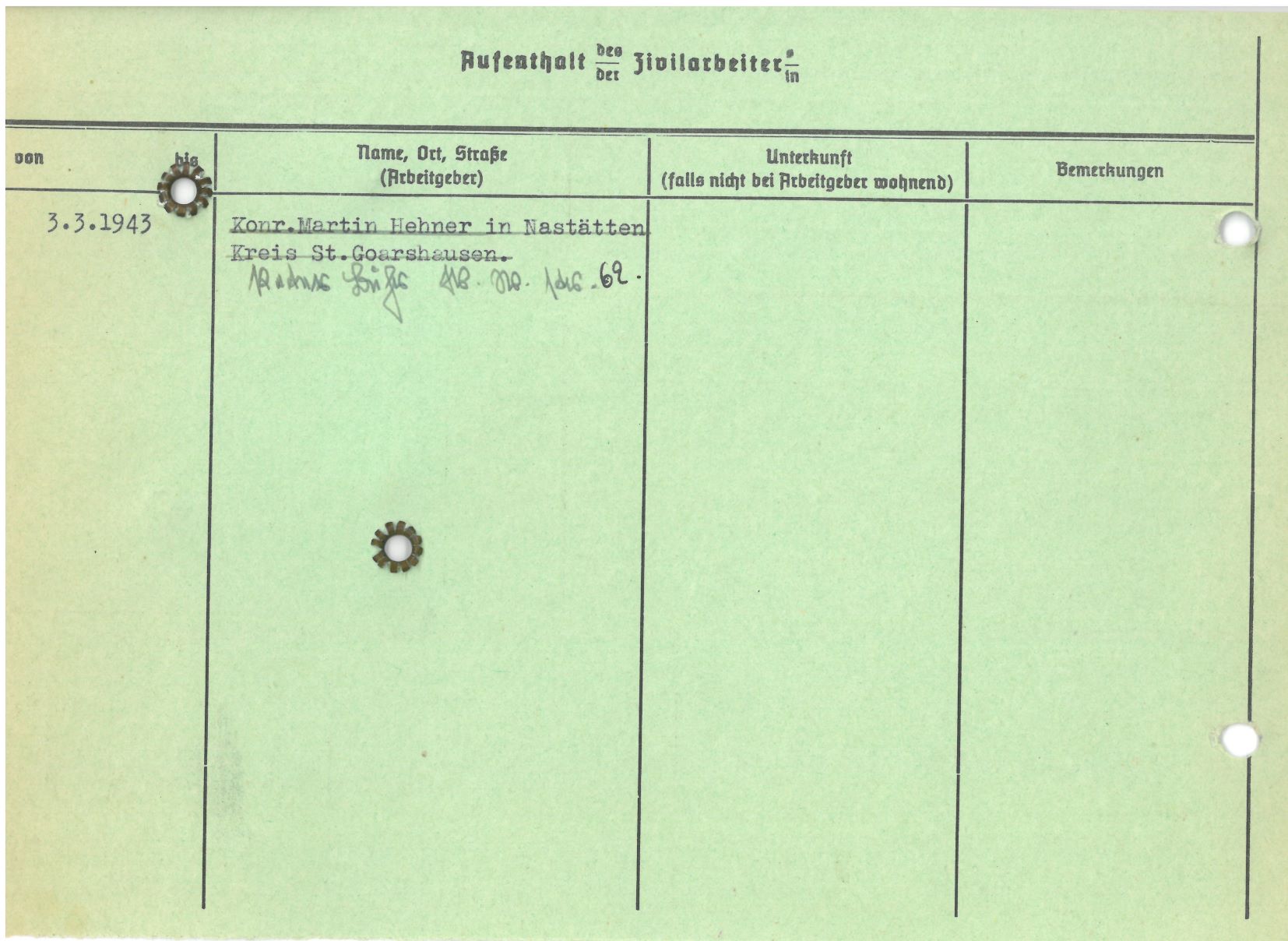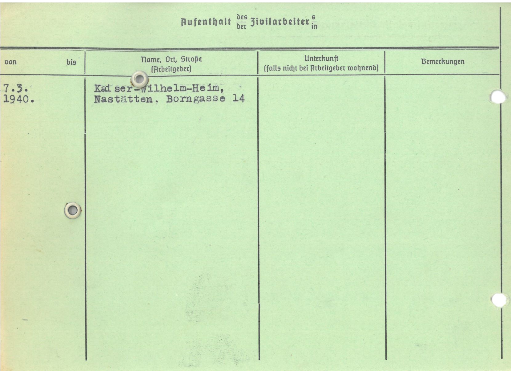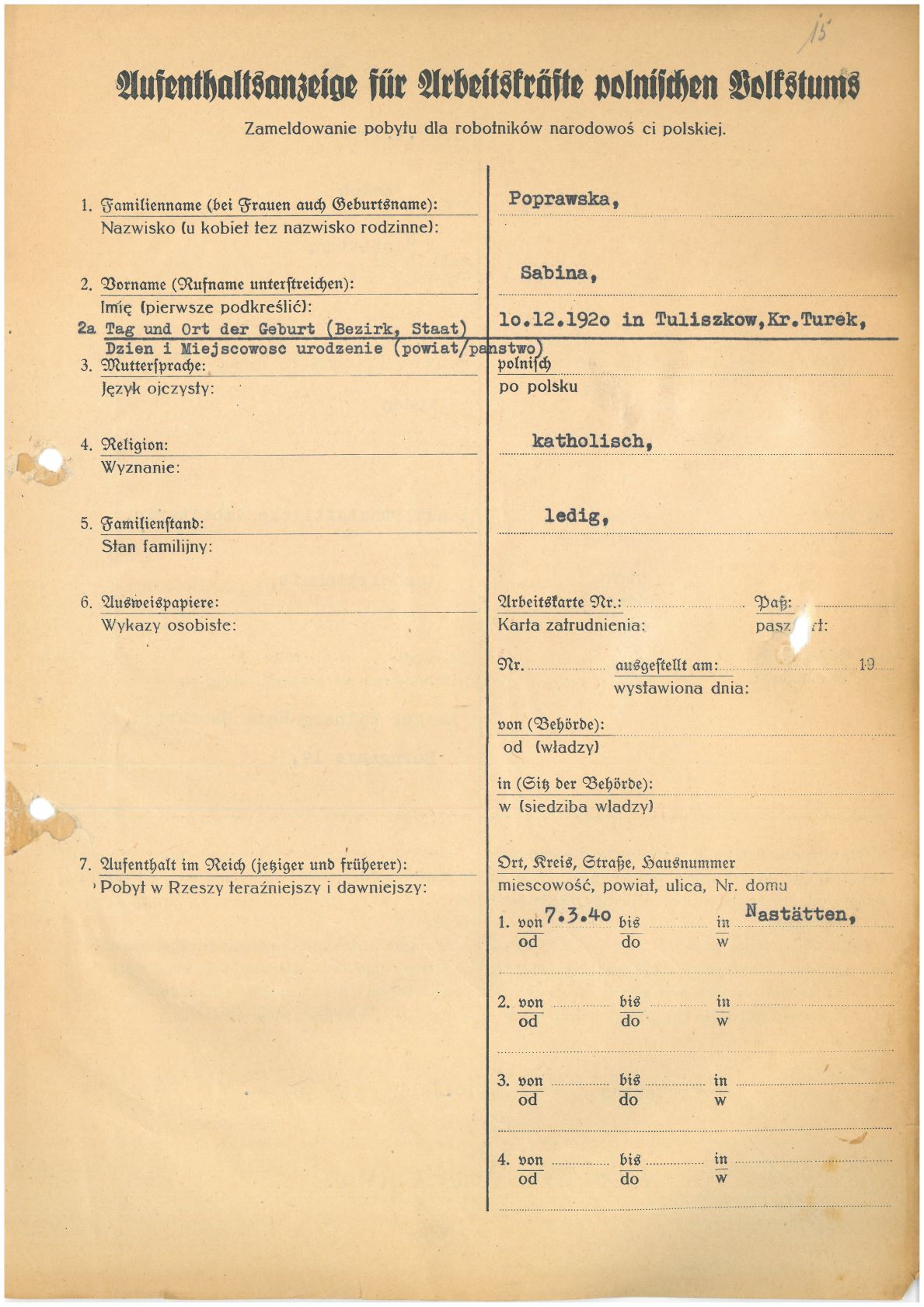 Im Oktober 1939 wurde die Einführung der Arbeitspflicht für Polen zwischen dem 18. und 60. Lebensjahr verordnet. Ab Sommer 1941 wurden die Zwangsarbeitsmaßnahmen auch auf den sowjetisch besetzen Teil Polens übertragen. Mehr und mehr wurden auch Jugendliche und selbst Kinder zur Zwangsarbeit herangezogen. Im Oktober 1940 arbeiteten in der deutschen Landwirtschaft etwa 400.000, in der Industrie rund 140.000 sogenannte Zivilarbeiter aus Polen und Sowjetrussland. Auch in Nastätten wurden Zivilarbeiter überwiegend in der Landwirtschaft eingesetzt. Finden sie Aufenthaltsbescheinigungen und Ausweise der in Nastätten eingesetzten Zivilarbeiter.