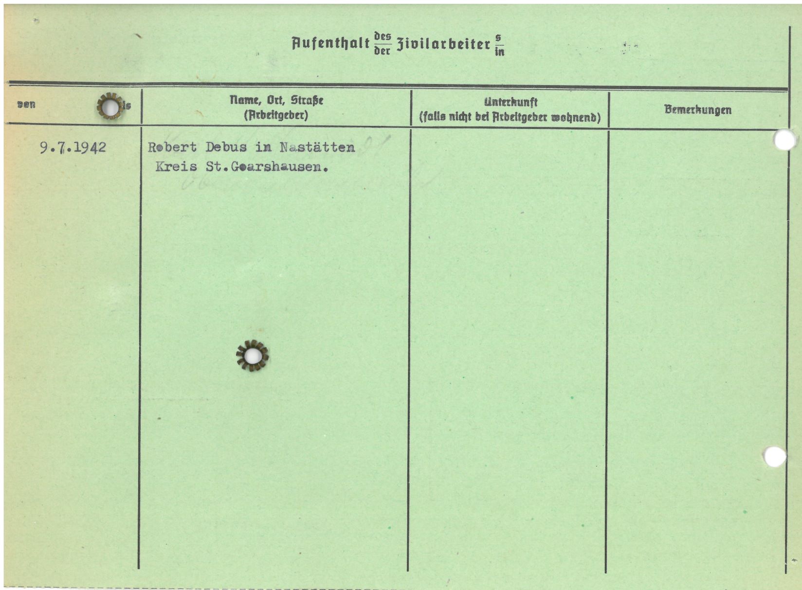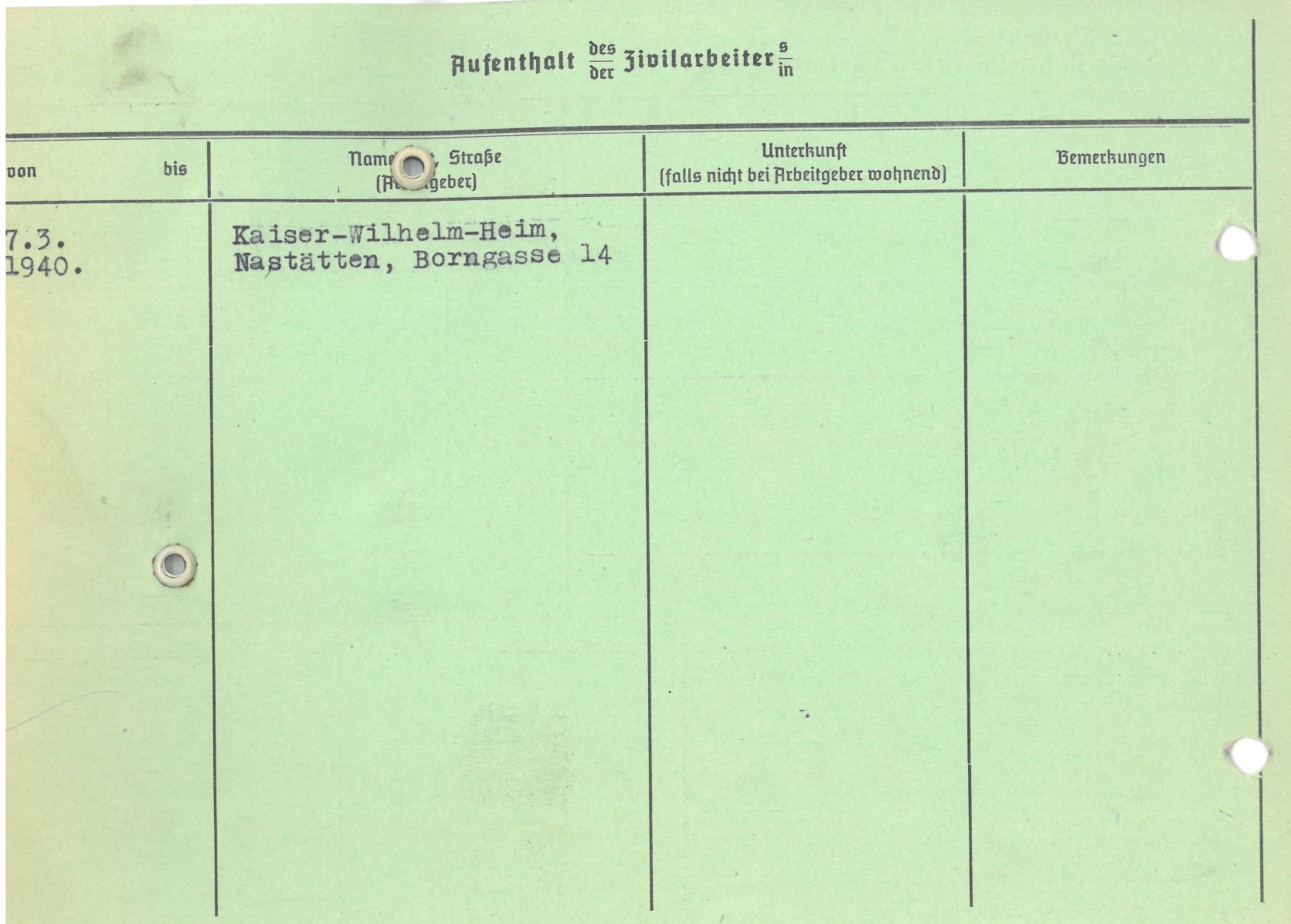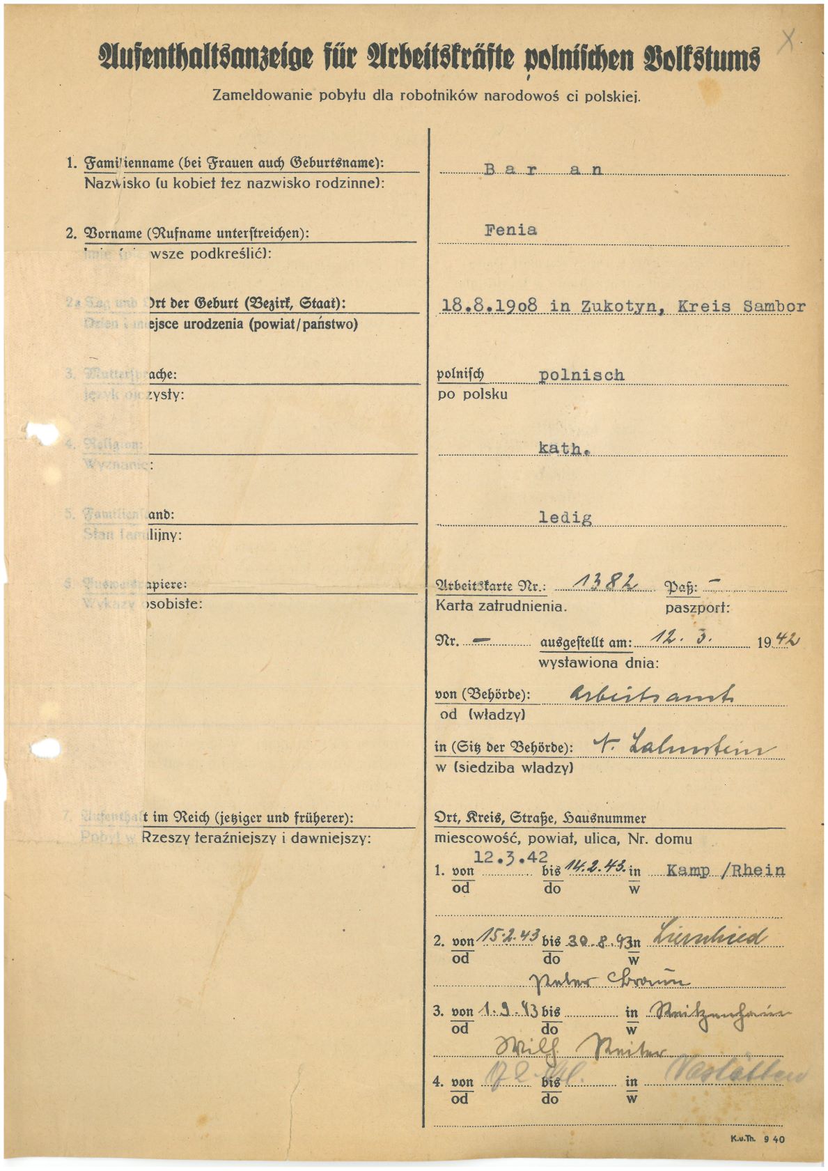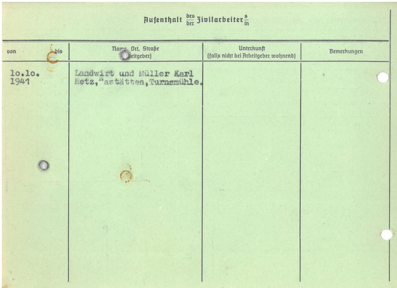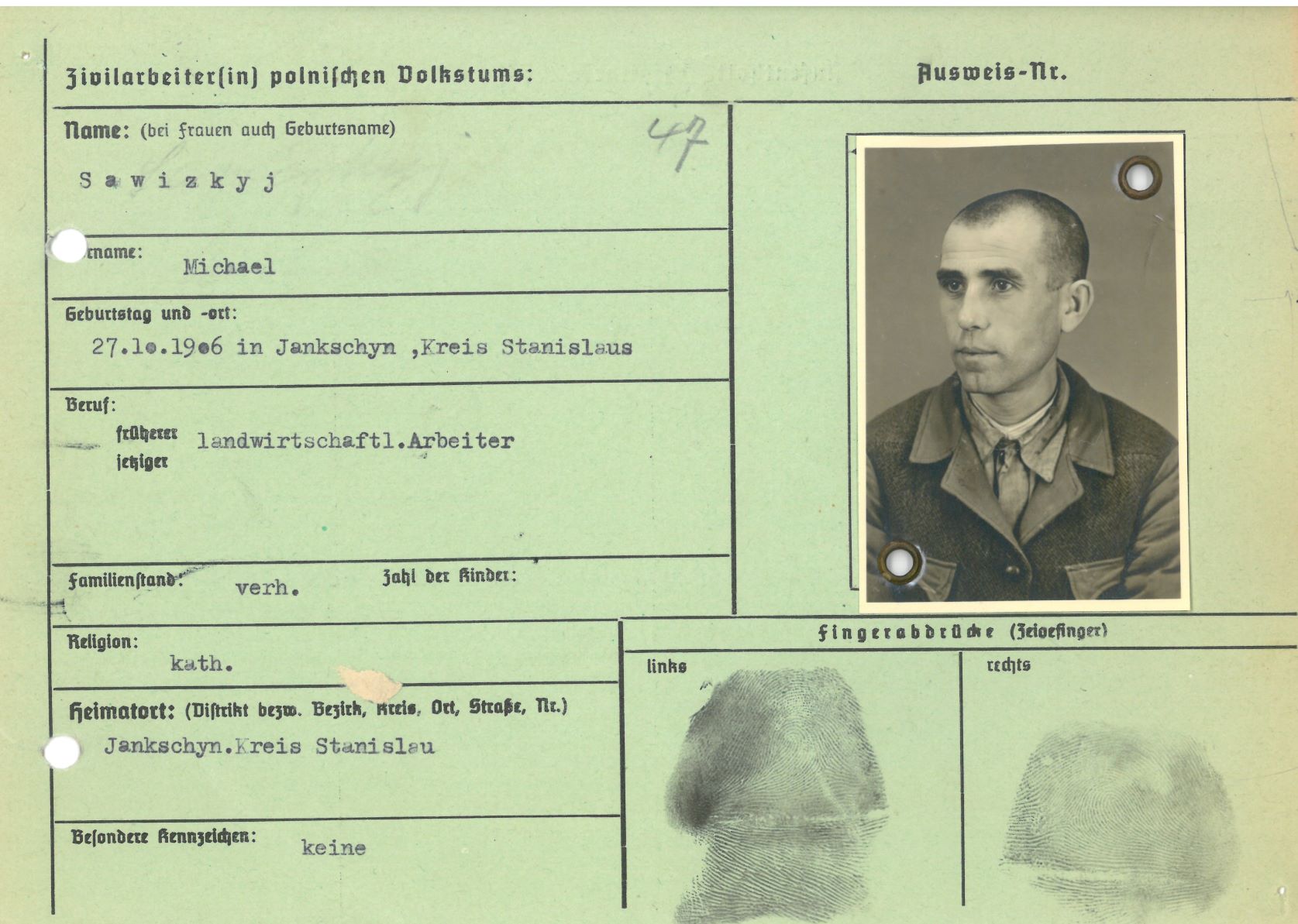 Im Oktober 1939 wurde die Einführung der Arbeitspflicht für Polen zwischen dem 18. und 60. Lebensjahr verordnet. Ab Sommer 1941 wurden die Zwangsarbeitsmaßnahmen auch auf den sowjetisch besetzen Teil Polens übertragen. Mehr und mehr wurden auch Jugendliche und selbst Kinder zur Zwangsarbeit herangezogen. Im Oktober 1940 arbeiteten in der deutschen Landwirtschaft etwa 400.000, in der Industrie rund 140.000 sogenannte Zivilarbeiter aus Polen und Sowjetrussland. Auch in Nastätten wurden Zivilarbeiter überwiegend in der Landwirtschaft eingesetzt. Finden sie Aufenthaltsbescheinigungen und Ausweise der in Nastätten eingesetzten Zivilarbeiter.
