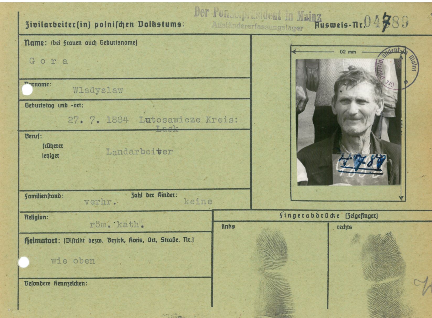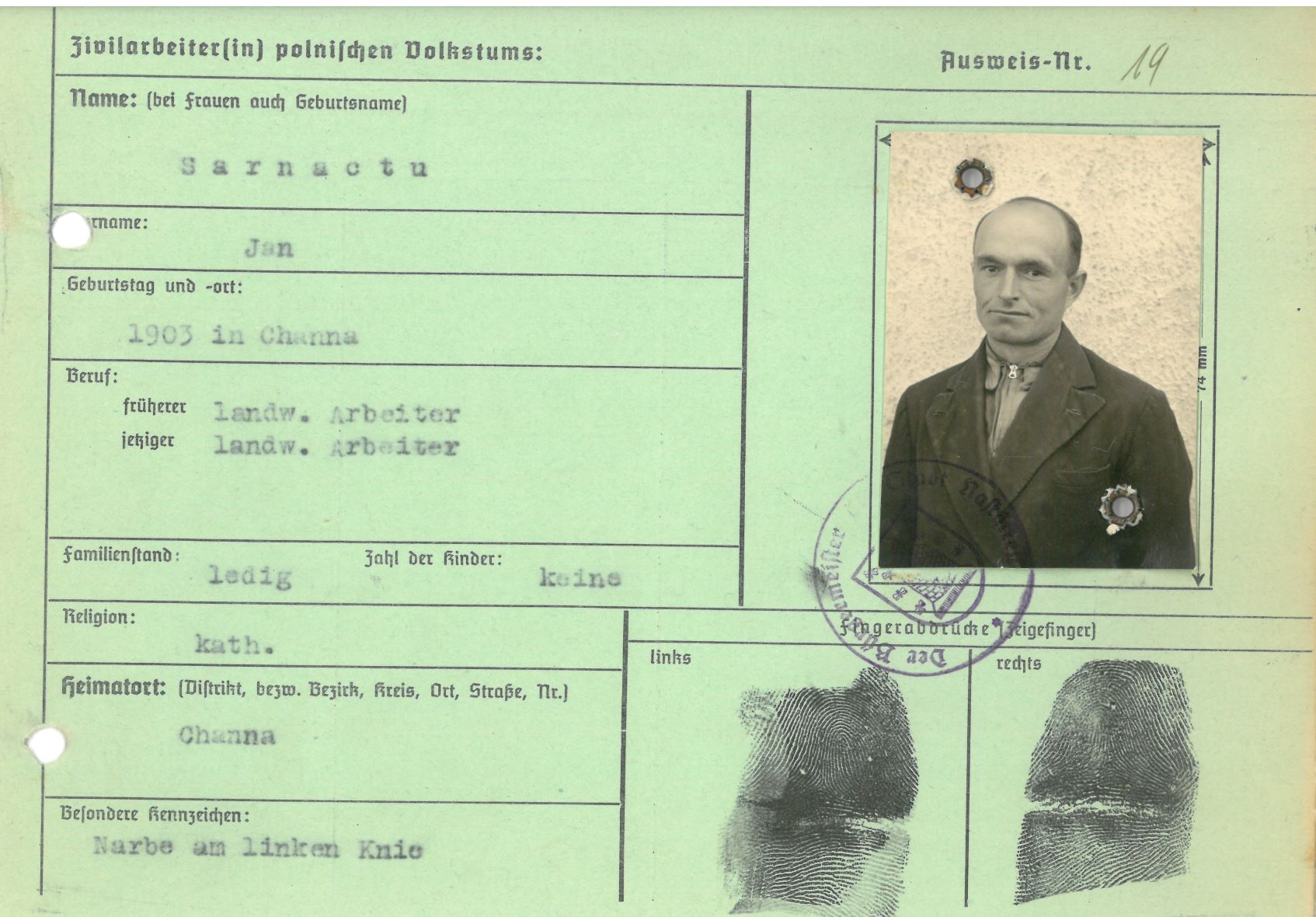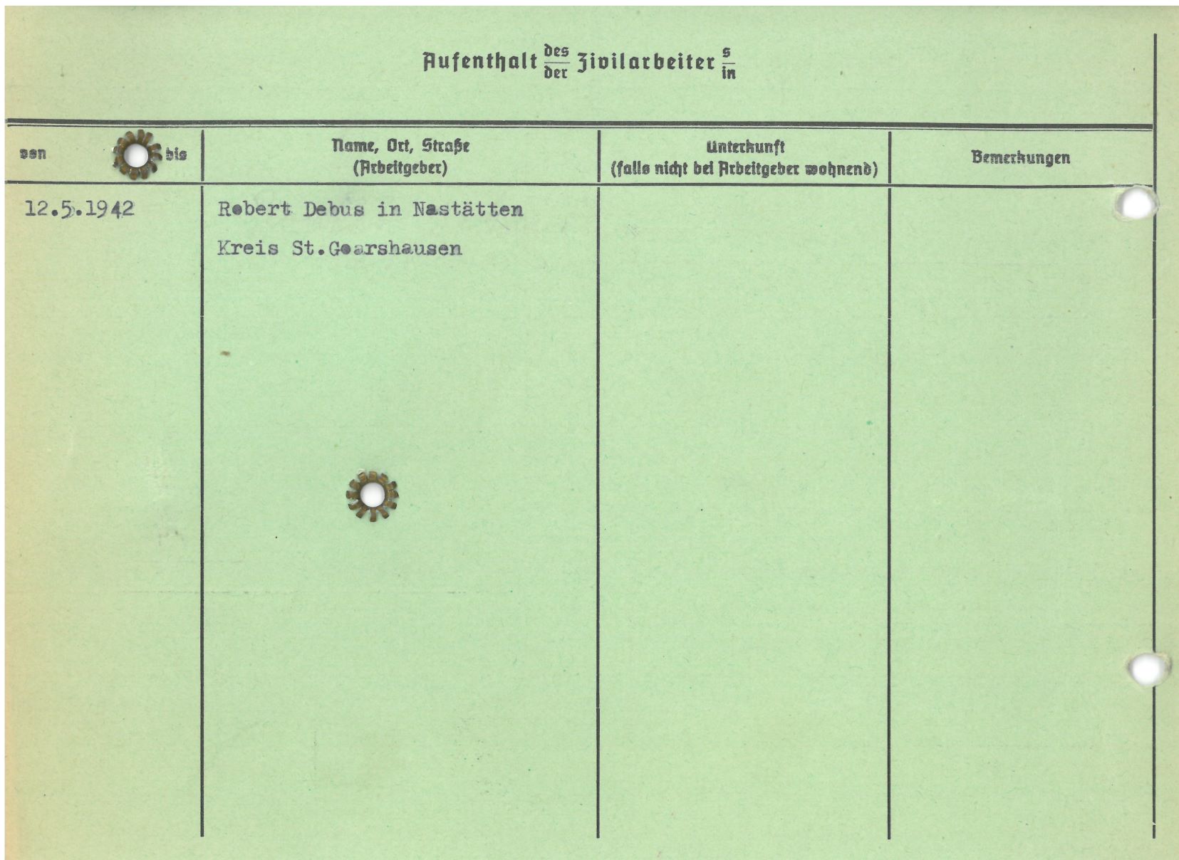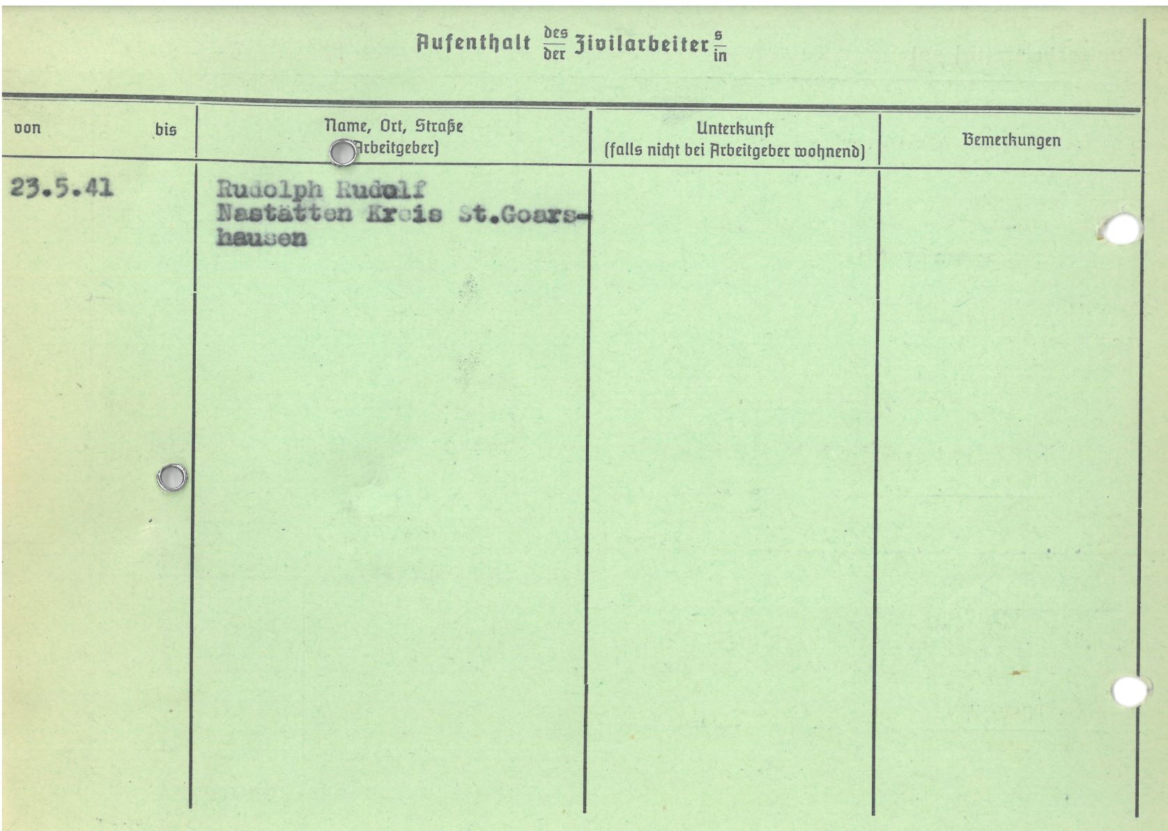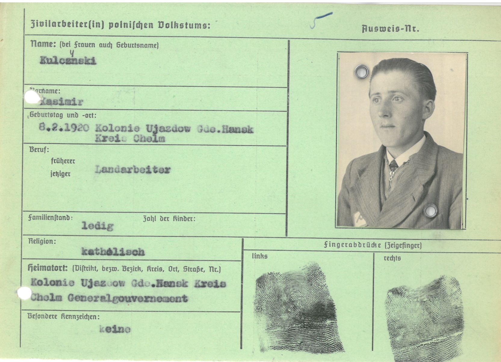 Im Oktober 1939 wurde die Einführung der Arbeitspflicht für Polen zwischen dem 18. und 60. Lebensjahr verordnet. Ab Sommer 1941 wurden die Zwangsarbeitsmaßnahmen auch auf den sowjetisch besetzen Teil Polens übertragen. Mehr und mehr wurden auch Jugendliche und selbst Kinder zur Zwangsarbeit herangezogen. Im Oktober 1940 arbeiteten in der deutschen Landwirtschaft etwa 400.000, in der Industrie rund 140.000 sogenannte Zivilarbeiter aus Polen und Sowjetrussland. Auch in Nastätten wurden Zivilarbeiter überwiegend in der Landwirtschaft eingesetzt. Finden sie Aufenthaltsbescheinigungen und Ausweise der in Nastätten eingesetzten Zivilarbeiter.