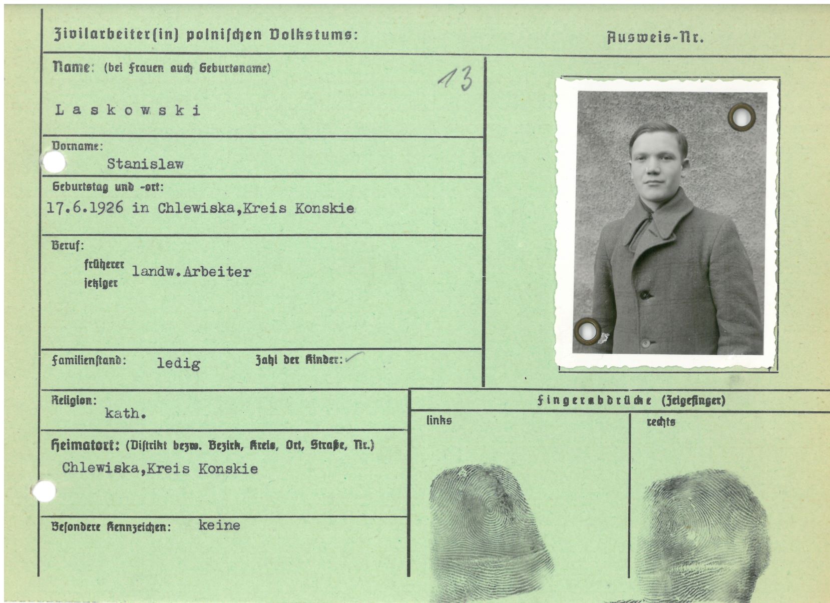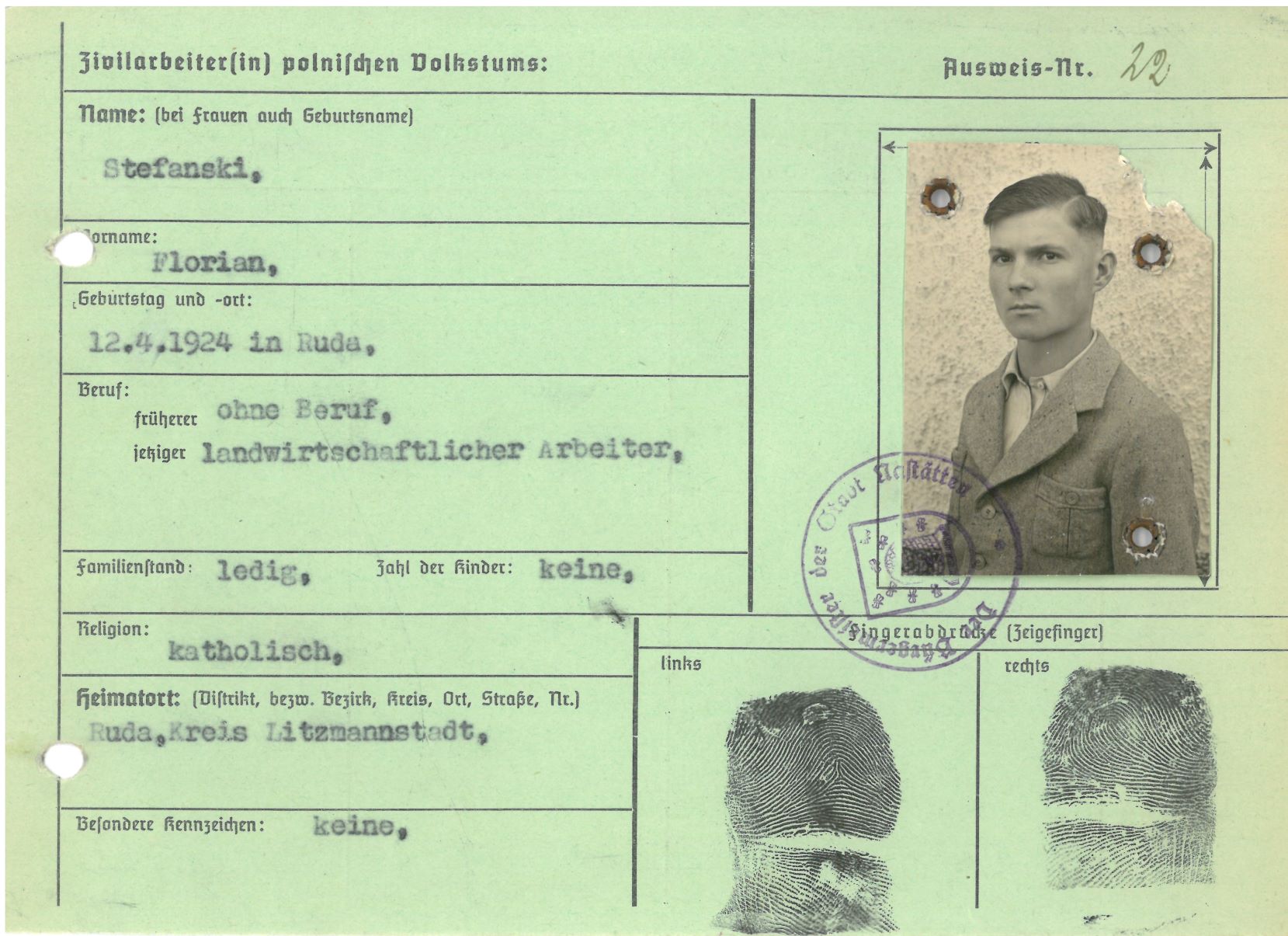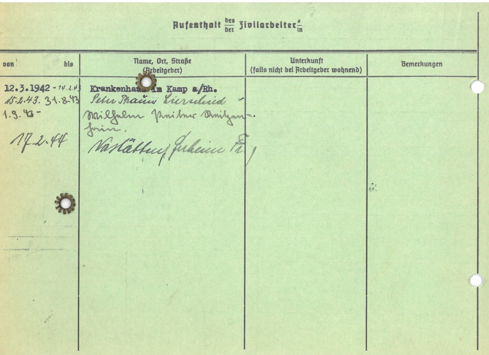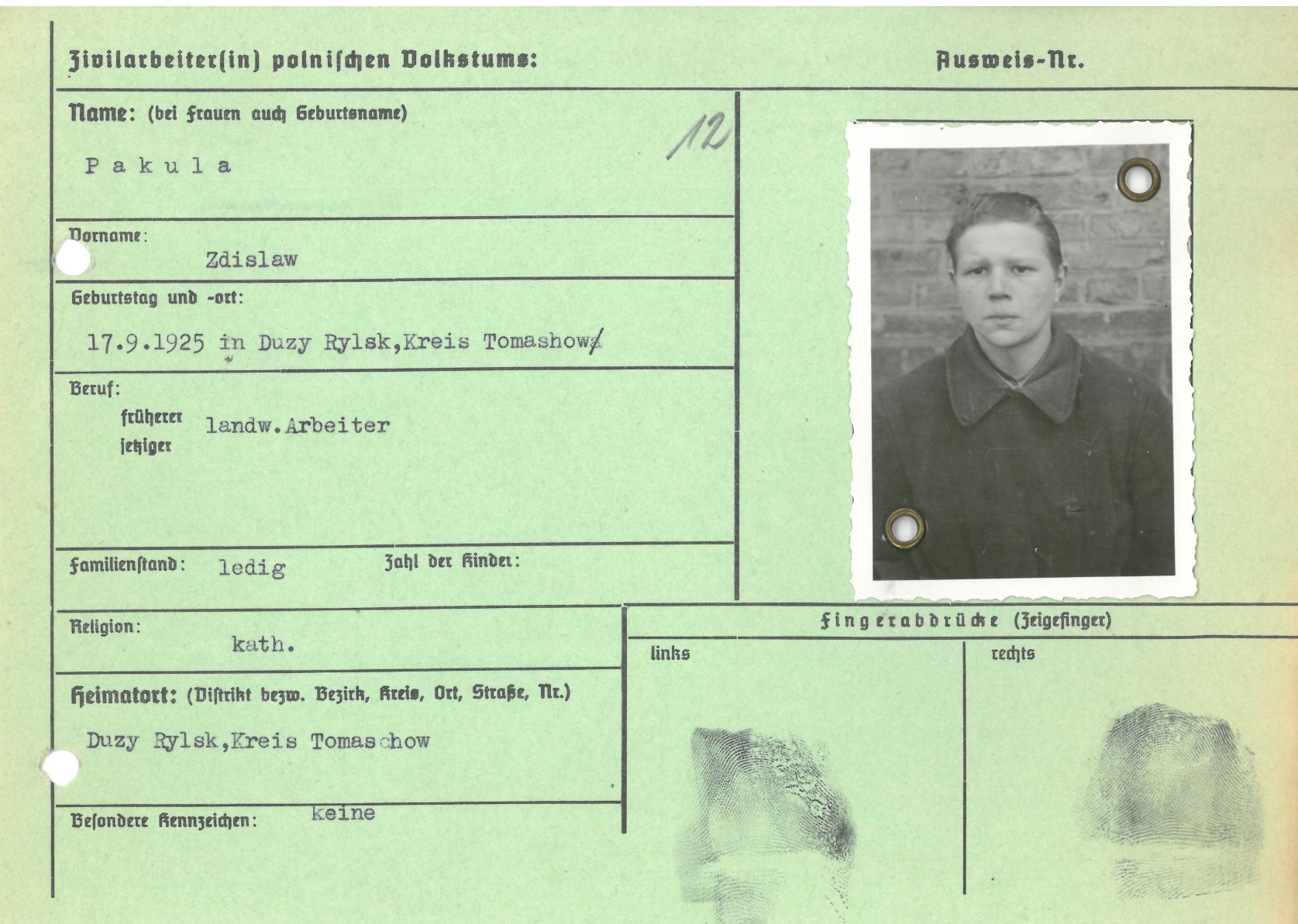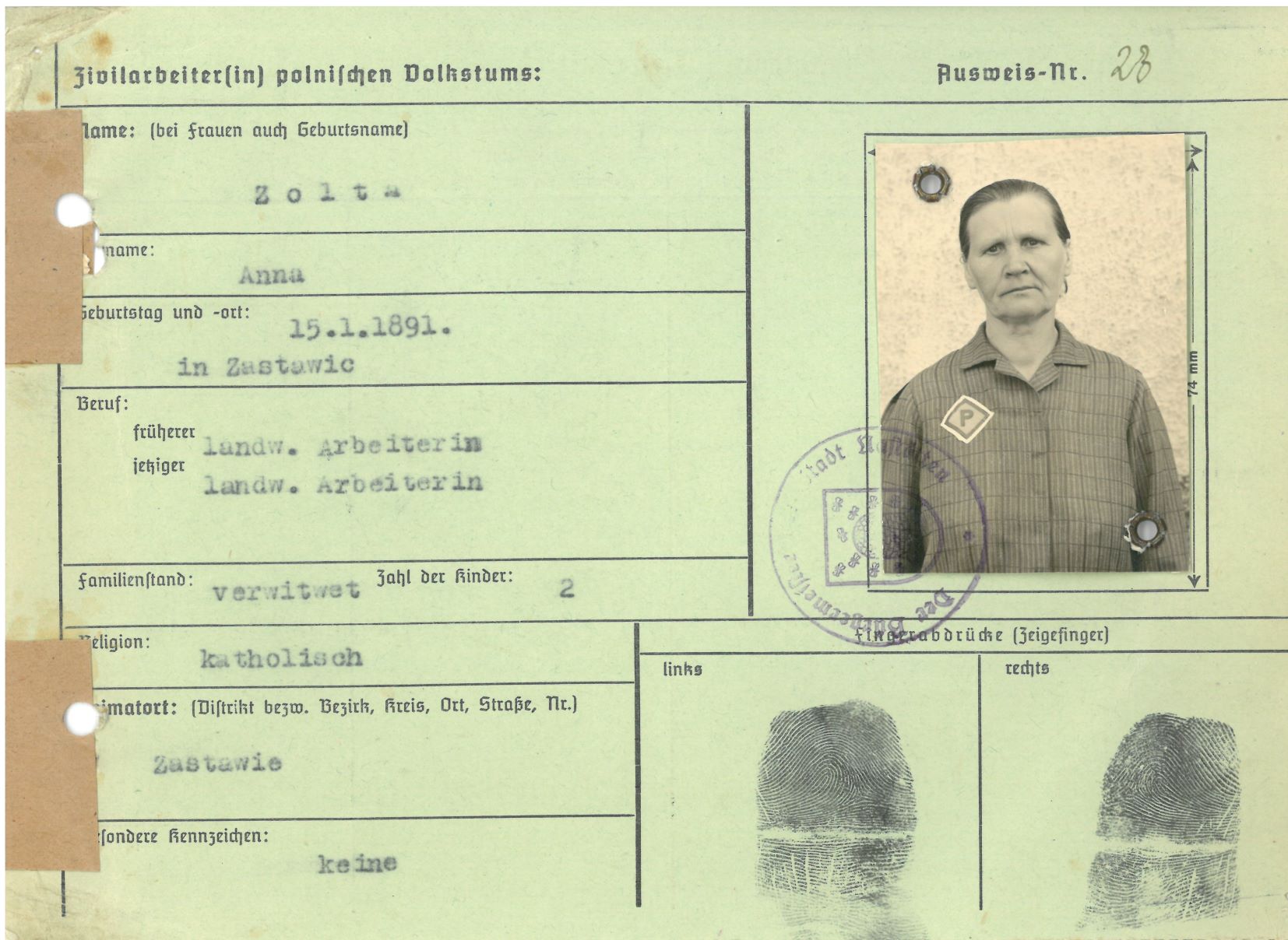 Im Oktober 1939 wurde die Einführung der Arbeitspflicht für Polen zwischen dem 18. und 60. Lebensjahr verordnet. Ab Sommer 1941 wurden die Zwangsarbeitsmaßnahmen auch auf den sowjetisch besetzen Teil Polens übertragen. Mehr und mehr wurden auch Jugendliche und selbst Kinder zur Zwangsarbeit herangezogen. Im Oktober 1940 arbeiteten in der deutschen Landwirtschaft etwa 400.000, in der Industrie rund 140.000 sogenannte Zivilarbeiter aus Polen und Sowjetrussland. Auch in Nastätten wurden Zivilarbeiter überwiegend in der Landwirtschaft eingesetzt. Finden sie Aufenthaltsbescheinigungen und Ausweise der in Nastätten eingesetzten Zivilarbeiter.