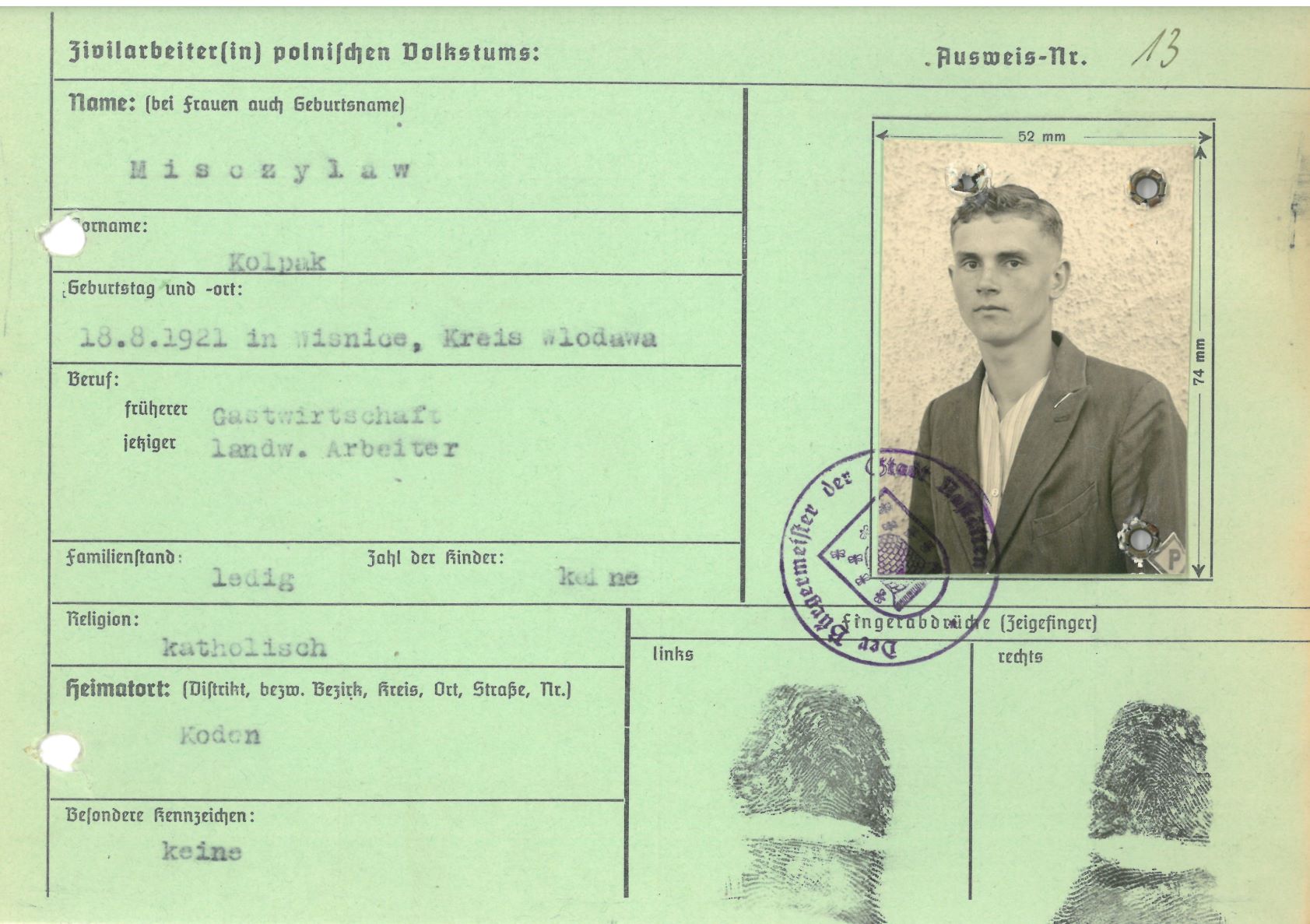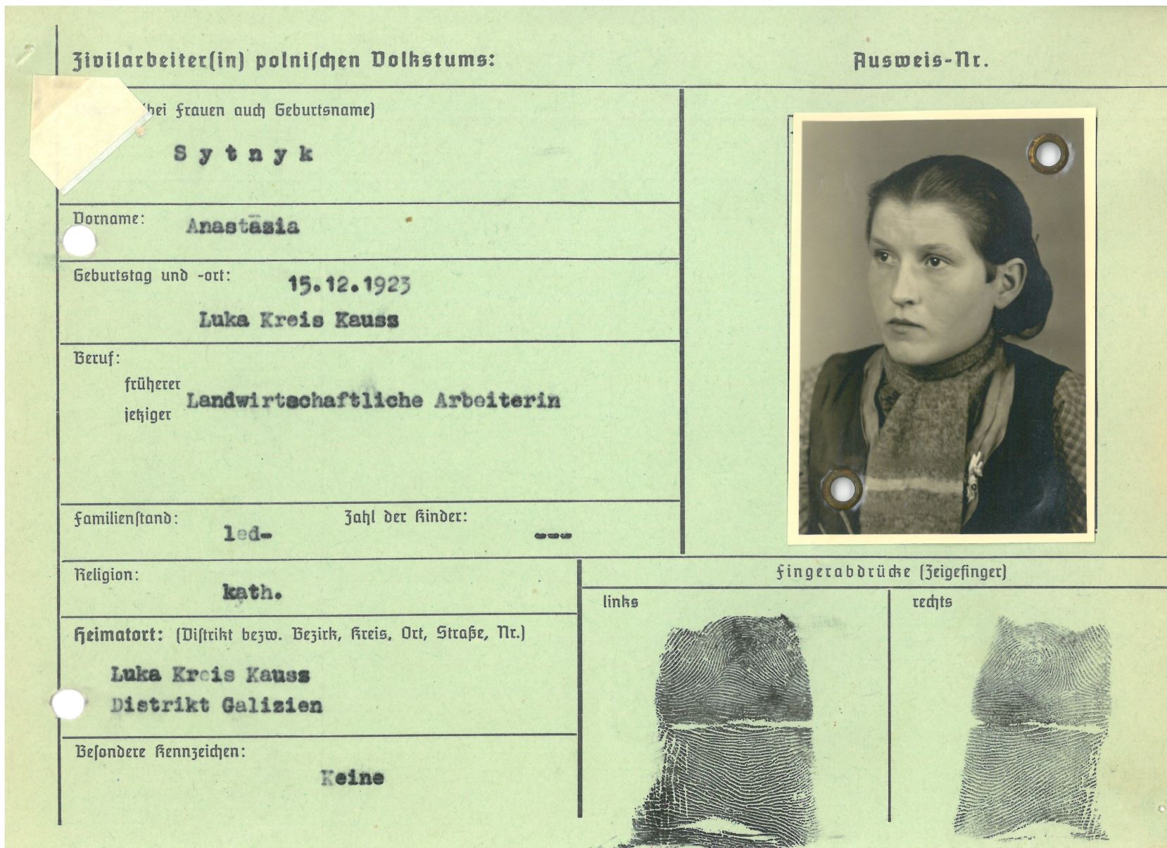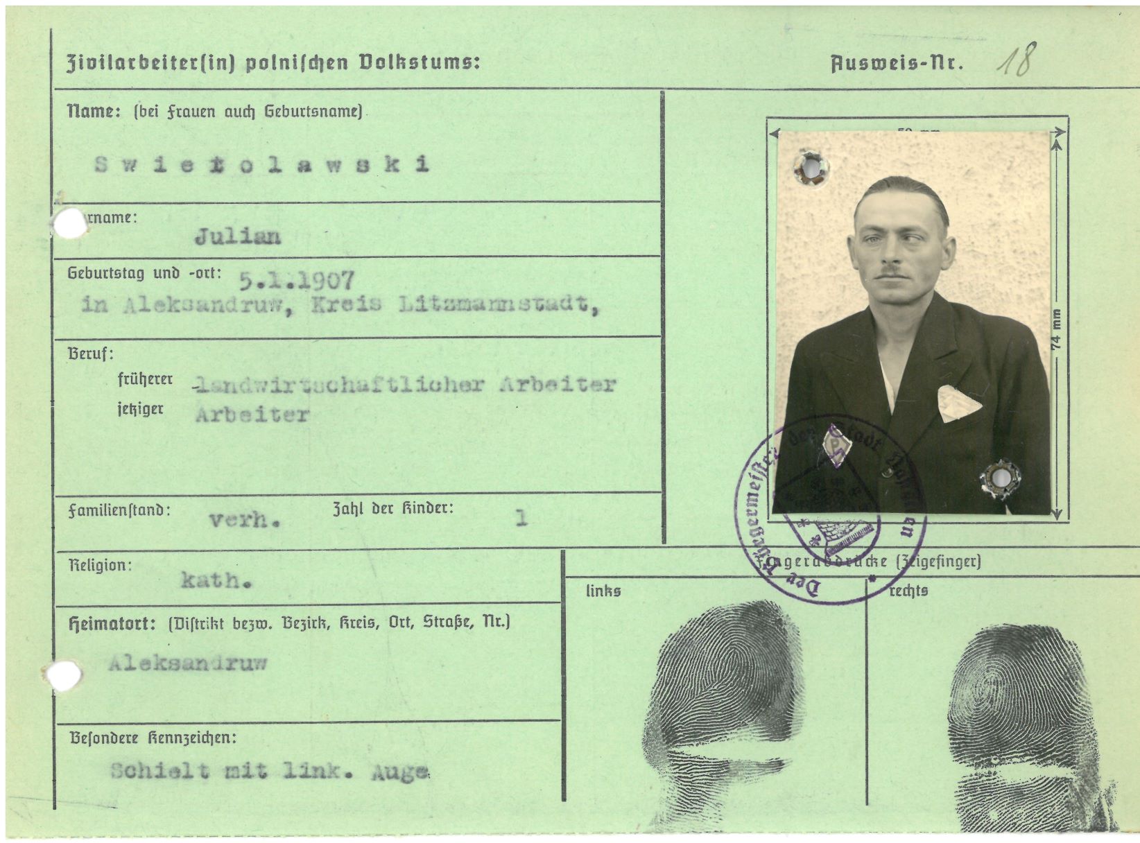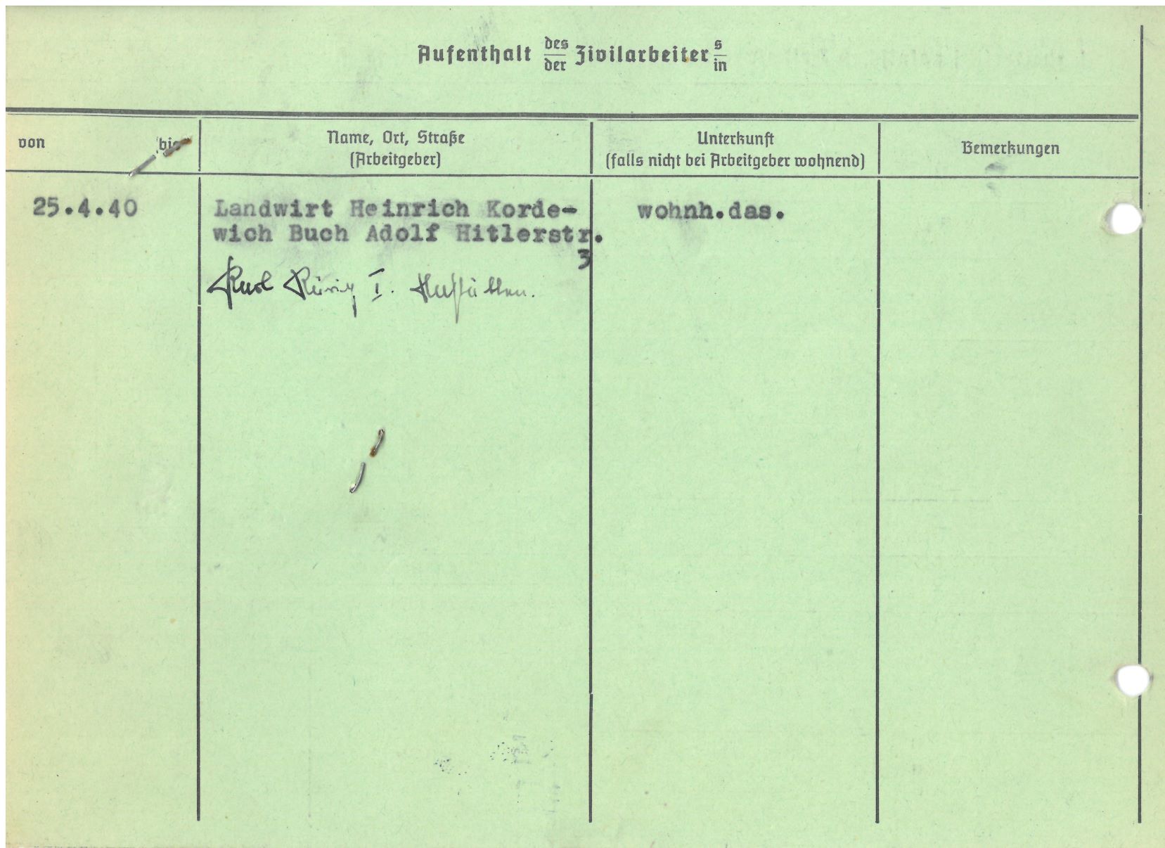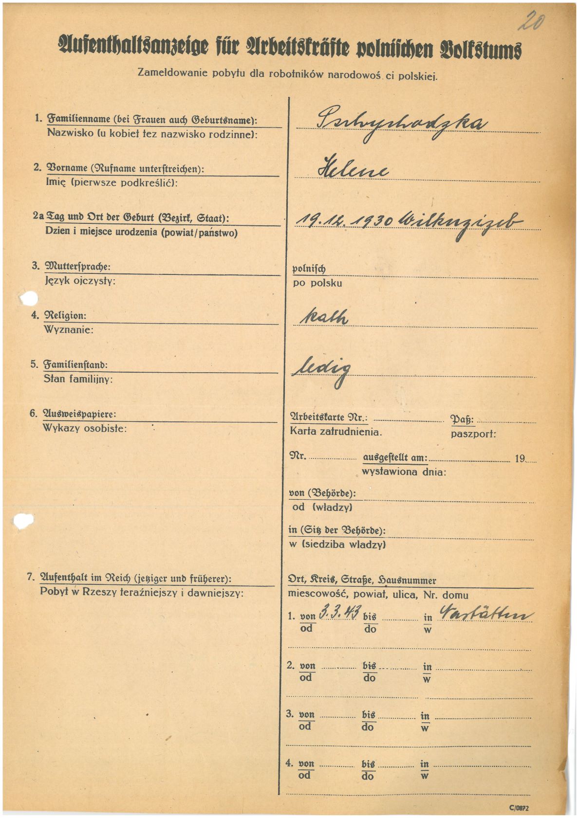 Im Oktober 1939 wurde die Einführung der Arbeitspflicht für Polen zwischen dem 18. und 60. Lebensjahr verordnet. Ab Sommer 1941 wurden die Zwangsarbeitsmaßnahmen auch auf den sowjetisch besetzen Teil Polens übertragen. Mehr und mehr wurden auch Jugendliche und selbst Kinder zur Zwangsarbeit herangezogen. Im Oktober 1940 arbeiteten in der deutschen Landwirtschaft etwa 400.000, in der Industrie rund 140.000 sogenannte Zivilarbeiter aus Polen und Sowjetrussland. Auch in Nastätten wurden Zivilarbeiter überwiegend in der Landwirtschaft eingesetzt. Finden sie Aufenthaltsbescheinigungen und Ausweise der in Nastätten eingesetzten Zivilarbeiter.