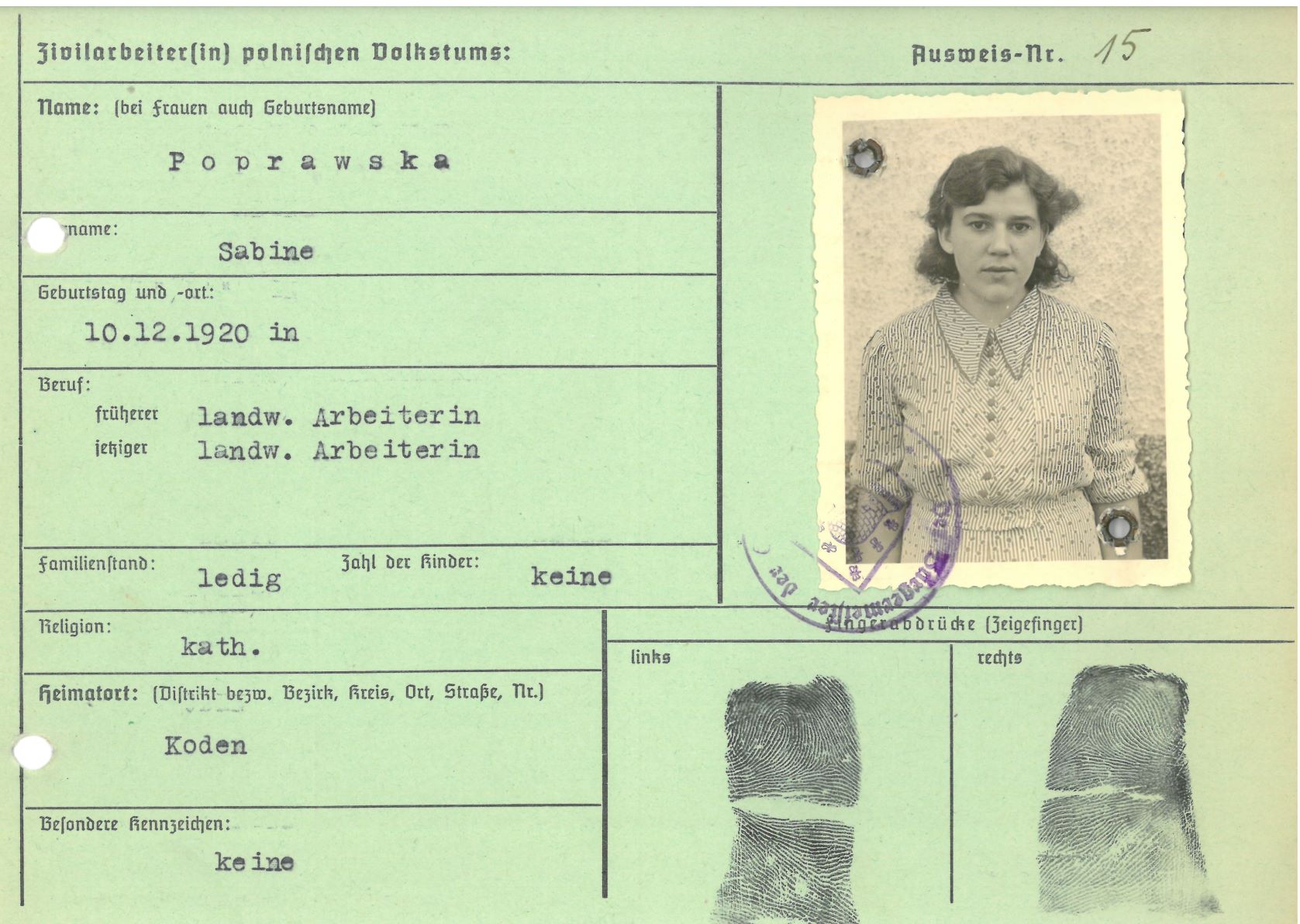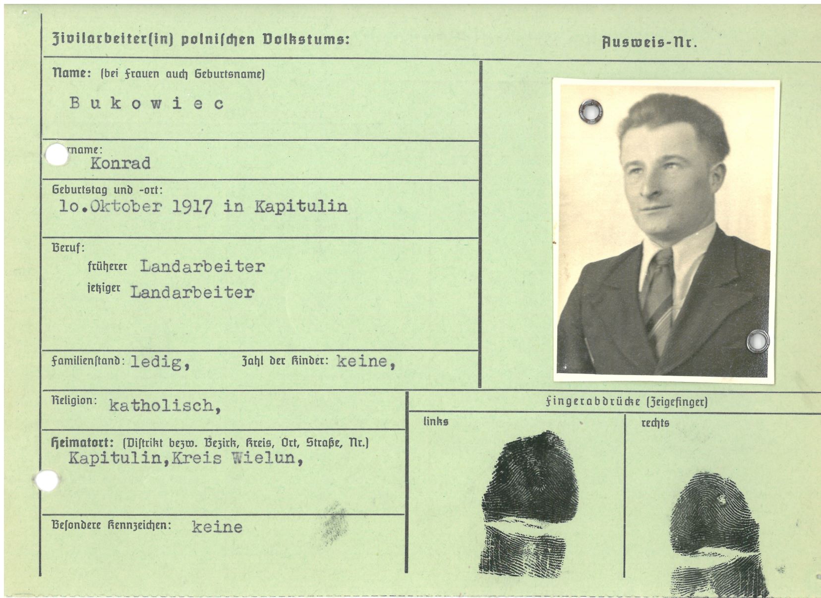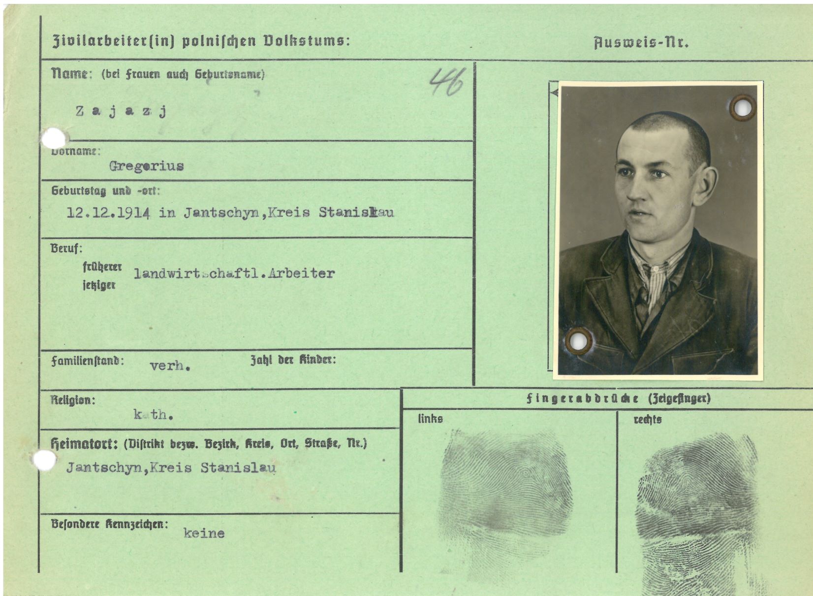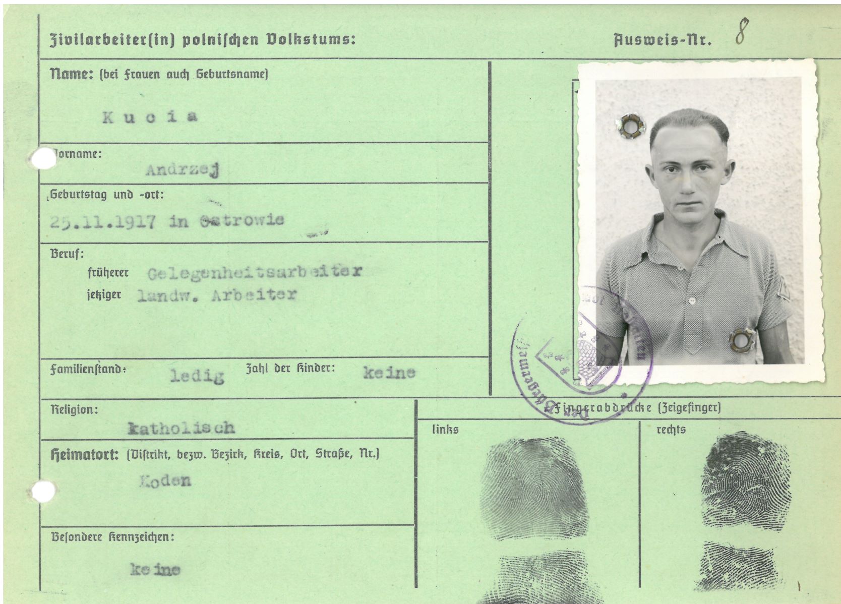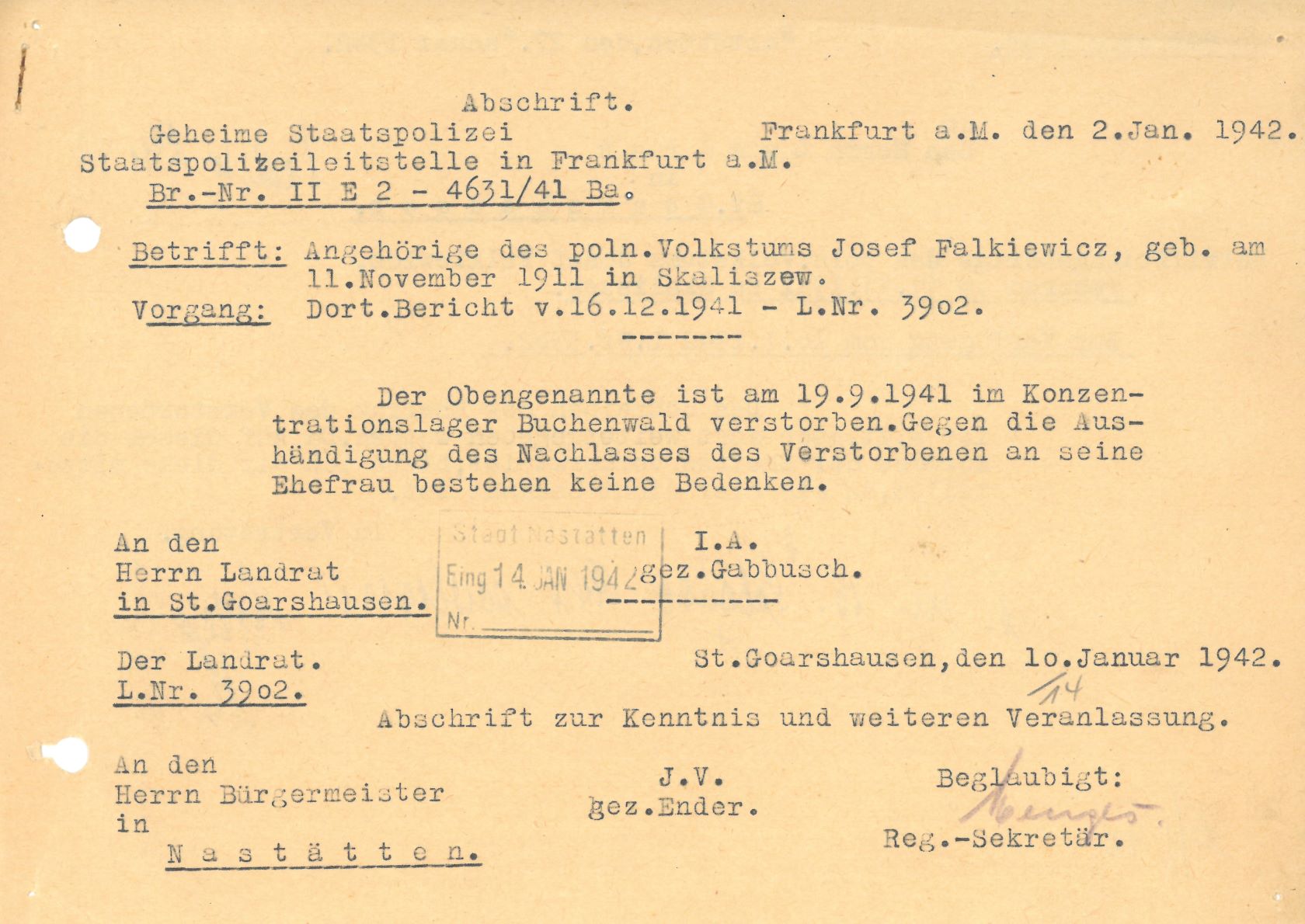 Im Oktober 1939 wurde die Einführung der Arbeitspflicht für Polen zwischen dem 18. und 60. Lebensjahr verordnet. Ab Sommer 1941 wurden die Zwangsarbeitsmaßnahmen auch auf den sowjetisch besetzen Teil Polens übertragen. Mehr und mehr wurden auch Jugendliche und selbst Kinder zur Zwangsarbeit herangezogen. Im Oktober 1940 arbeiteten in der deutschen Landwirtschaft etwa 400.000, in der Industrie rund 140.000 sogenannte Zivilarbeiter aus Polen und Sowjetrussland. Auch in Nastätten wurden Zivilarbeiter überwiegend in der Landwirtschaft eingesetzt. Finden sie Aufenthaltsbescheinigungen und Ausweise der in Nastätten eingesetzten Zivilarbeiter.