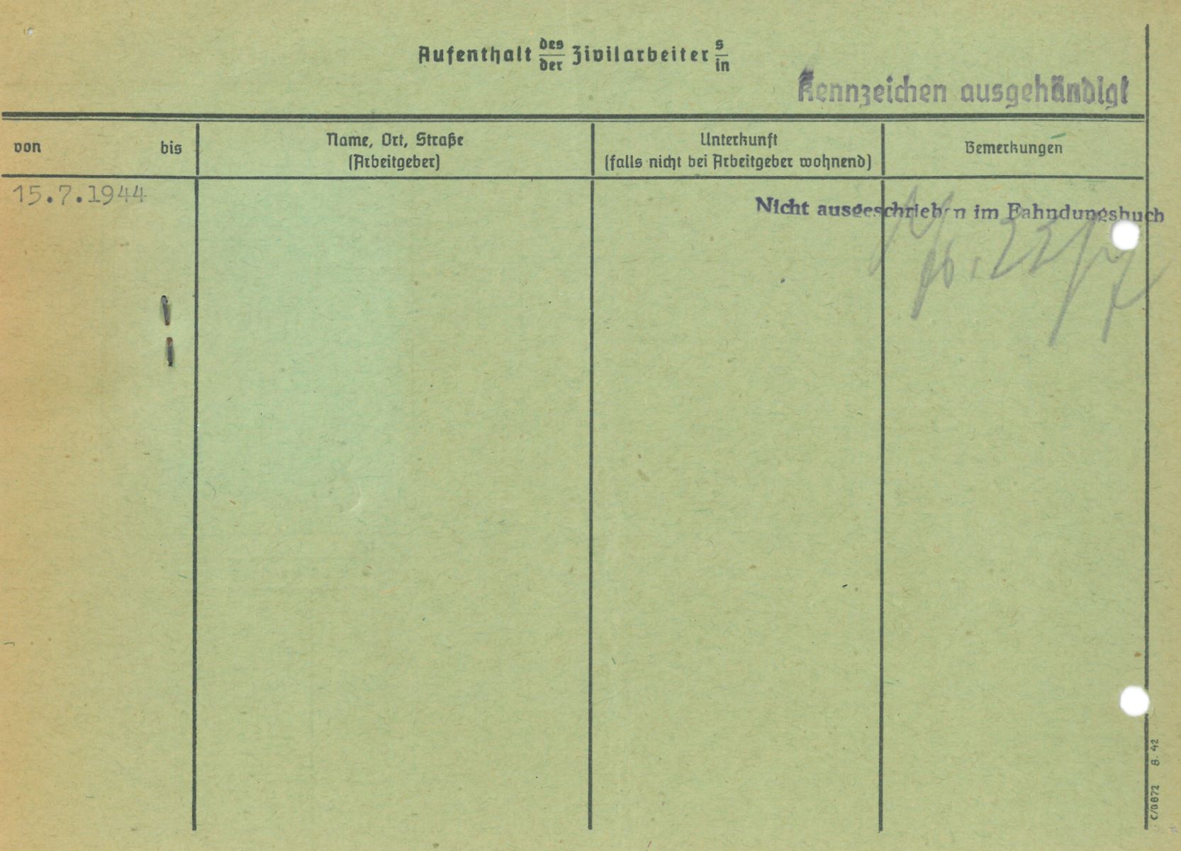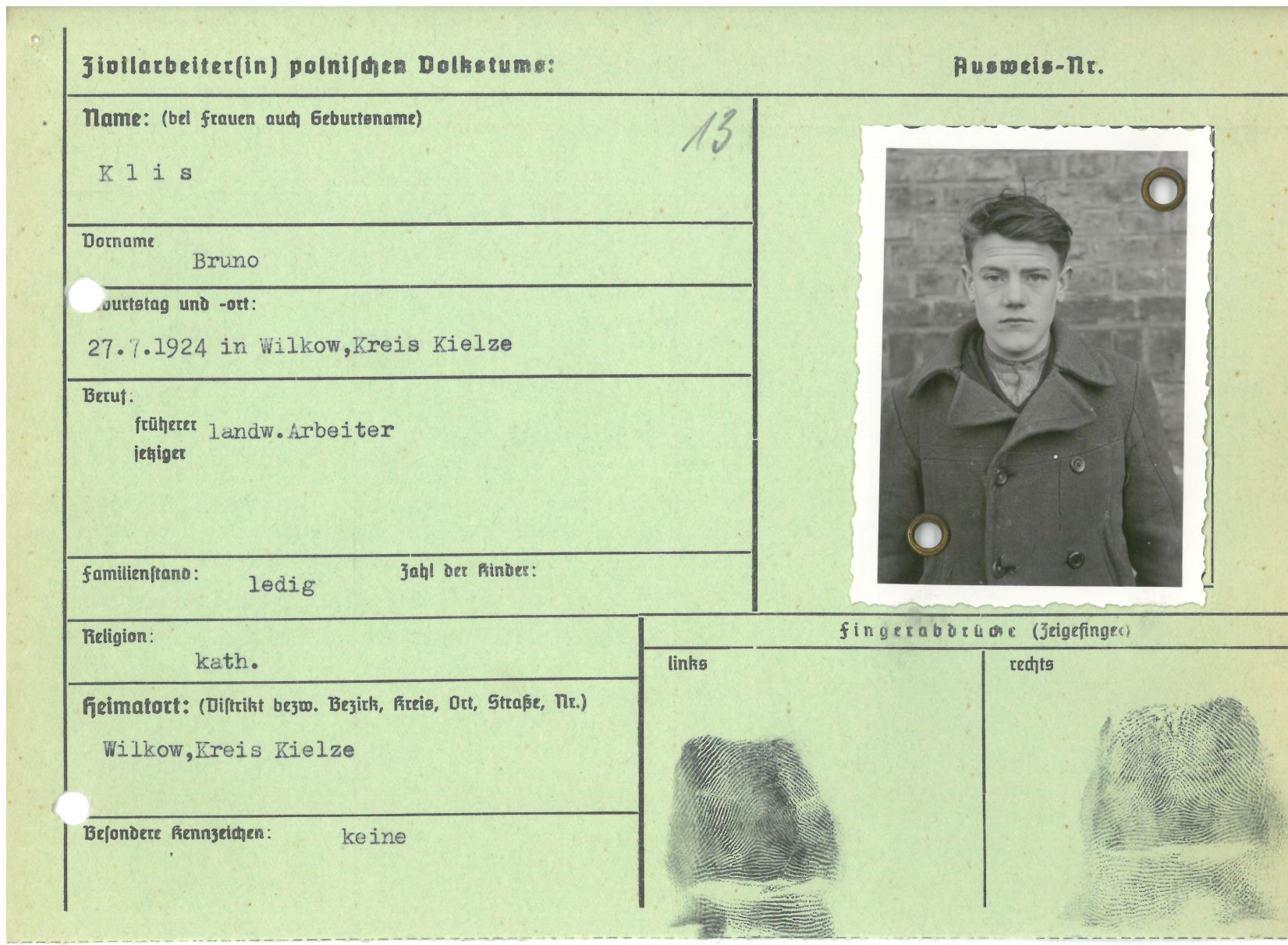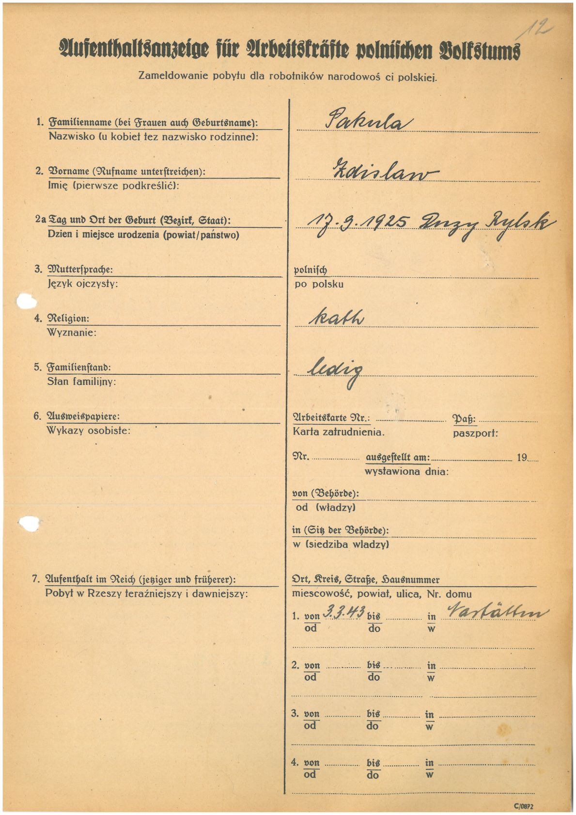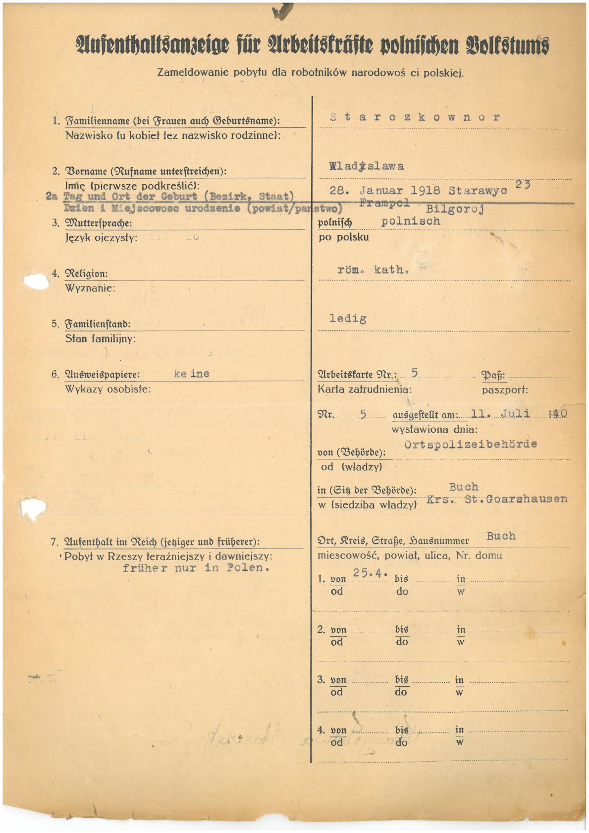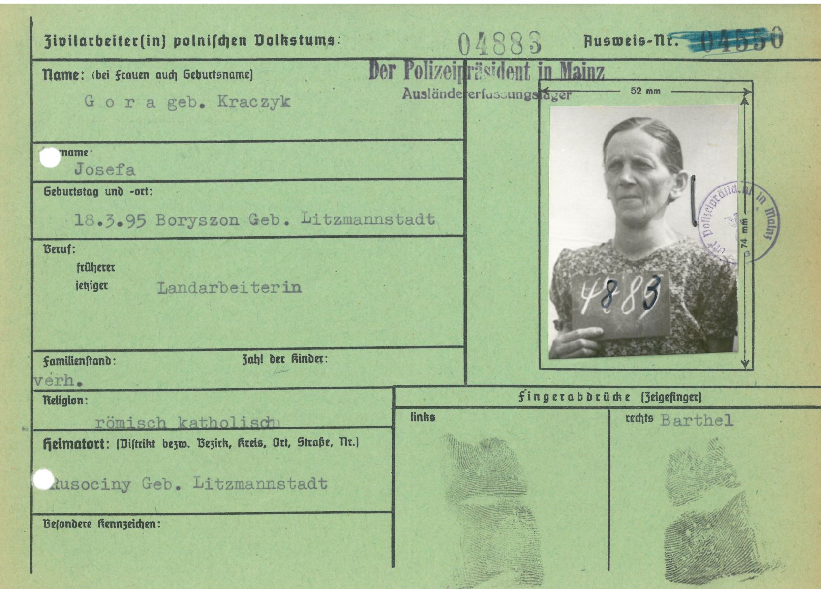 Im Oktober 1939 wurde die Einführung der Arbeitspflicht für Polen zwischen dem 18. und 60. Lebensjahr verordnet. Ab Sommer 1941 wurden die Zwangsarbeitsmaßnahmen auch auf den sowjetisch besetzen Teil Polens übertragen. Mehr und mehr wurden auch Jugendliche und selbst Kinder zur Zwangsarbeit herangezogen. Im Oktober 1940 arbeiteten in der deutschen Landwirtschaft etwa 400.000, in der Industrie rund 140.000 sogenannte Zivilarbeiter aus Polen und Sowjetrussland. Auch in Nastätten wurden Zivilarbeiter überwiegend in der Landwirtschaft eingesetzt. Finden sie Aufenthaltsbescheinigungen und Ausweise der in Nastätten eingesetzten Zivilarbeiter.