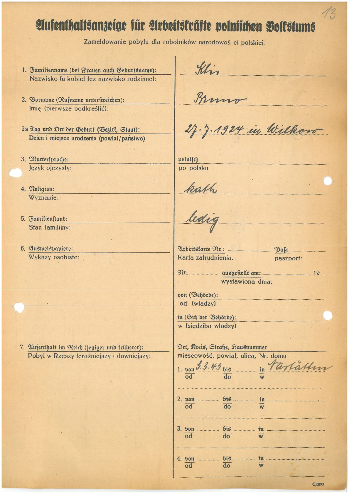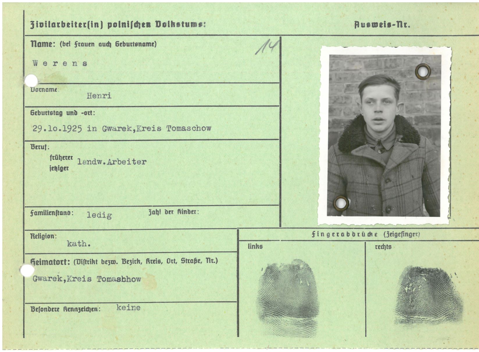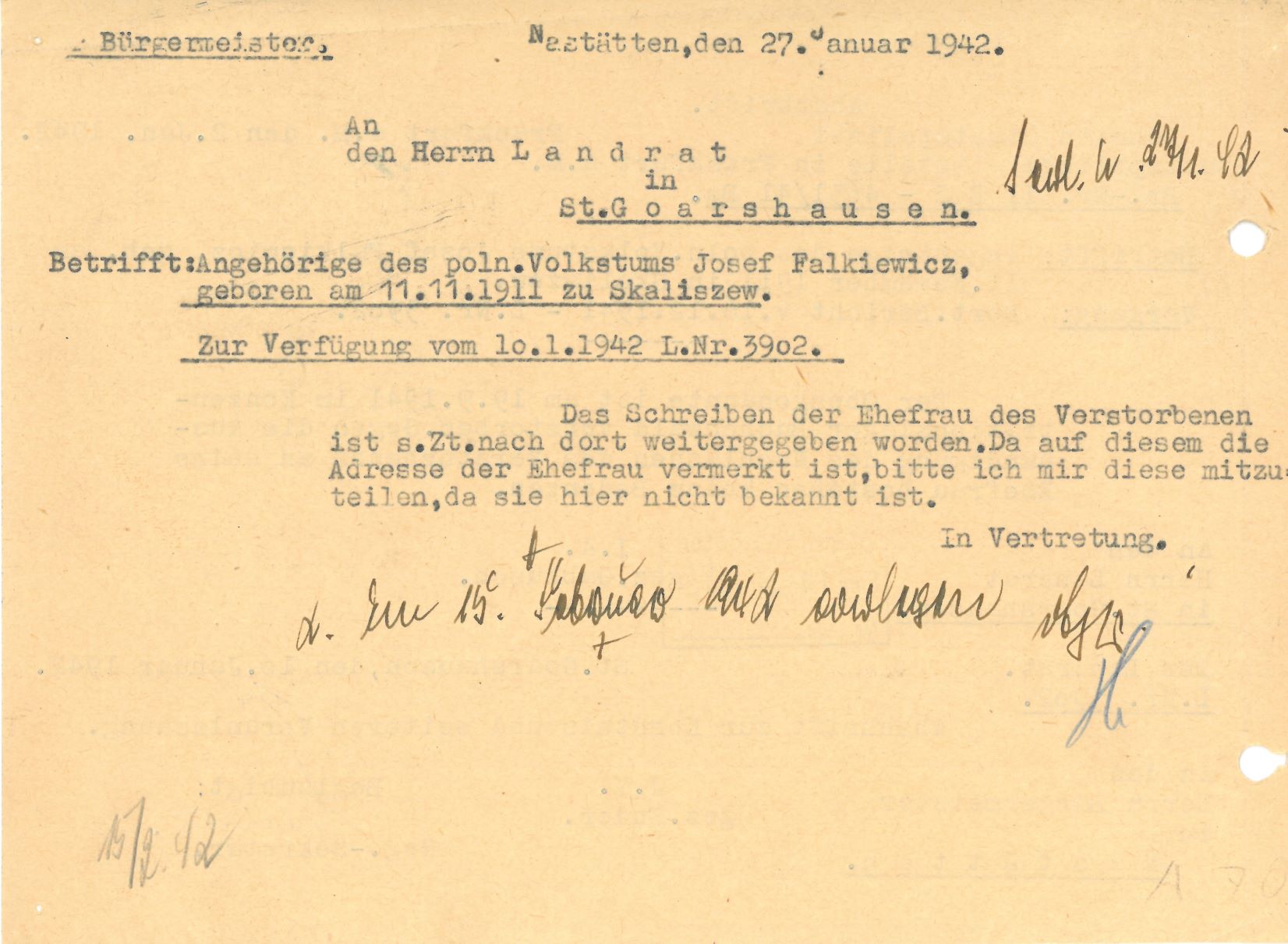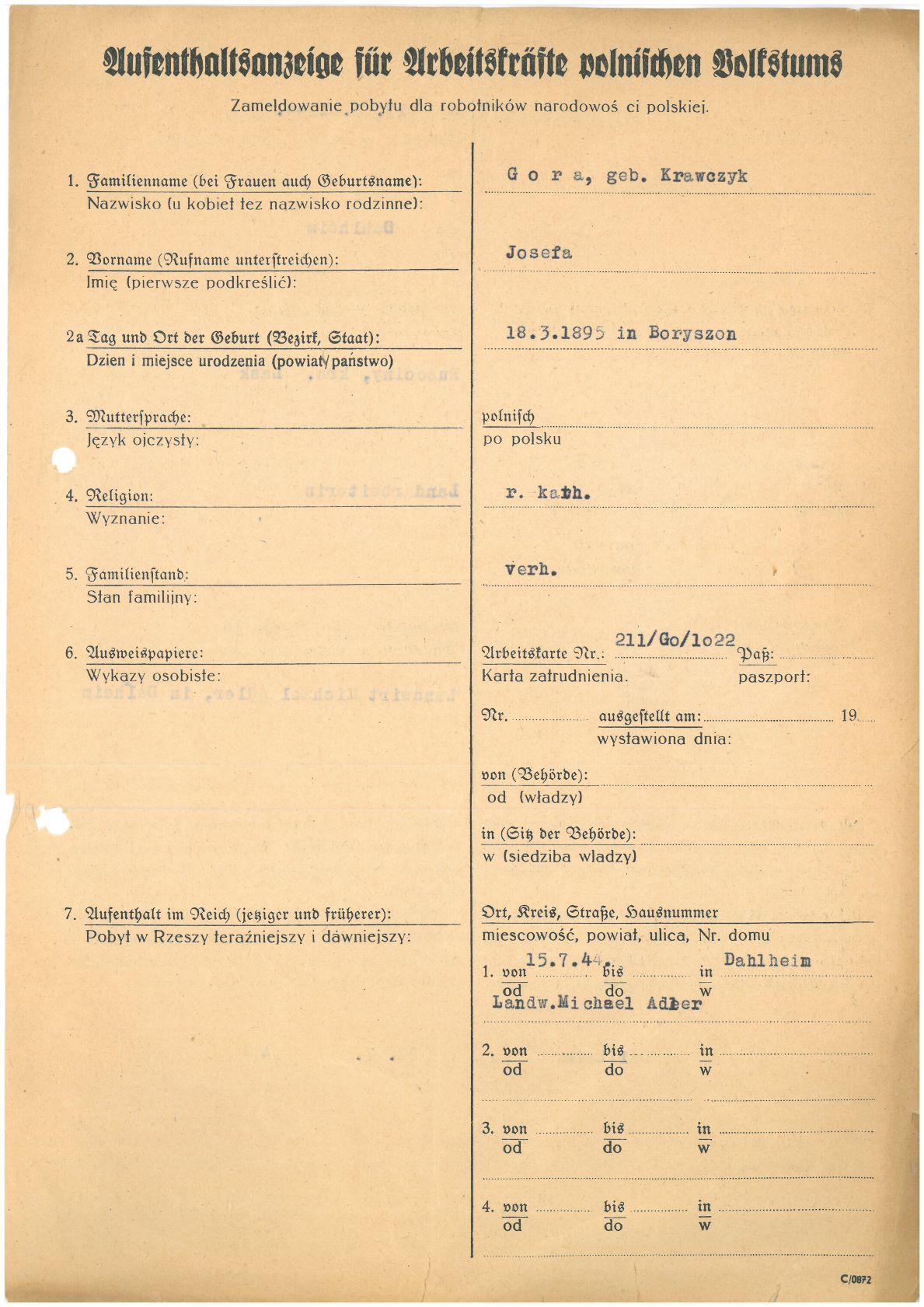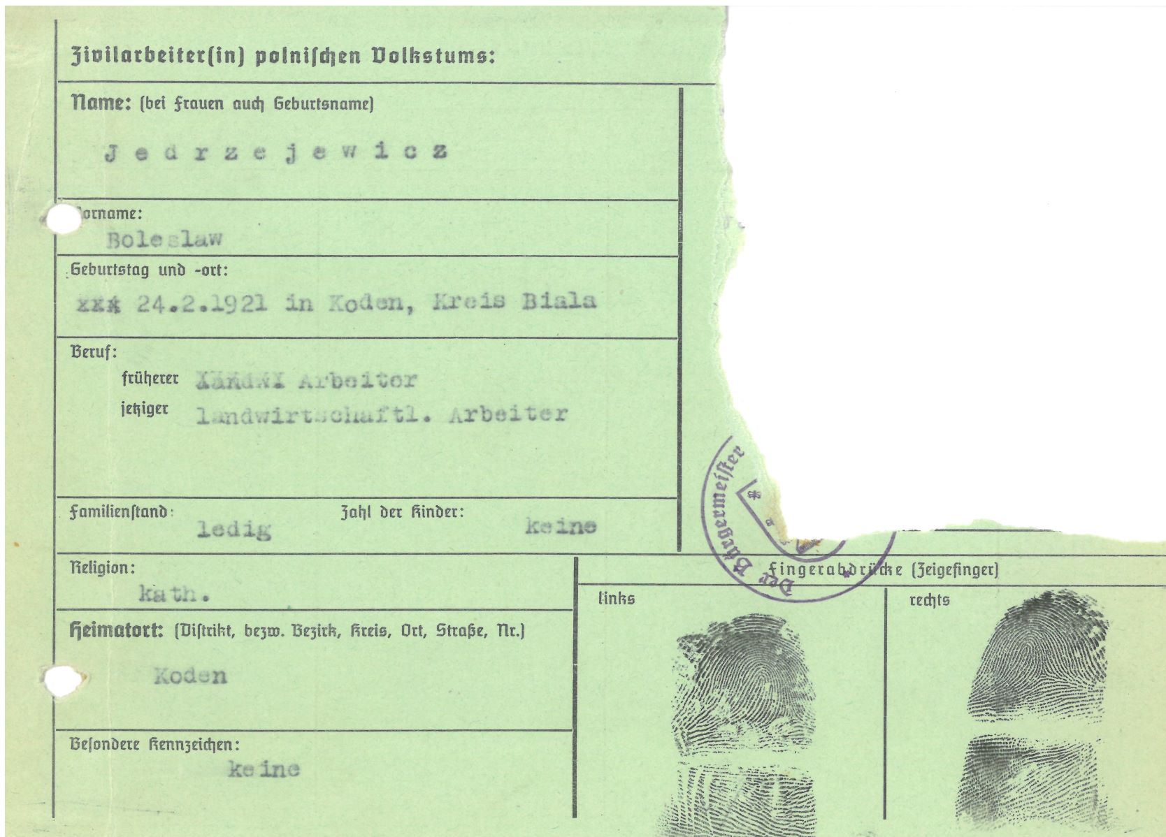 Im Oktober 1939 wurde die Einführung der Arbeitspflicht für Polen zwischen dem 18. und 60. Lebensjahr verordnet. Ab Sommer 1941 wurden die Zwangsarbeitsmaßnahmen auch auf den sowjetisch besetzen Teil Polens übertragen. Mehr und mehr wurden auch Jugendliche und selbst Kinder zur Zwangsarbeit herangezogen. Im Oktober 1940 arbeiteten in der deutschen Landwirtschaft etwa 400.000, in der Industrie rund 140.000 sogenannte Zivilarbeiter aus Polen und Sowjetrussland. Auch in Nastätten wurden Zivilarbeiter überwiegend in der Landwirtschaft eingesetzt. Finden sie Aufenthaltsbescheinigungen und Ausweise der in Nastätten eingesetzten Zivilarbeiter.