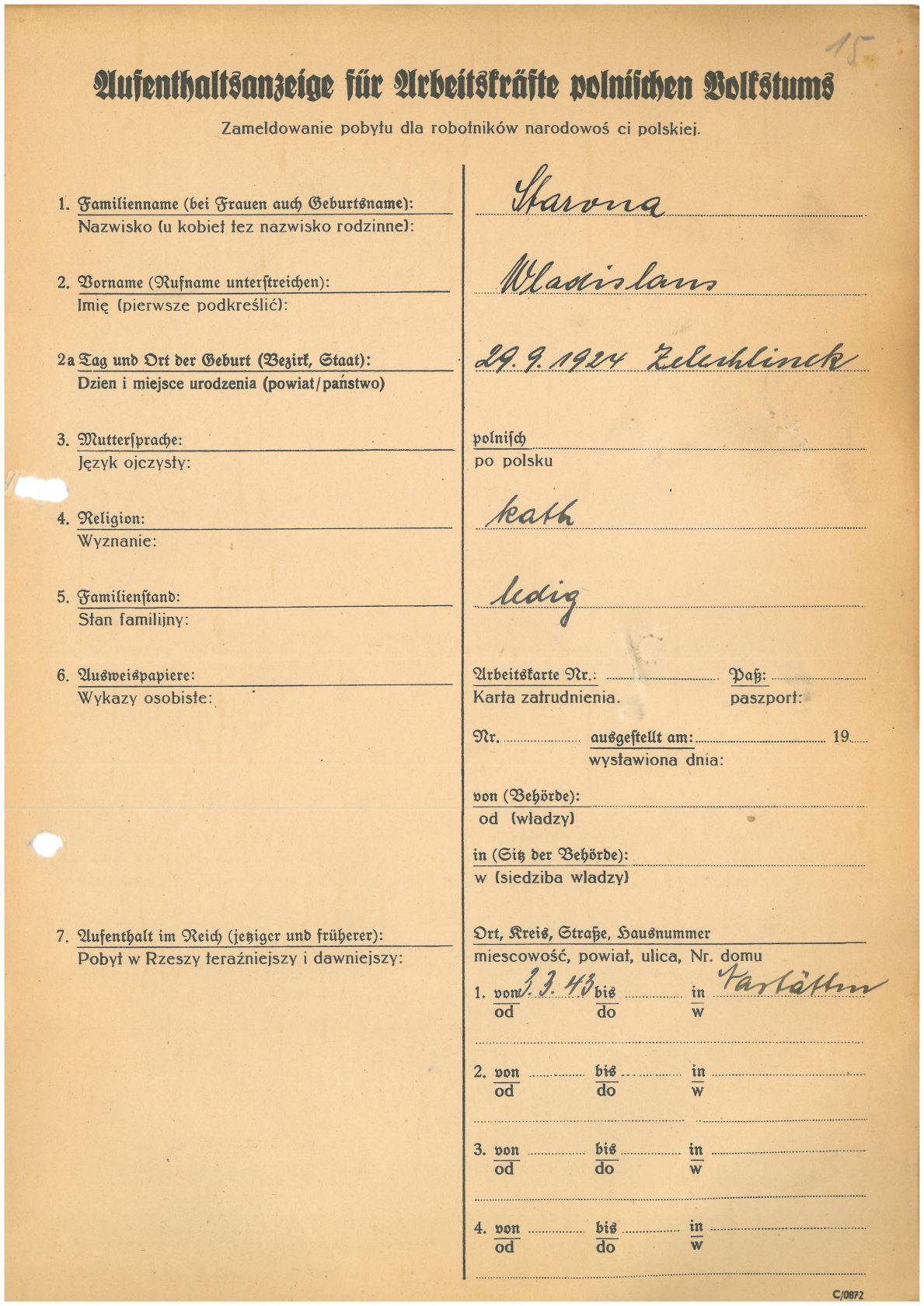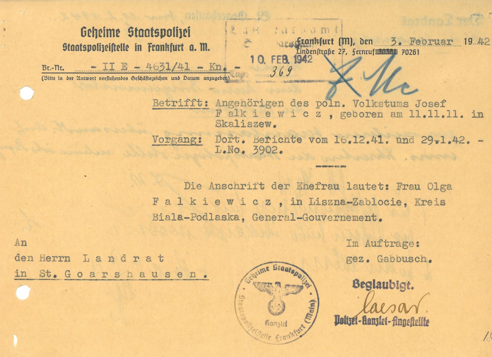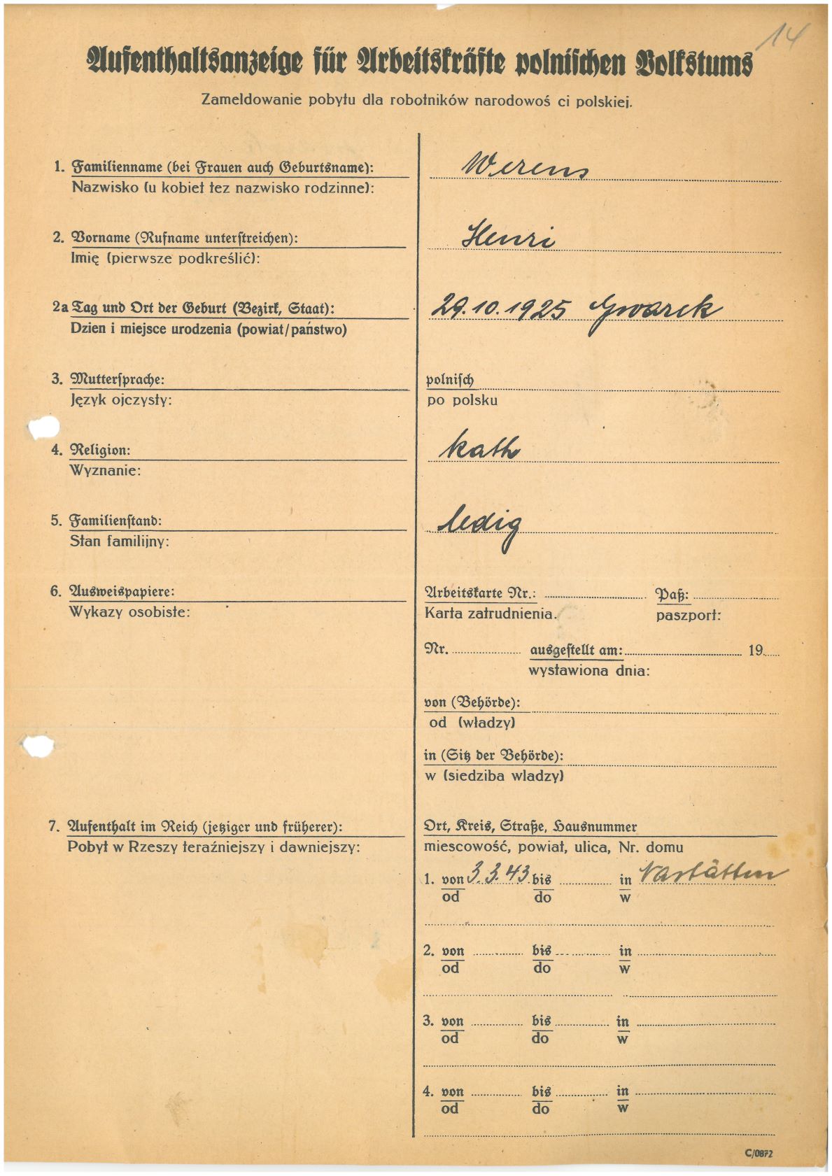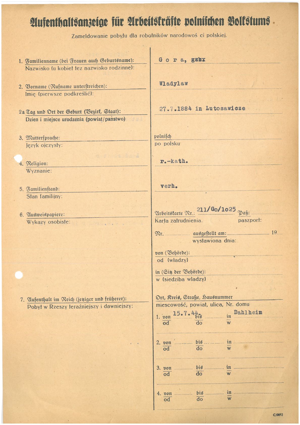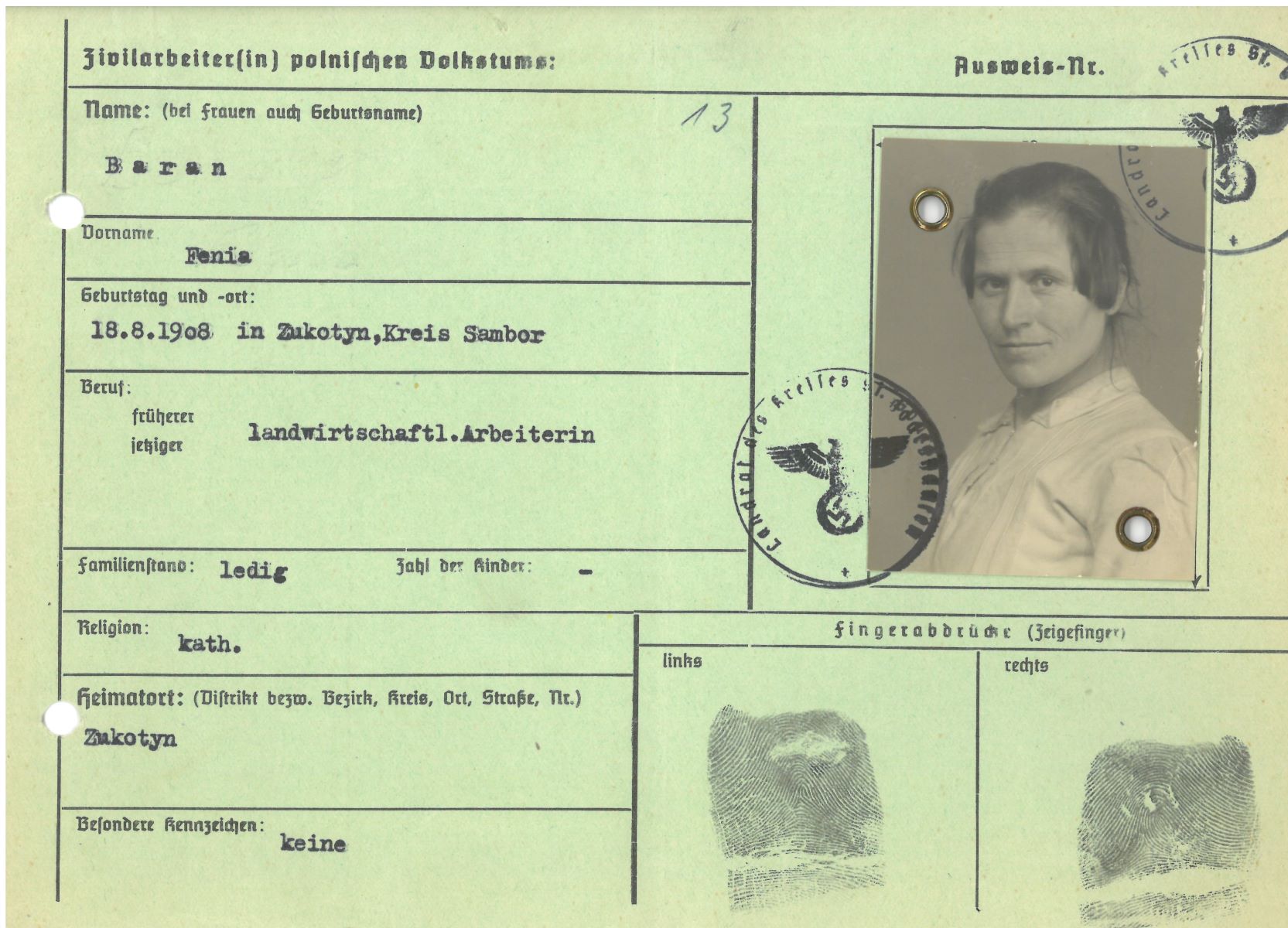 Im Oktober 1939 wurde die Einführung der Arbeitspflicht für Polen zwischen dem 18. und 60. Lebensjahr verordnet. Ab Sommer 1941 wurden die Zwangsarbeitsmaßnahmen auch auf den sowjetisch besetzen Teil Polens übertragen. Mehr und mehr wurden auch Jugendliche und selbst Kinder zur Zwangsarbeit herangezogen. Im Oktober 1940 arbeiteten in der deutschen Landwirtschaft etwa 400.000, in der Industrie rund 140.000 sogenannte Zivilarbeiter aus Polen und Sowjetrussland. Auch in Nastätten wurden Zivilarbeiter überwiegend in der Landwirtschaft eingesetzt. Finden sie Aufenthaltsbescheinigungen und Ausweise der in Nastätten eingesetzten Zivilarbeiter.