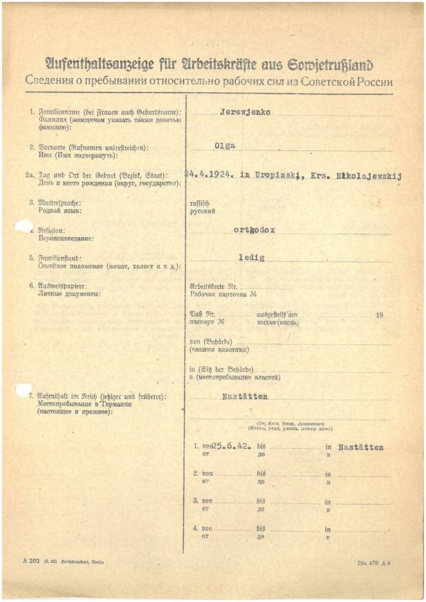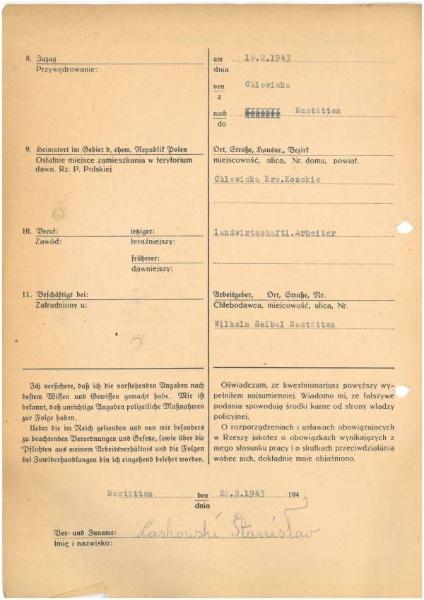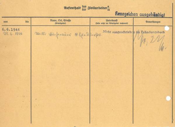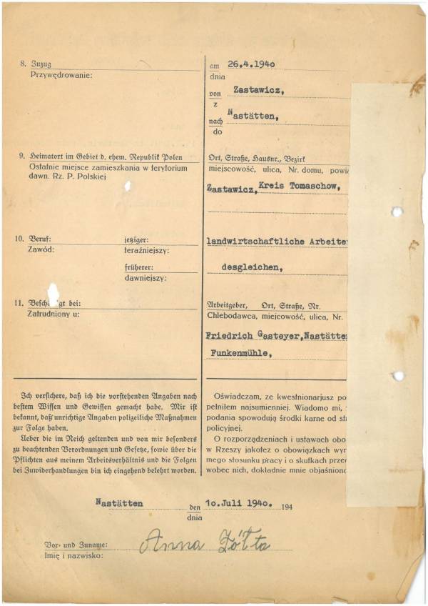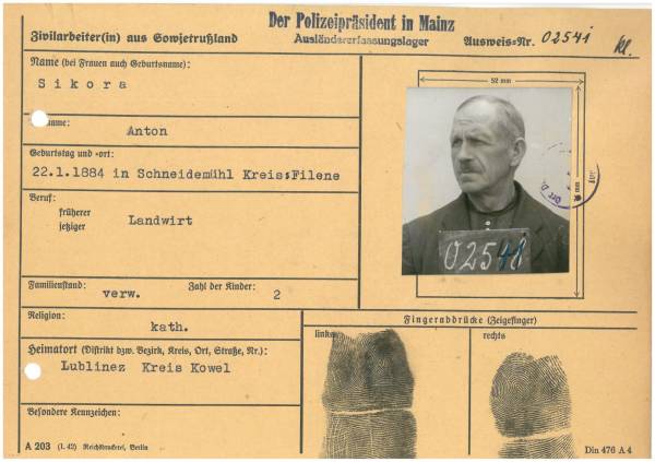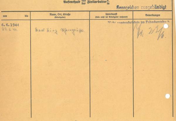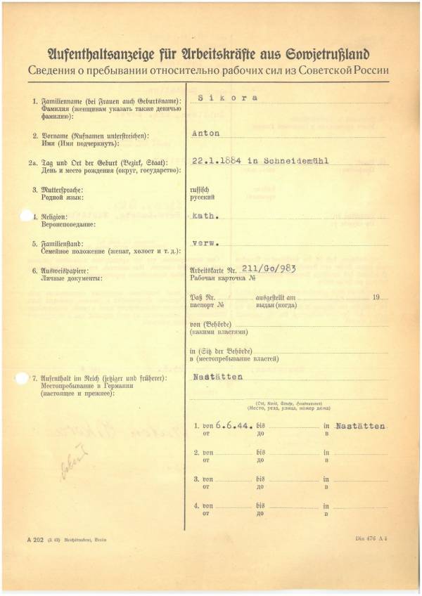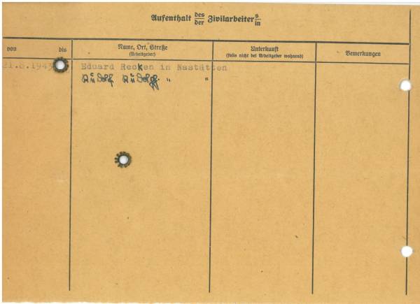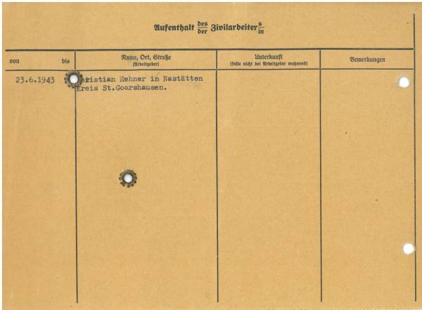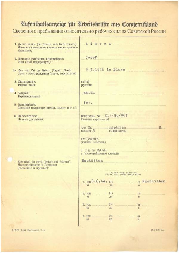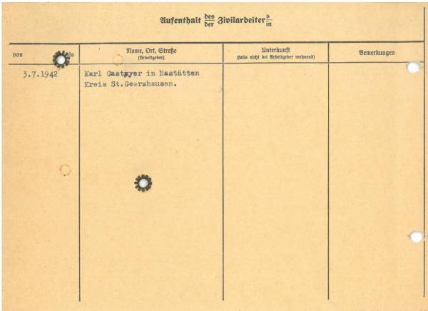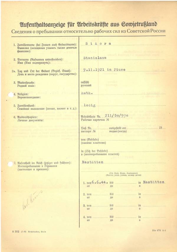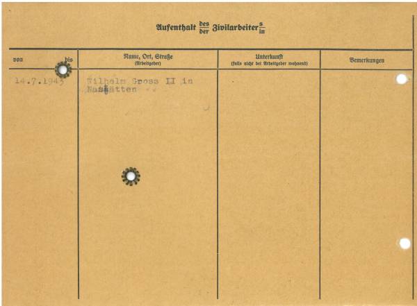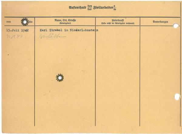 Im Oktober 1939 wurde die Einführung der Arbeitspflicht für Polen zwischen dem 18. und 60. Lebensjahr verordnet. Ab Sommer 1941 wurden die Zwangsarbeitsmaßnahmen auch auf den sowjetisch besetzen Teil Polens übertragen. Mehr und mehr wurden auch Jugendliche und selbst Kinder zur Zwangsarbeit herangezogen. Im Oktober 1940 arbeiteten in der deutschen Landwirtschaft etwa 400.000, in der Industrie rund 140.000 sogenannte Zivilarbeiter aus Polen und Sowjetrussland. Auch in Nastätten wurden Zivilarbeiter überwiegend in der Landwirtschaft eingesetzt. Finden sie Aufenthaltsbescheinigungen und Ausweise der in Nastätten eingesetzten Zivilarbeiter.