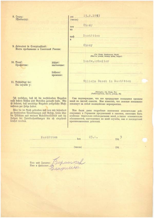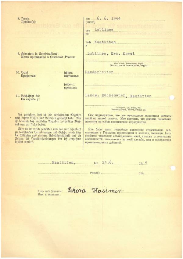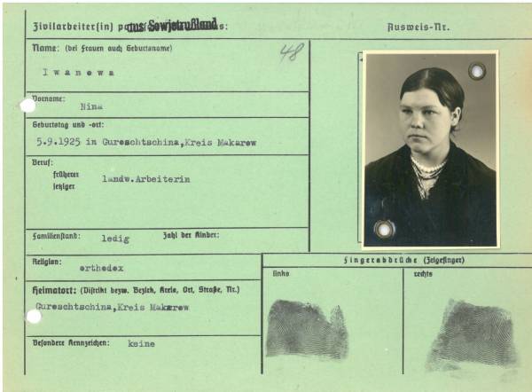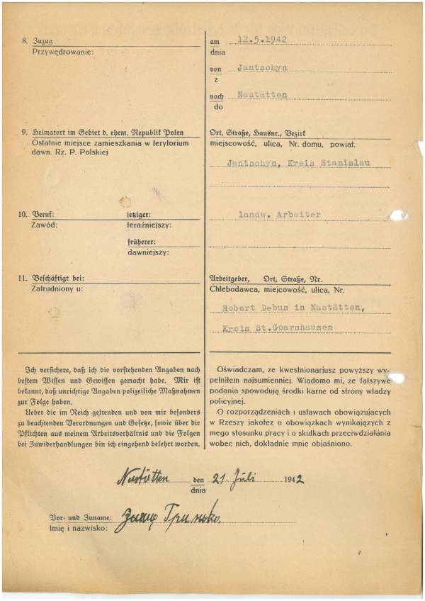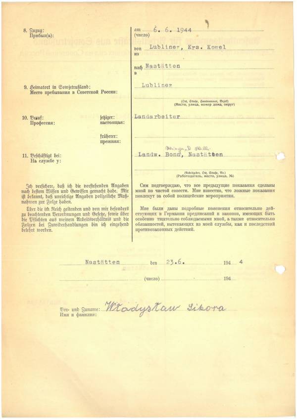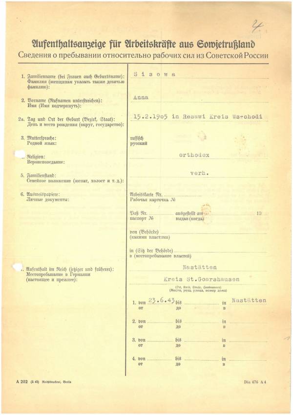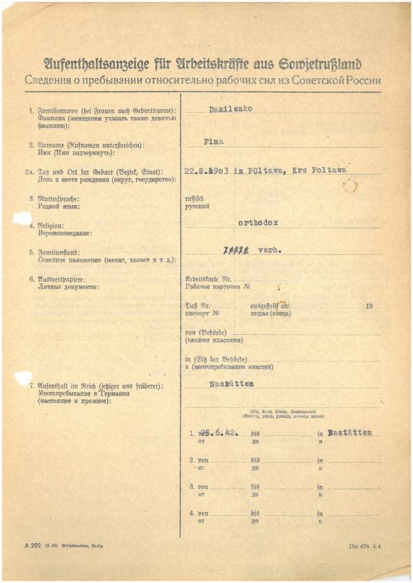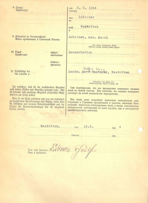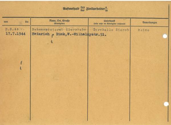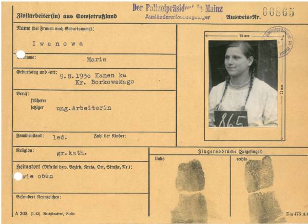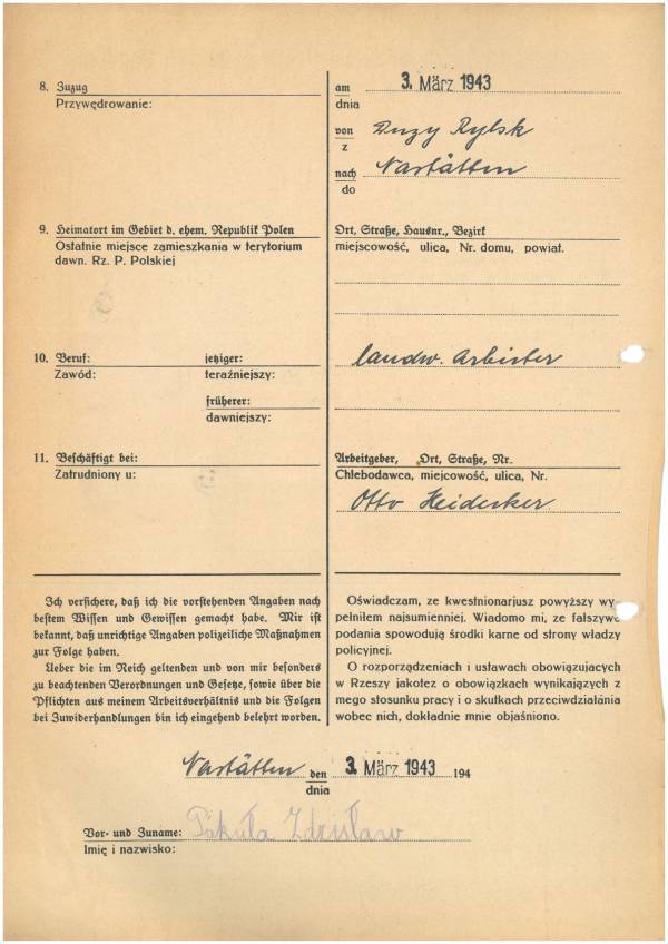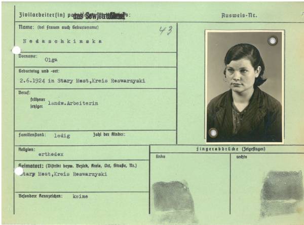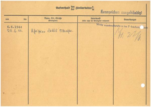 Im Oktober 1939 wurde die Einführung der Arbeitspflicht für Polen zwischen dem 18. und 60. Lebensjahr verordnet. Ab Sommer 1941 wurden die Zwangsarbeitsmaßnahmen auch auf den sowjetisch besetzen Teil Polens übertragen. Mehr und mehr wurden auch Jugendliche und selbst Kinder zur Zwangsarbeit herangezogen. Im Oktober 1940 arbeiteten in der deutschen Landwirtschaft etwa 400.000, in der Industrie rund 140.000 sogenannte Zivilarbeiter aus Polen und Sowjetrussland. Auch in Nastätten wurden Zivilarbeiter überwiegend in der Landwirtschaft eingesetzt. Finden sie Aufenthaltsbescheinigungen und Ausweise der in Nastätten eingesetzten Zivilarbeiter.