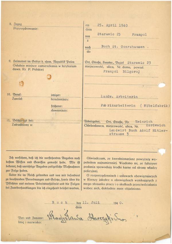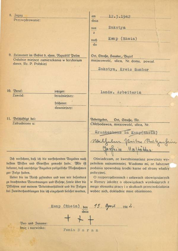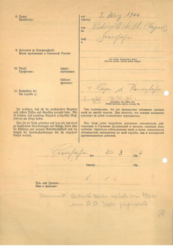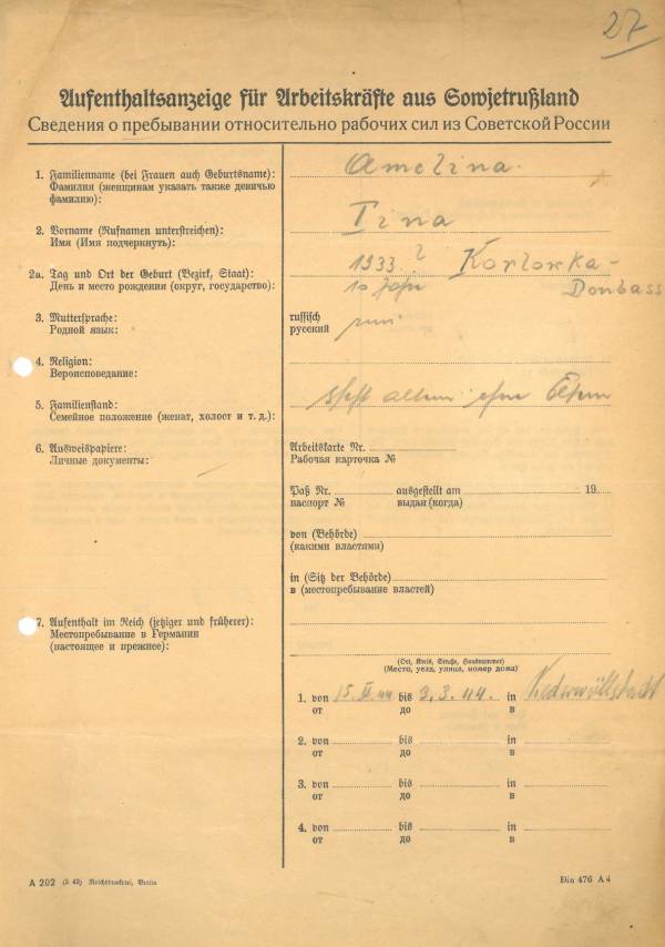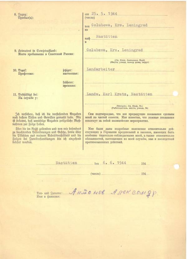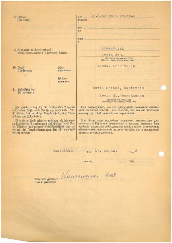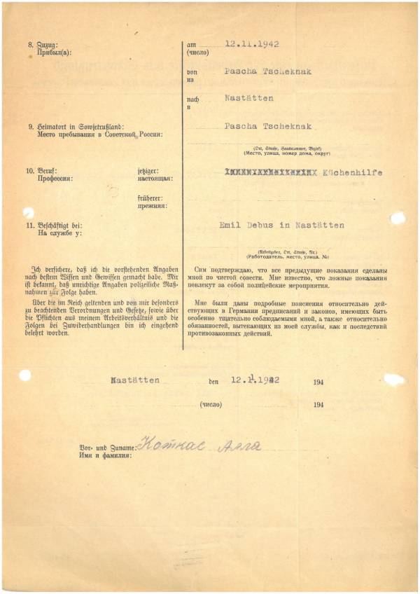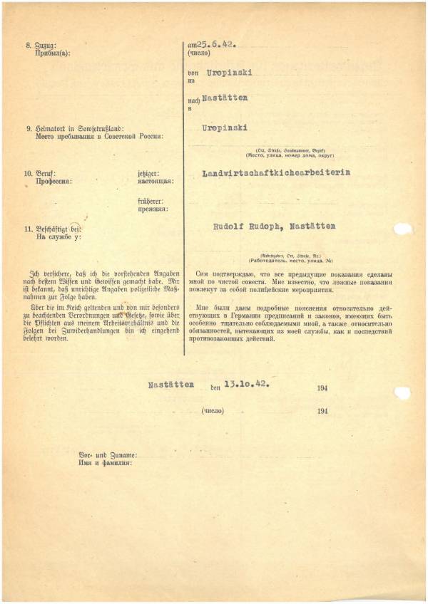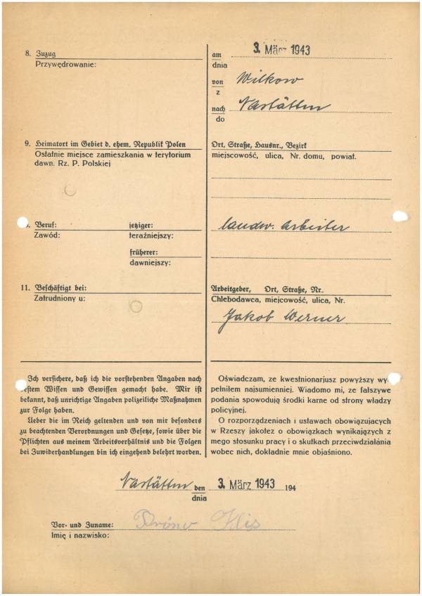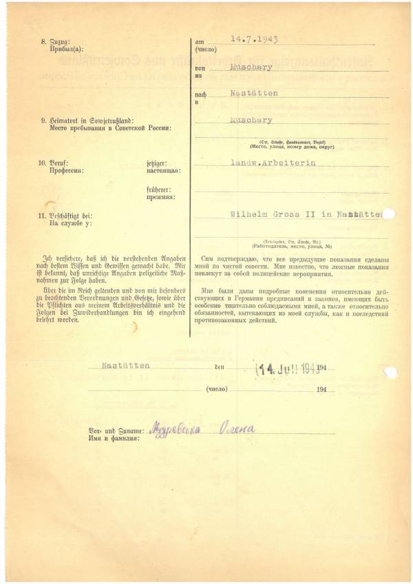 Im Oktober 1939 wurde die Einführung der Arbeitspflicht für Polen zwischen dem 18. und 60. Lebensjahr verordnet. Ab Sommer 1941 wurden die Zwangsarbeitsmaßnahmen auch auf den sowjetisch besetzen Teil Polens übertragen. Mehr und mehr wurden auch Jugendliche und selbst Kinder zur Zwangsarbeit herangezogen. Im Oktober 1940 arbeiteten in der deutschen Landwirtschaft etwa 400.000, in der Industrie rund 140.000 sogenannte Zivilarbeiter aus Polen und Sowjetrussland. Auch in Nastätten wurden Zivilarbeiter überwiegend in der Landwirtschaft eingesetzt. Finden sie Aufenthaltsbescheinigungen und Ausweise der in Nastätten eingesetzten Zivilarbeiter.