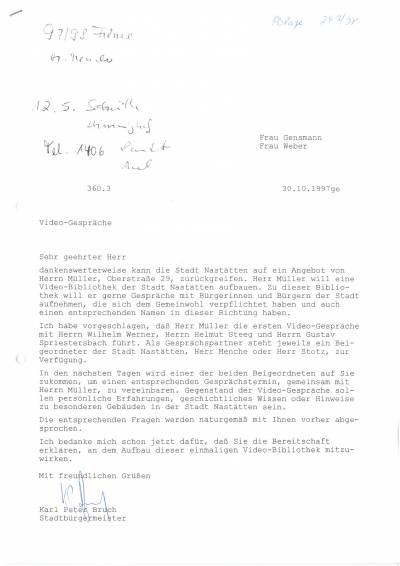 Im Rahmen der Archivierung von Unterlagen der Stadtverwaltung aus den 1990er Jahren ist das Stadtarchiv auf ein Schreiben aus 1997 vom damaligen Stadtbürgermeister Karl Peter Bruch mit dem Titel „Video-Gespräche“ gestoßen.