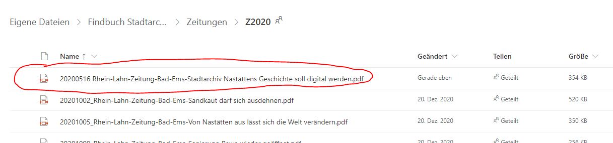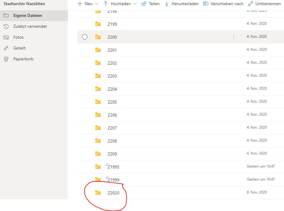 Unsere Archivdatenbank öffnet sich. In unserem Beispiel im Hauptordner Zeitungen. Scrollen sie zum Ordner Z2020 und öffnen diesen.
