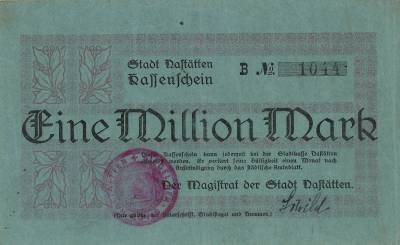 Auf Basis einer kleinen Spende wurde dem Stadtarchiv aus dem Fachhandel das Original eines Kassenscheins erworben, den der Magistrat der Stadt Nastätten über den Wert von einer Million Mark 1923 ausgestellt hatte (siehe auch Blaues Ländchen Aktuell KW29-1922)