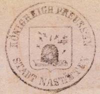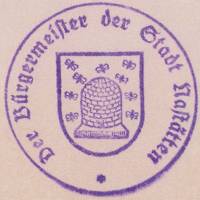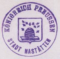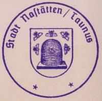 Bienenkorb und Bienen: Das Wappen der Stadt Nastätten ist einzigartig. Aber warum hat man ausgerechnet die Biene als Wappentier gewählt? Mit seinen vielen Bienenstöcken war das Amt Nastätten damals im Herzogtum Nassau die Nummer 1 in der Honigproduktion. Ein sehr großer wirtschaftlicher Vorteil. Zu der Zeit war Zucker ein Luxusgut, es wurde mit Honig gesüßt. Die vielen Bienen auf dem Entwurf des Stadtwappens von Geometer (Landvermesser) Friedrich Becher aus Braubach von 1864 könnten diese Vermutung bestätigen. Oder sollten etwa die vielen anfliegenden Bienen ein Symbol für den Bienenfleiß der Bürger und Handwerker sein? Das Wappen hat keinen nachweisbaren historischen Hintergrund. Es ist wahrscheinlich erst nach der Eingliederung des Herzogtums Nassau in das Königreich Preußen, also nach 1866, von den damaligen Stadtvätern eingeführt worden. Auf dem ersten bekannten Stadtsiegel sind 10 Bienen im Anflug auf den Bienenstock. 1908 wurde auf Anregung des Königlichen Staatsarchivs in Wiesbaden das frei erfundene Stadtwappen umgestaltet. Das Wappenfeld erhielt die heraldisch richtigen Farben: Der Schild blau, der Korb gelb und die Bienen goldfarben. Die Anzahl der Bienen wurde auf 9 reduziert und die Bienen symmetrisch um den Bienenkorb angeordnet. 1957 wurde das Stadtwappen erneut geordnet bzw. modernisiert. Seitdem sind nur noch 5 Bienen im Anflug.