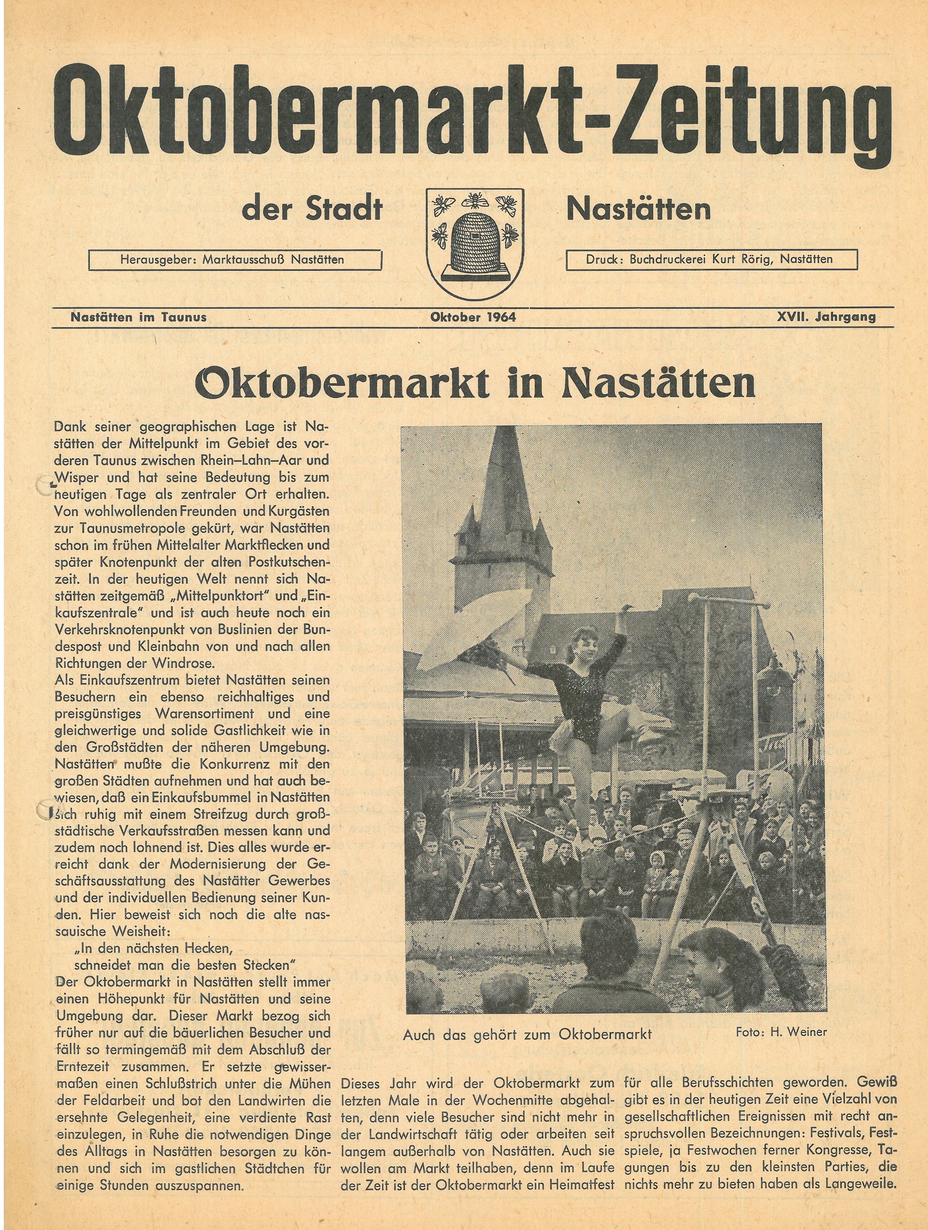 Oktobermarkt in Nastätten Dank seiner geographischen Lage ist Nastätten der Mittelpunkt im Gebiet des vorderen Taunus zwischen Rhein-Lahn-Aar und Wisper und hat seine Bedeutung bis zum heutigen Tage als zentraler Ort erhalten. Von wohlwollenden Freunden und Kurgästen zur Taunusmetropole gekürt, war Nastätten schon im frühen Mittelalter Marktflecken und später Knotenpunkt der alten Postkutschenzeit. In der heutigen Welt nennt sich Nastätten zeitgemäß „Mittelpunktort” und „Einkaufszentrale“ und ist auch heute noch ein Verkehrsknotenpunkt von Buslinien der Bundespost und Kleinbahn von und nach allen Richtungen der Windrose. Als Einkaufszentrum bietet Nastätten seinen Besuchern ein ebenso reichhaltiges und preisgünstiges Warensortiment und eine gleichwertige und solide Gastlichkeit wie in den Großstädten der näheren Umgebung. ‚Nastätten’ musste die Konkurrenz mit den großen Städten aufnehmen und hat auch bewiesen, dass ein Einkaufsbummel in Nastätten sich ruhig mit einem Streifzug durch großstädtische Verkaufsstraßen. messen kann und zudem noch lohnend ist. Dies alles wurde erreicht dank der Modernisierung der Geschäftsausstattung des Nastätter Gewerbes und der individuellen Bedienung seiner Kunden. Hier beweist sich noch die alte nassauische Weisheit: „In den nächsten Hecken, schneidet man die besten Stecken” Der Oktobermarkt in Nastätten stellt immer einen Höhepunkt für. Nastätten und seine Umgebung dar. Dieser Markt bezog sich früher nur auf die bäuerlichen Besucher und fällt so termingemäß mit dem Abschluss der Erntezeit zusammen. Er setzte einen Schlussstrich unter die Mühen der Feldarbeit und bot den Landwirten die ersehnte Gelegenheit, eine verdiente Rast einzulegen, in Ruhe die notwendigen Dinge des Alltags in Nastätten besorgen zu können und sich im gastlichen Städtchen für einige Stunden auszuspannen. Dieses Jahr wird der Oktobermarkt zum letzten Male in der Wochenmitte abgehalten, denn viele Besucher sind nicht mehr in der Landwirtschaft tätig oder arbeiten seit langem außerhalb von Nastätten. Auch sie wollen am Markt teilhaben, denn im Laufe der Zeit ist der Oktobermarkt ein Heimatfest für alle Berufsschichten geworden. Gewiss gibt es in der heutigen Zeit eine Vielzahl von gesellschaftlichen Ereignissen mit recht anspruchsvollen Bezeichnungen: Festivals, Festspiele, ja Festwochen ferner Kongresse, Tagungen bis zu den kleinsten Parties, die nichts mehr zu bieten haben als Langeweile.