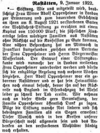 Nastätten, 9. Januar 1922 - Stiftung. Wie und mitgeteilt wird, beabsichtigt Frau Witwe Adolf Oppenheimer in London zur Erinnerung und zum dauernden Gedächtnis an ihren am 8. August 1921 verstorbenen Gatten eine Wohlfahrts-Stiftung zu errichten, mit einem Kapital von 150.000 Mark; die jährlichen Zinserträge sollen würdigen Familien aus Nastätten ohne Rücksicht auf die Konfektion zu Gute kommen. Eine nähere Besprechung hat am Mittwoch in Frankfurt stattgefunden, zwischen einem Vertreter der Frau Oppenheimer und Herrn Bürgermeister Wasserloos. Der Entwurf einer Stiftungsurkunde wird nunmehr der in London weilenden Frau Oppenheimer unterbreitet werden und dürfte sich der endgültige Regelung noch mehrere Wochen hinziehen, Herr Adolf Oppenheimer war ein geborener Nastättener und er hat sein Heimatstädtchen noch einmal besucht, bevor ihn auf der Rückreise nach England im Eisenbahnzug bei Wesel leider zu schnell der Tod ereilte. Wir nehmen auch an dieser Stelle gern Veranlassung, der Familie Oppenheimer öffentlich Dank zu sagen. Möge die Stiftung manche Not lindern und sich bedrängten Familien als ein Segen erweisen! Dieser Wunsch wird in den Kreisen unserer Bürgerschaft wohl allgemein sein und das Andenken an den verstorbenen Wohltäter ständig wach erhalten.